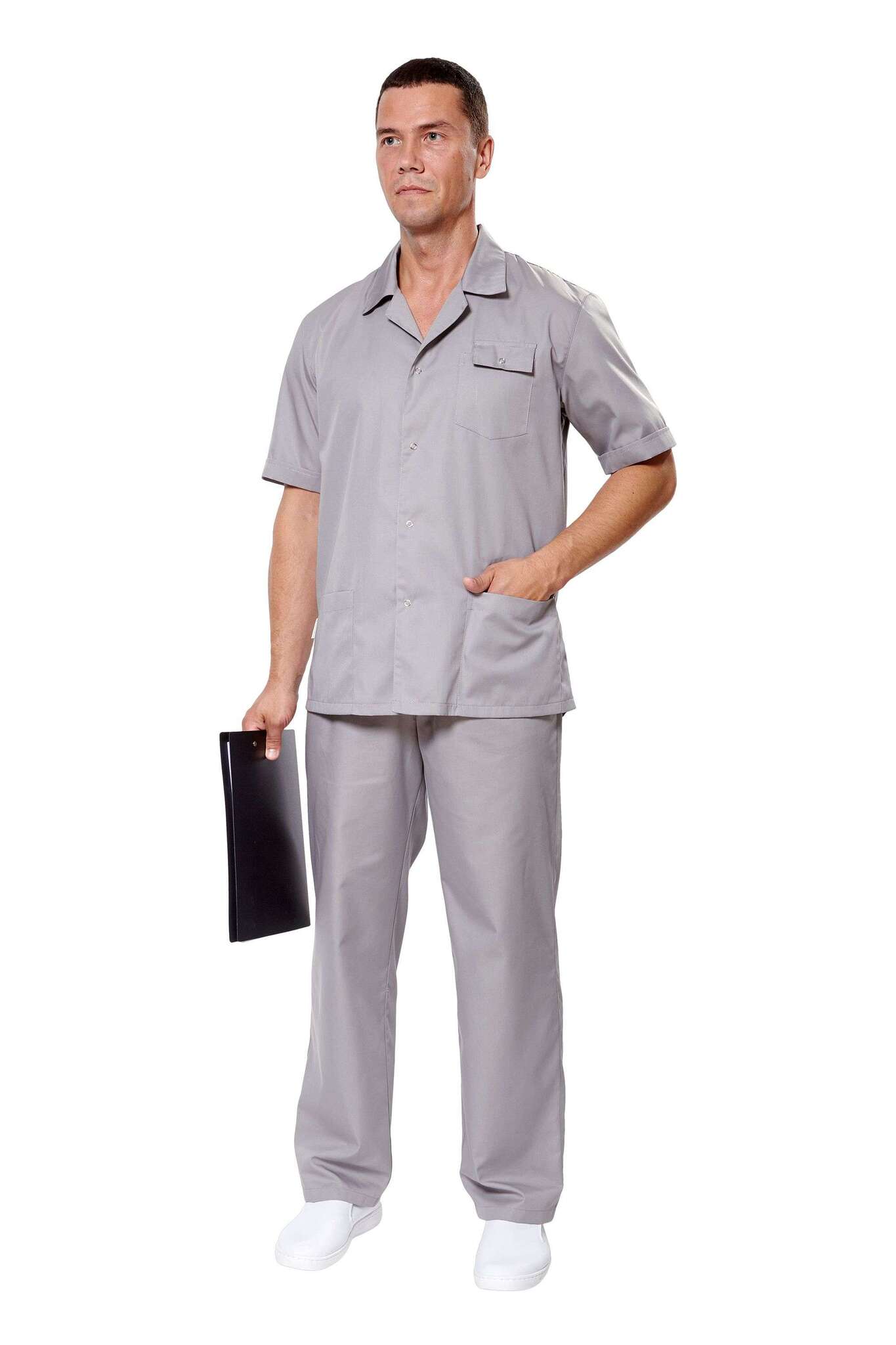 Куртка мужская 'Крокус 2' в сером цвете – это не просто элемент рабочей одежды, а надежный помощник для сотрудников вашего предприятия. Благодаря прямому силуэту и коротким рукавам, данная куртка обеспечивает комфорт и свободу движений, что особенно важно для активной работы. Центральная застежка на кнопки и отложной воротник придают изделию стильный и аккуратный вид.