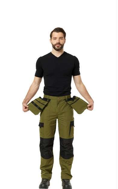 - Карманы: множество карманов, включая верхние накладные, боковые с клапанами и задние накладные, позволяют удобно разместить инструменты и мелочи.