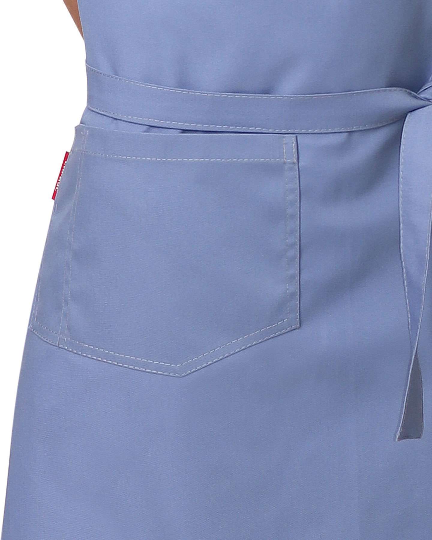 Фартук оснащен боковыми завязками для регулировки объема, а также съемной шейной бретелью, пристегивающейся на кнопки, что обеспечивает дополнительный комфорт в процессе работы. Накладной карман на нижней левой части позволяет удобно хранить необходимые мелочи, а шлевка на правой стороне фартука добавляет функциональности.