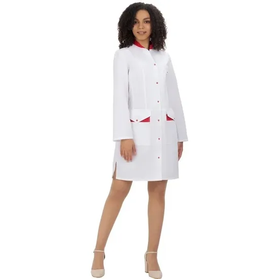 - Дизайн: Халат имеет центральную застежку на кнопки, отрезную баску на полочке, нагрудный и боковые карманы с клапанами, что делает его не только стильным, но и практичным.