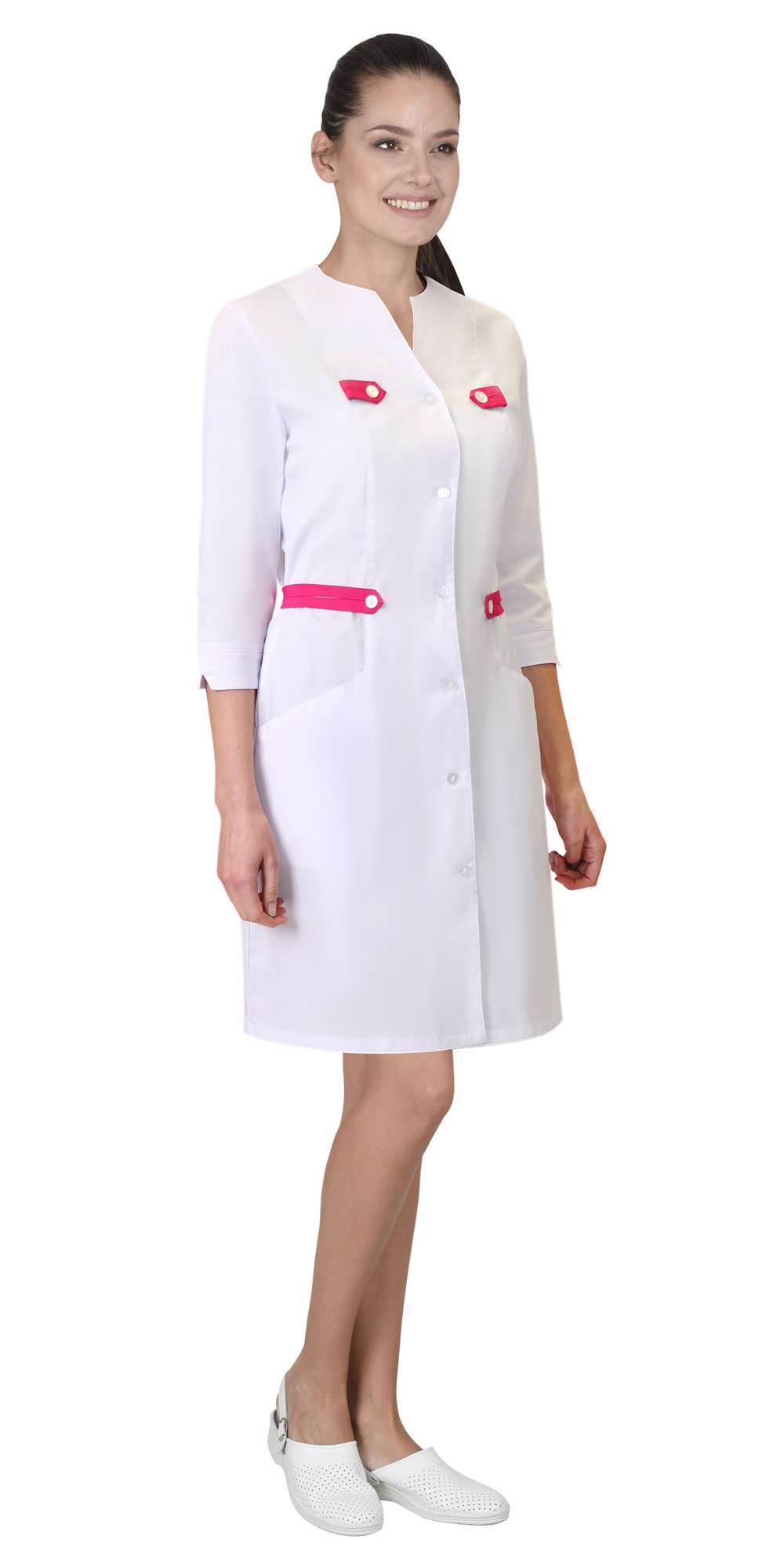 Представляем вам женский халат СИРИУС-БРАЙТЛИ белого цвета с фуксией — идеальный выбор для предприятий и заводов, стремящихся обеспечить своим сотрудникам комфорт и стиль. Этот халат сочетает в себе функциональность и современный дизайн, что делает его отличным дополнением к рабочей униформе. Полуприлегающий силуэт и центральная застежка на пуговицы обеспечивают удобство в носке, а фигурный вырез горловины добавляет элегантности.