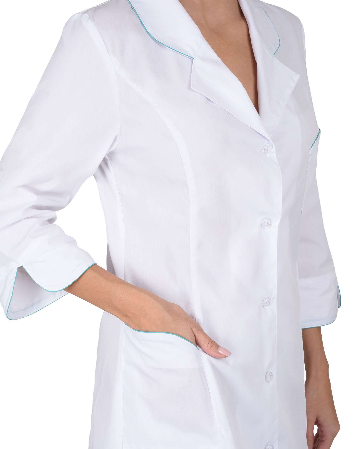 Халат СИРИУС-ЖАСМИН женский белый со светло-бирюзовым — это идеальное сочетание стиля, комфорта и функциональности. Изготовленный из высококачественной смесовой ткани с водоотталкивающей пропиткой, этот халат обеспечивает надежную защиту и легкость в уходе. Центральная застежка на пуговицы и фигурные карманы делают его практичным и удобным для повседневного использования в медицинской сфере.