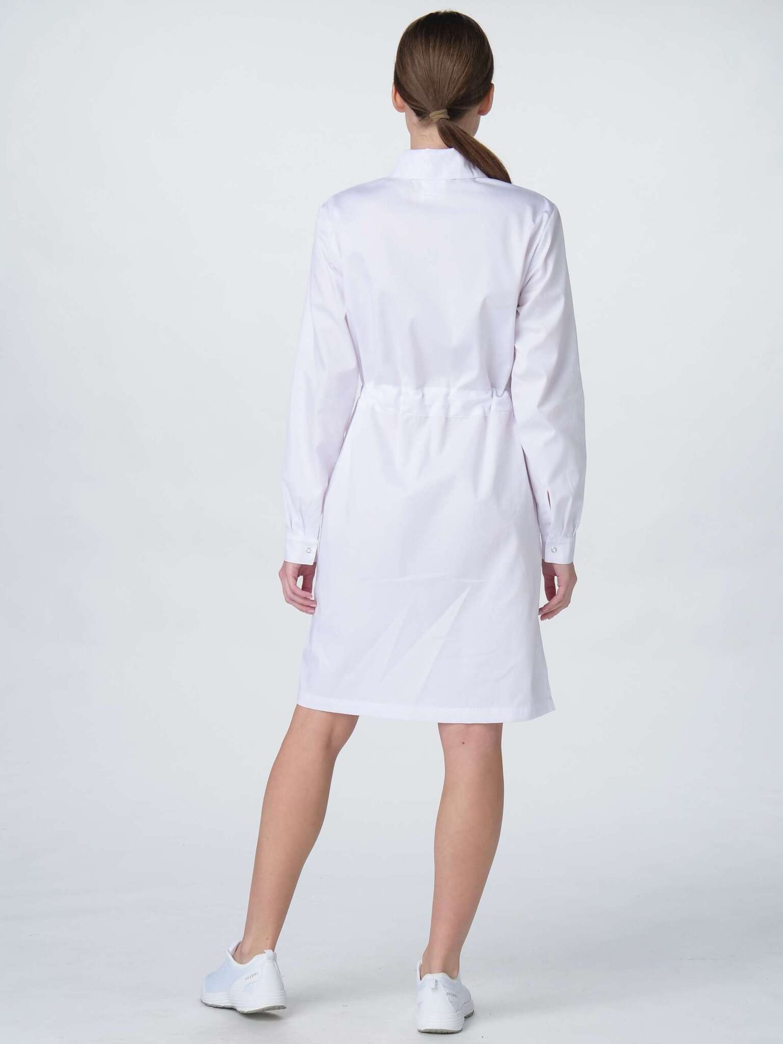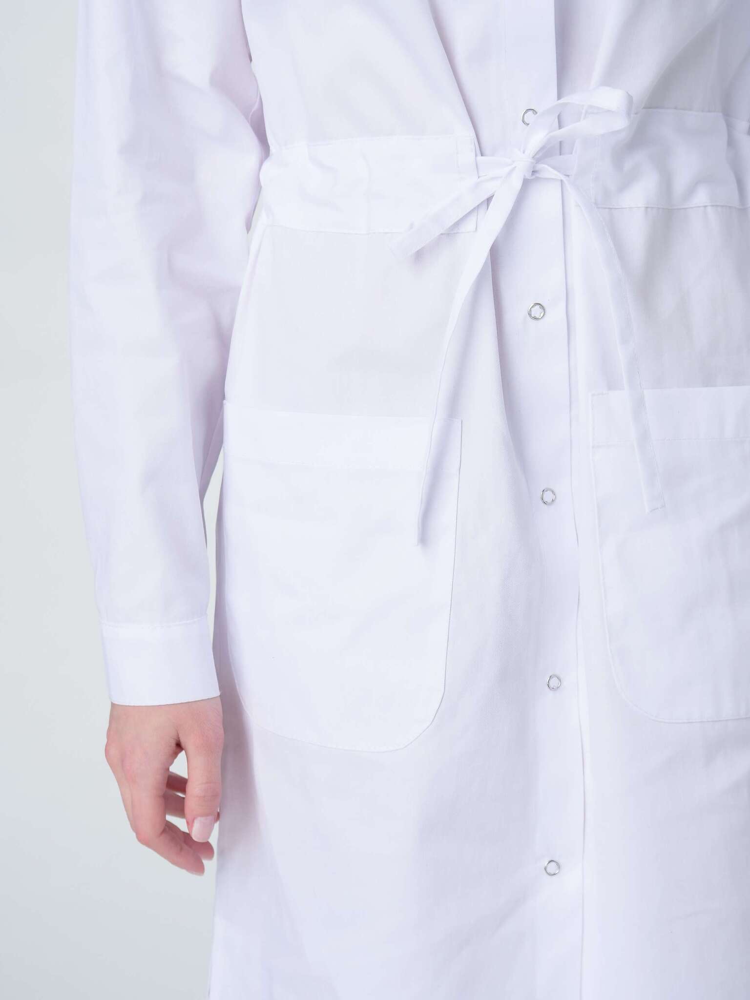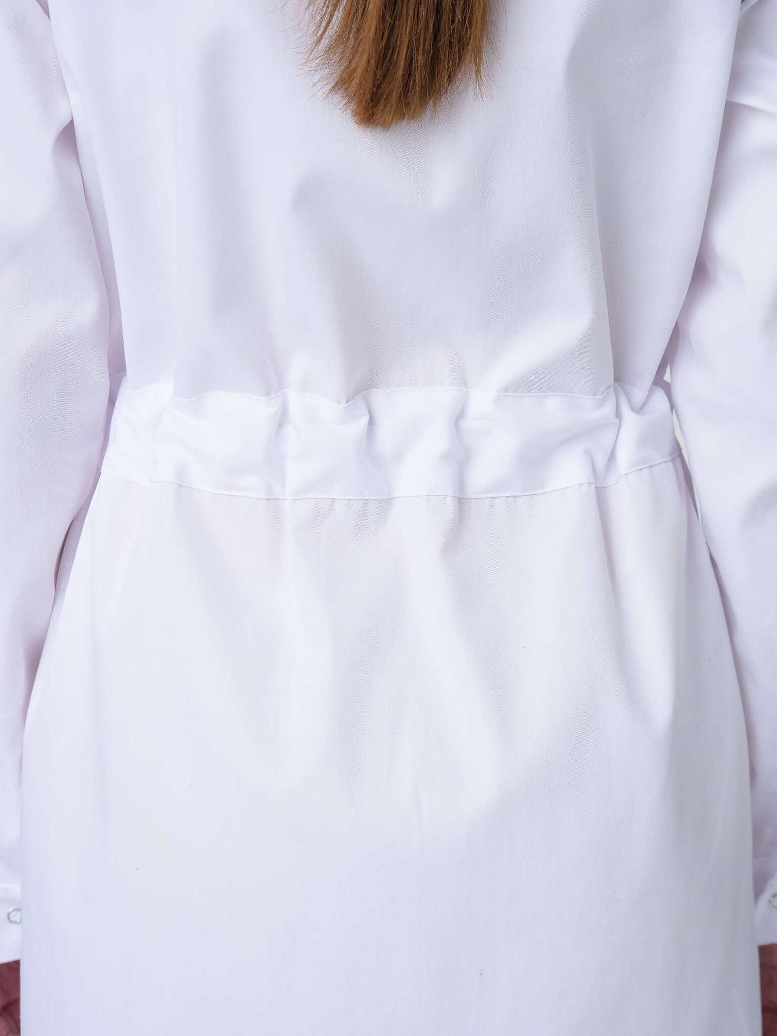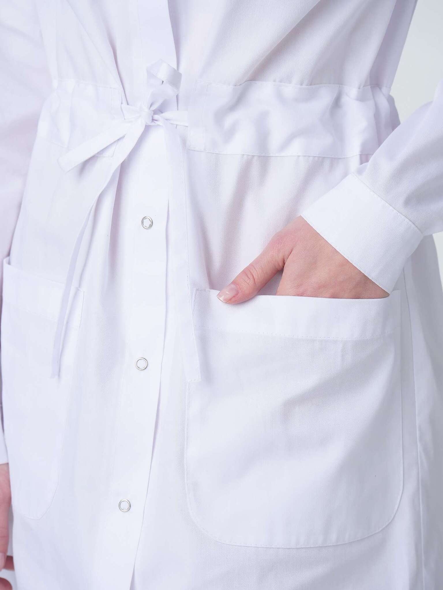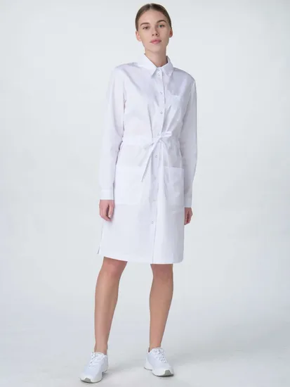 Халат изготовлен из ткани Оптима, состоящей на 65% из полиэстера и 35% из хлопка, с плотностью 160 гр/м². Данная ткань обладает высокой износостойкостью и легкостью в уходе, что делает халат идеальным для повседневного использования в условиях повышенных требований к гигиене.