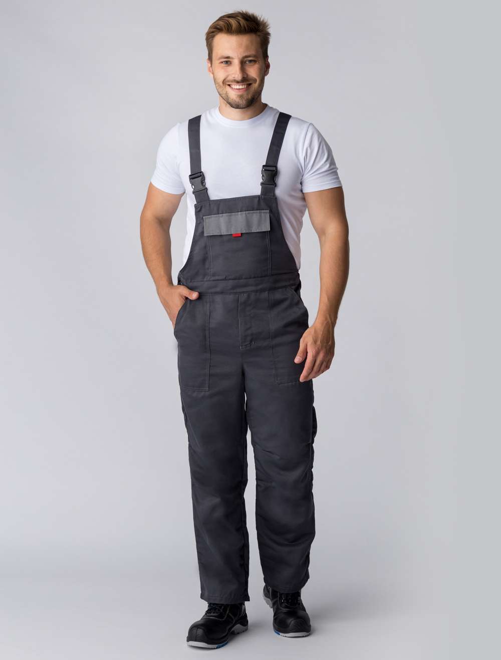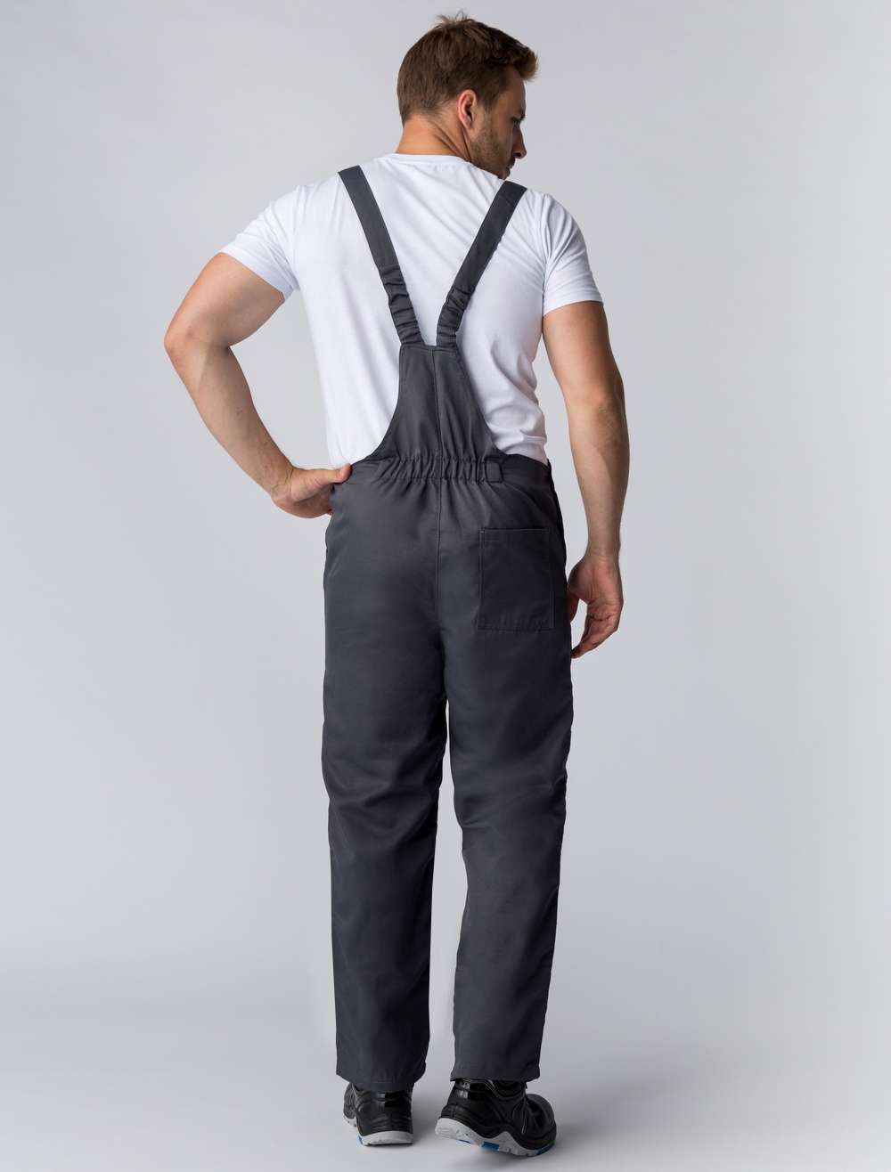 - Полукомбинезон: Отрезная грудка на притачном поясе, регулируемые по длине бретели, нагрудный двойной карман с клапаном.