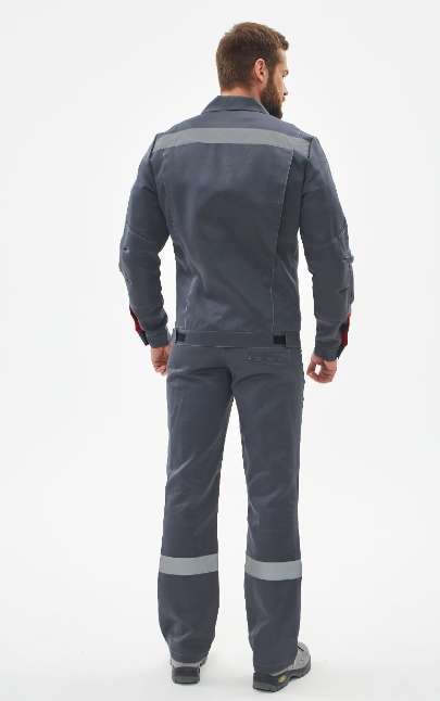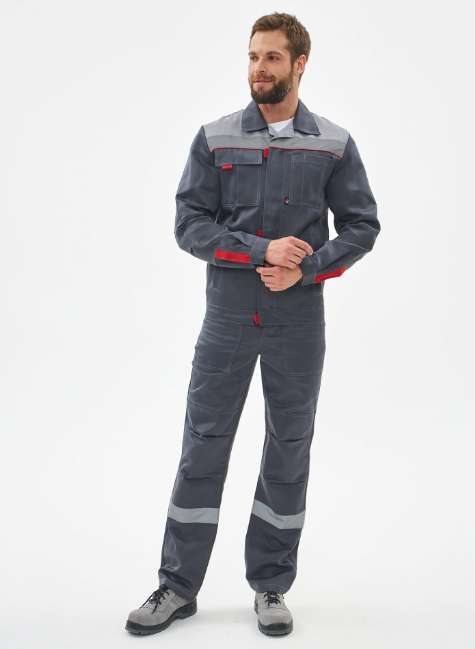 - Два элемента: костюм состоит из мужской рабочей куртки и полукомбинезона, что обеспечивает универсальность использования.