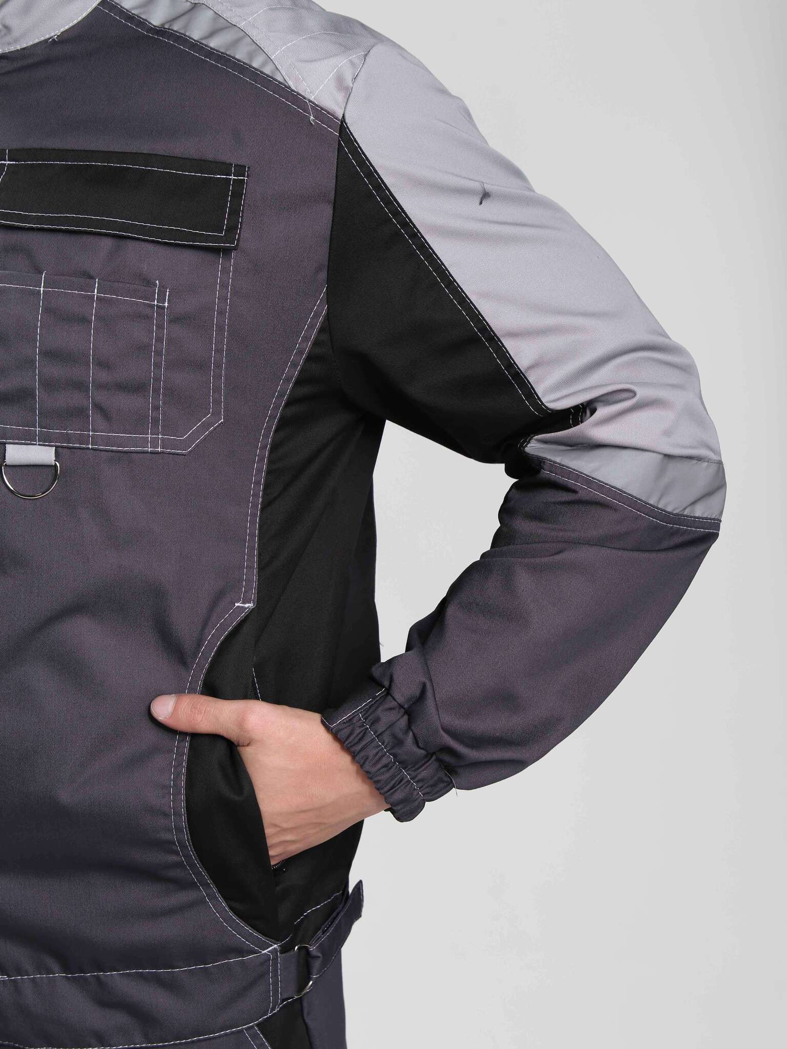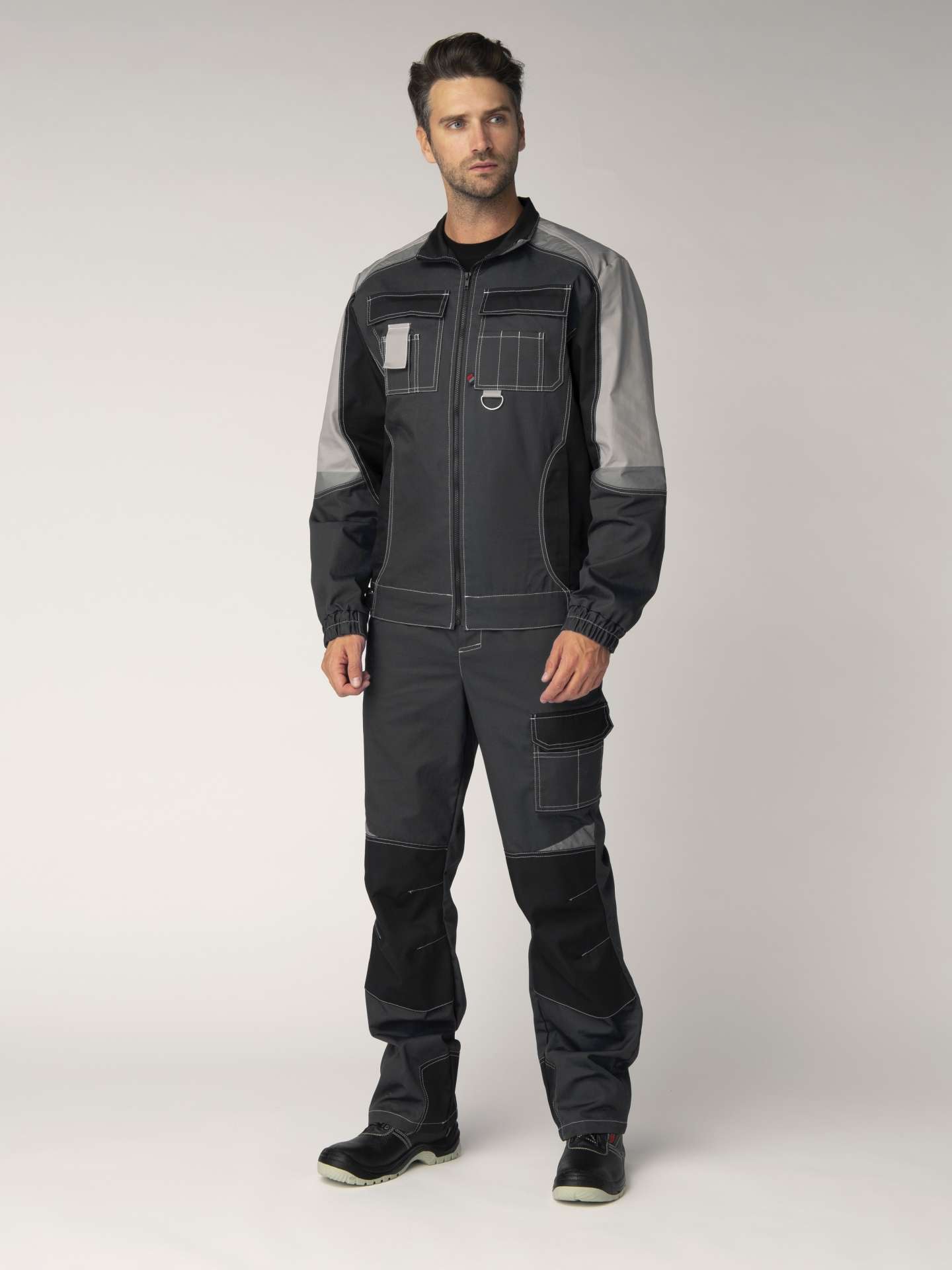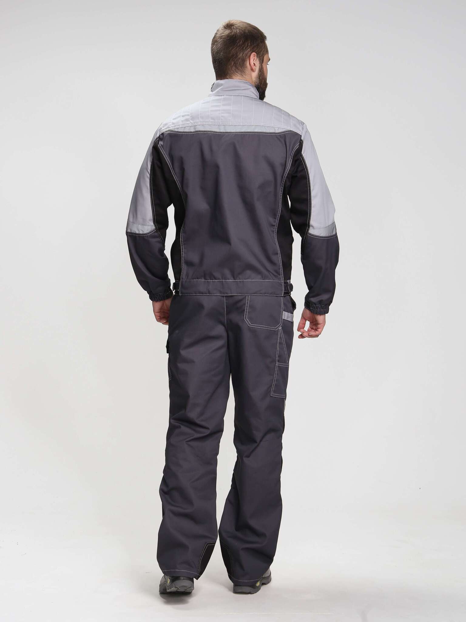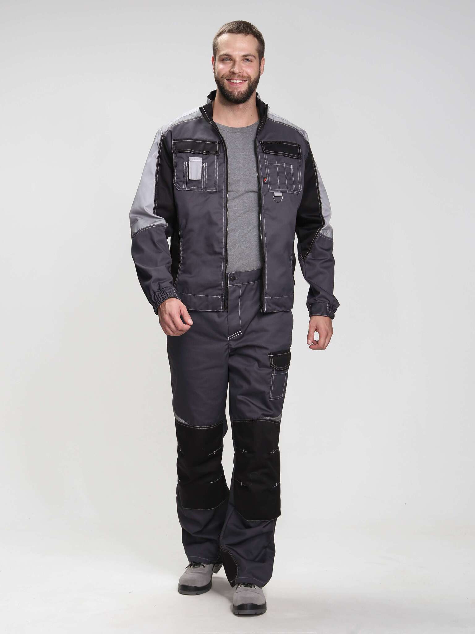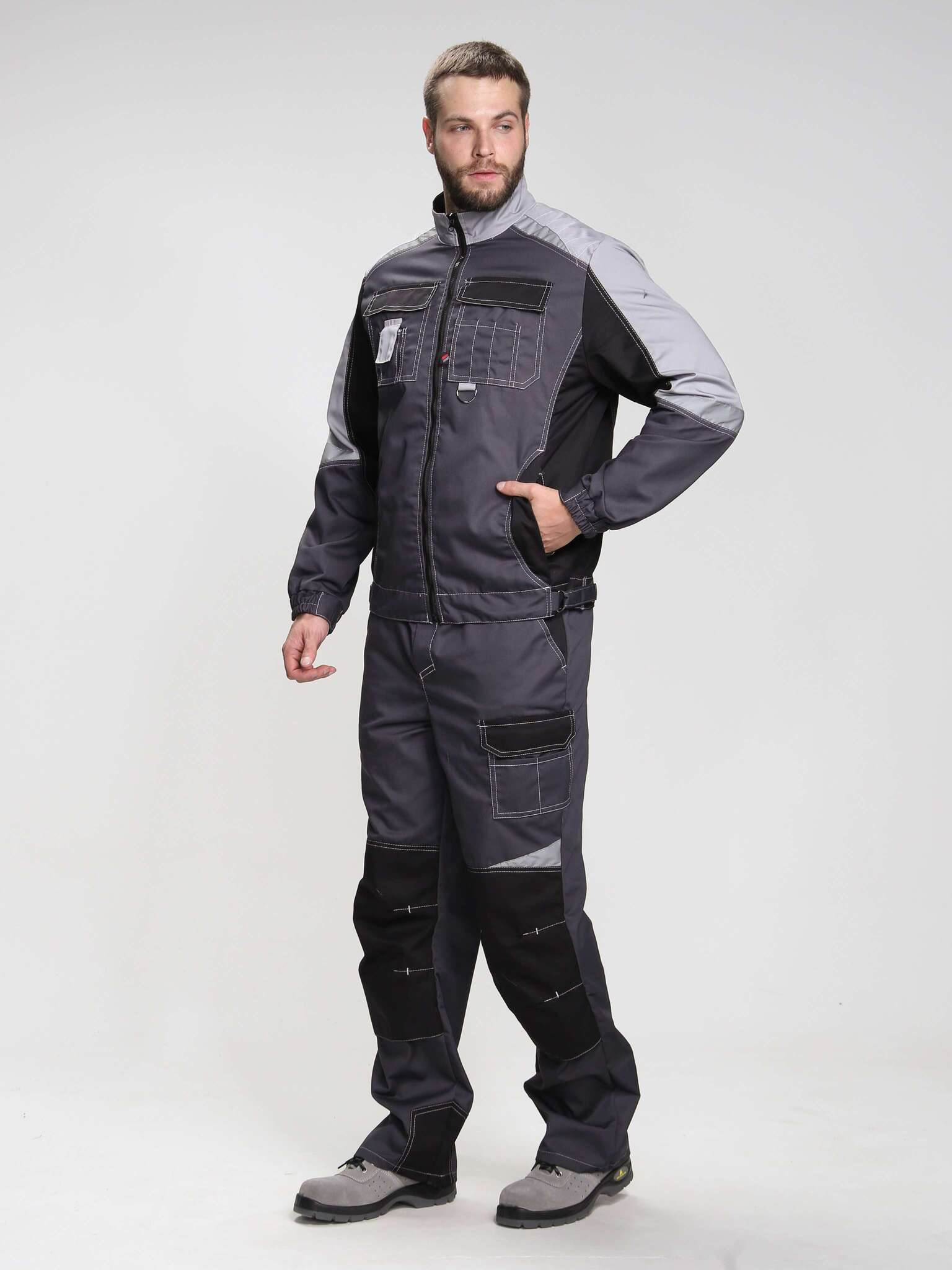 - Цвет: темно-серый с дополнительными светло-серыми и черными элементами, что позволяет легко сочетать костюм с различной рабочей обувью и аксессуарами.