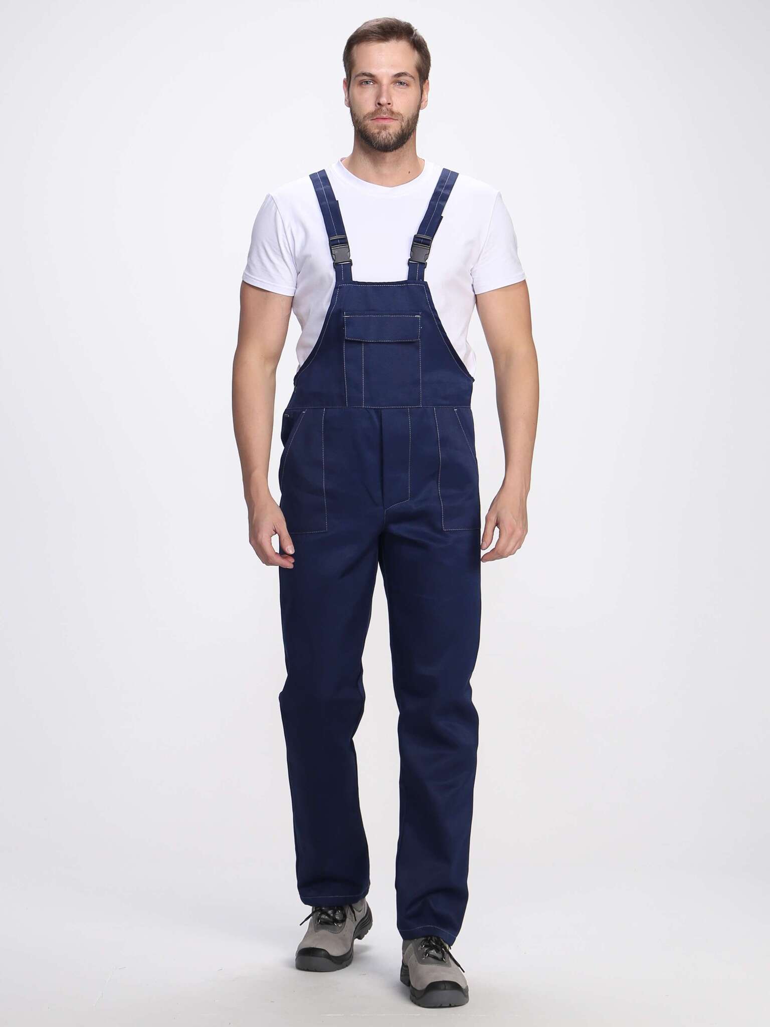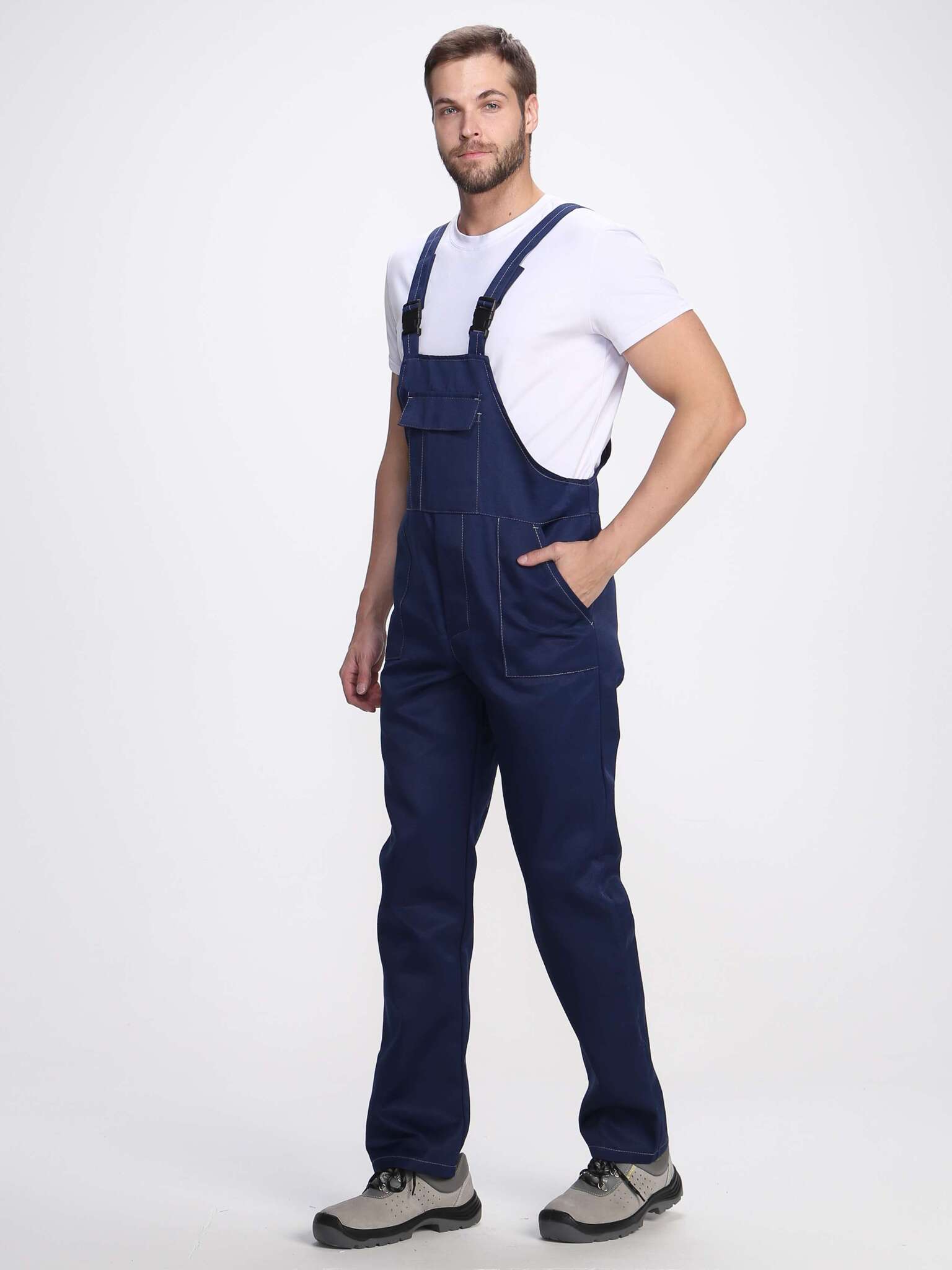 - Полукомбинезон: оснащен накладными карманами и нагрудным карманом с клапаном, а также бретелями с эластичными вставками для удобства.