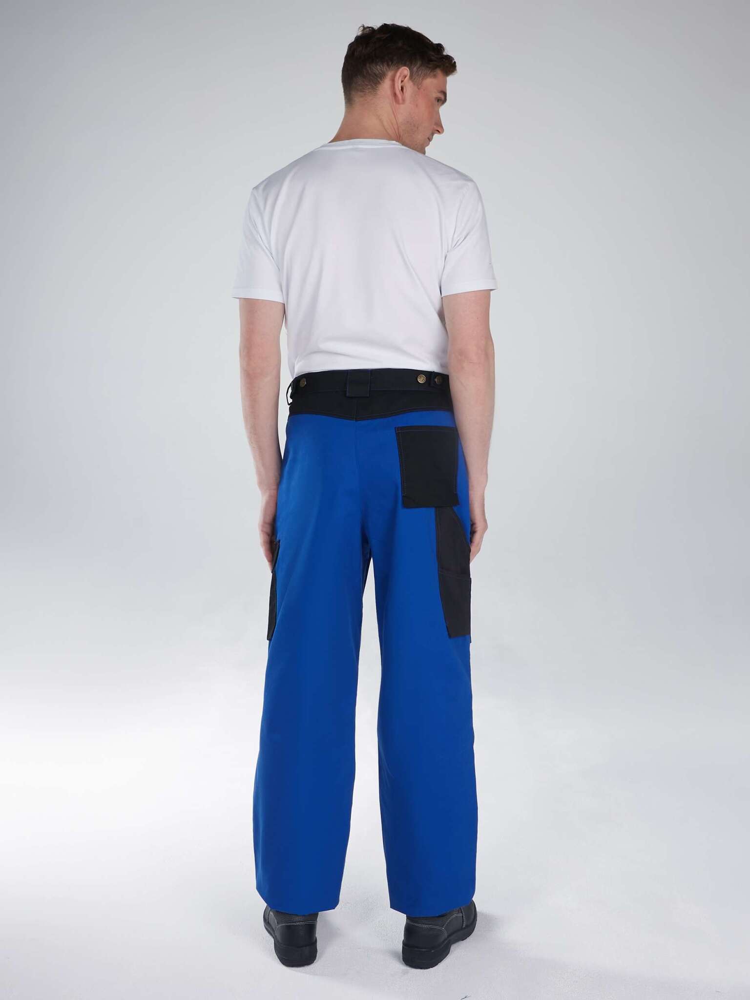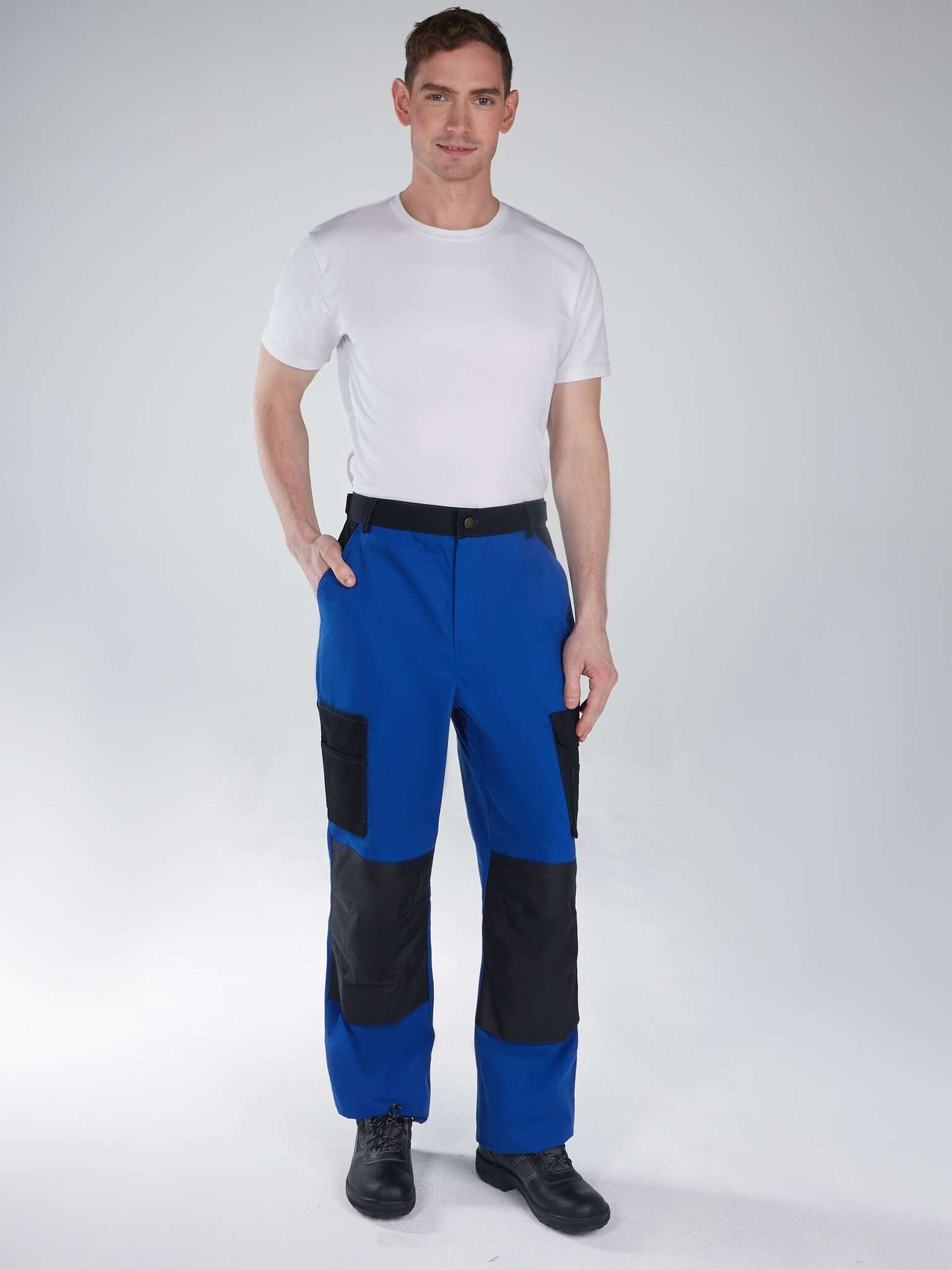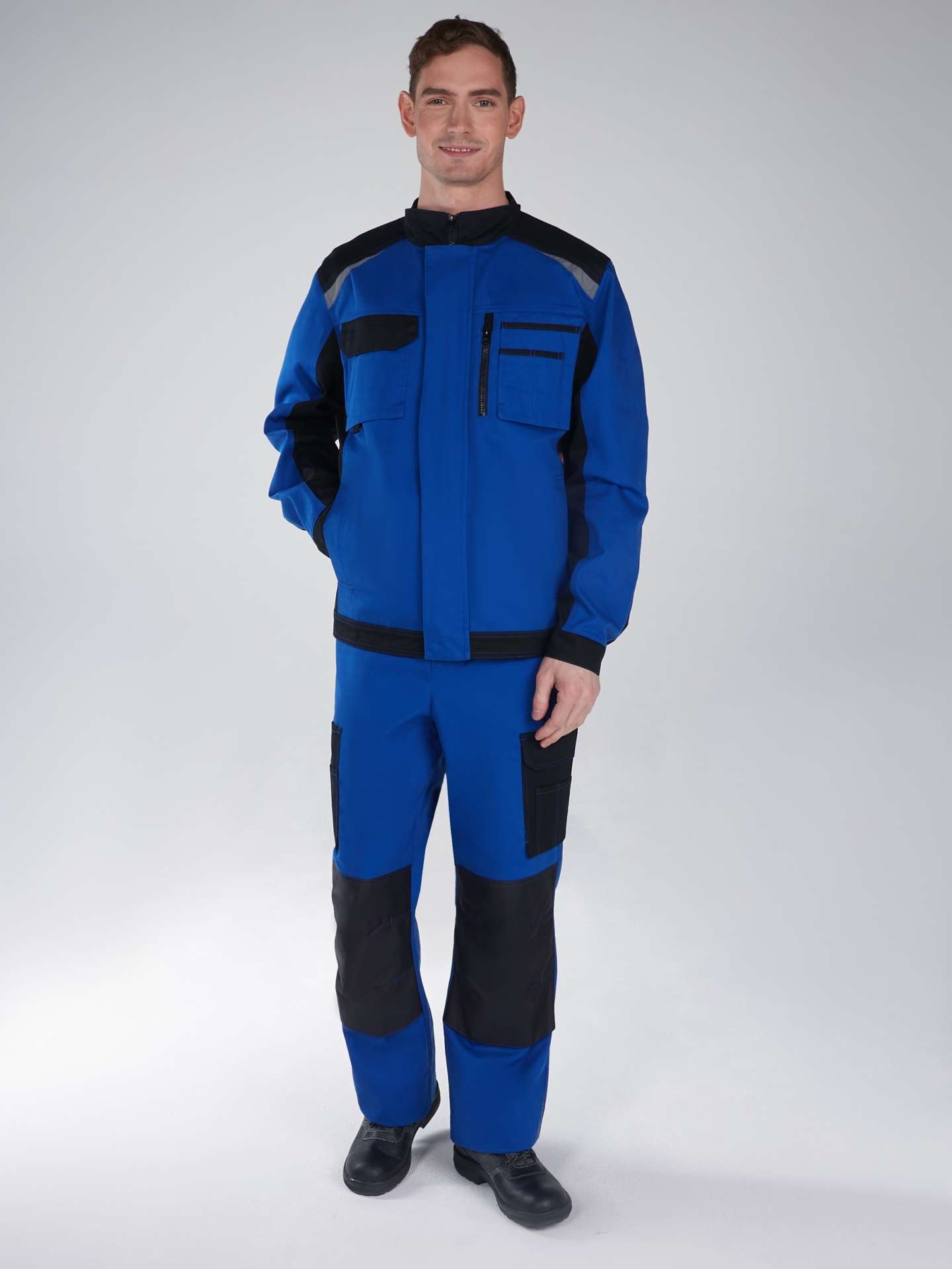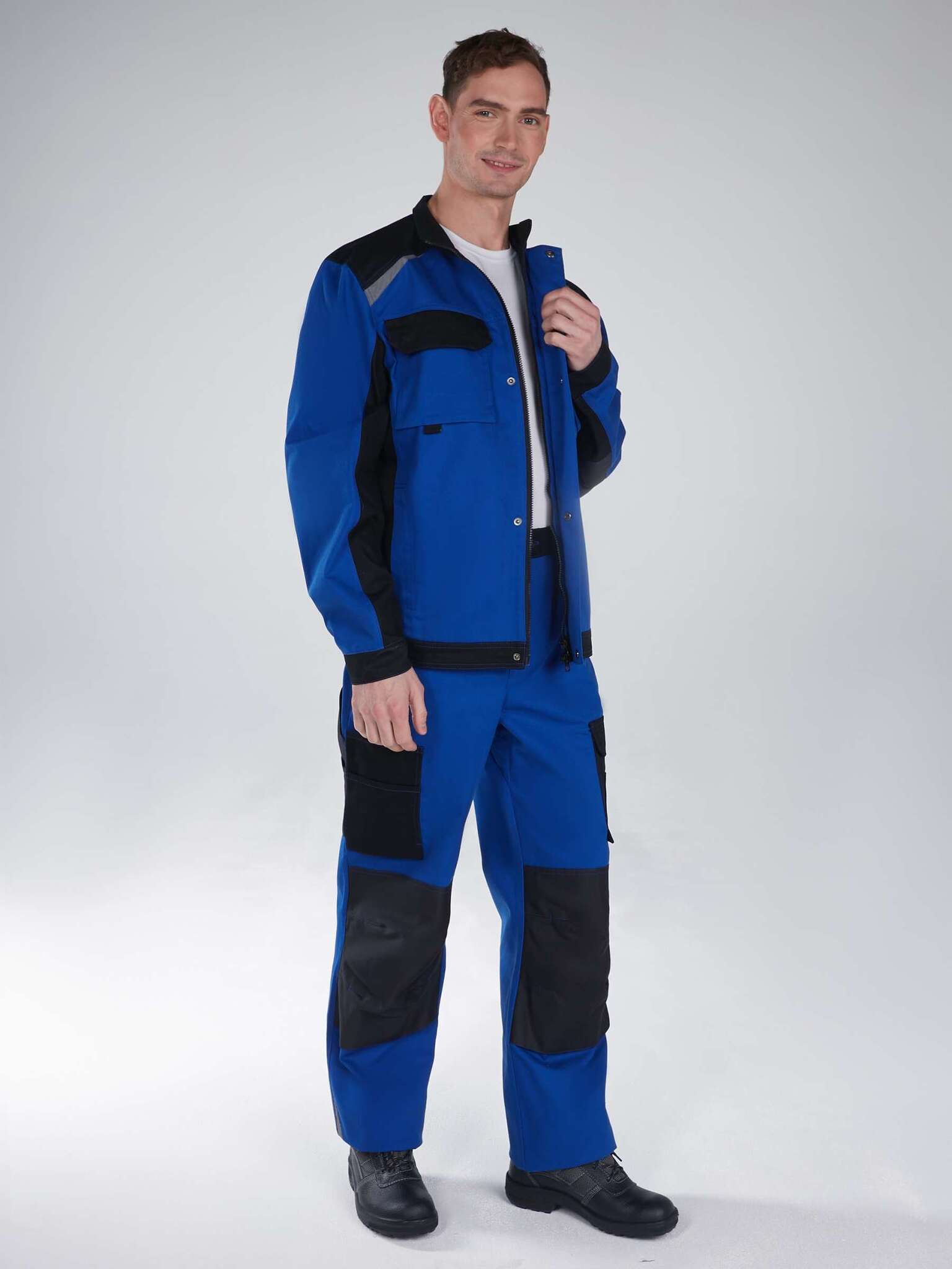 - Брюки: Прямого силуэта с передней застежкой на молнию, боковые карманы, усиления на коленях и светоотражающие вставки для безопасности.