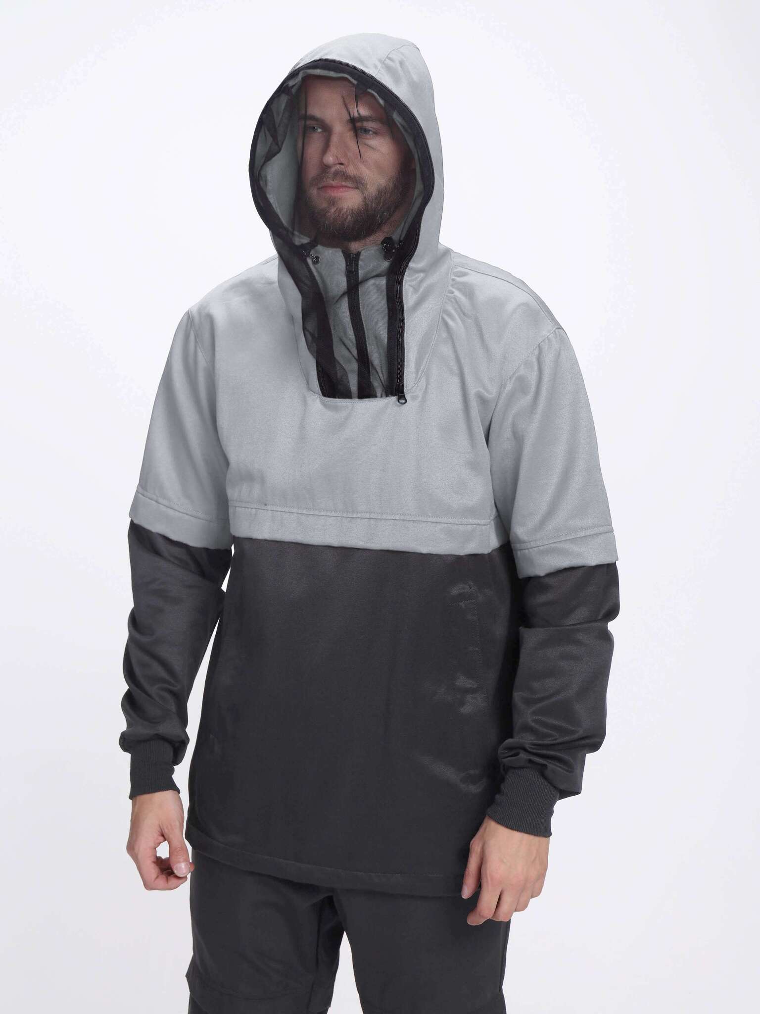 - Куртка: Анорак без распашной застежки, с одним большим накладным карманом и защитной сеткой на лицо, которая может быть убрана в потайной карман.