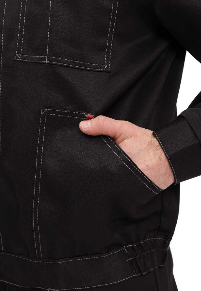 - Структура: состоит из куртки с супатной застежкой на пуговицы и полукомбинезона с регулируемыми бретелями и нагрудным карманом.