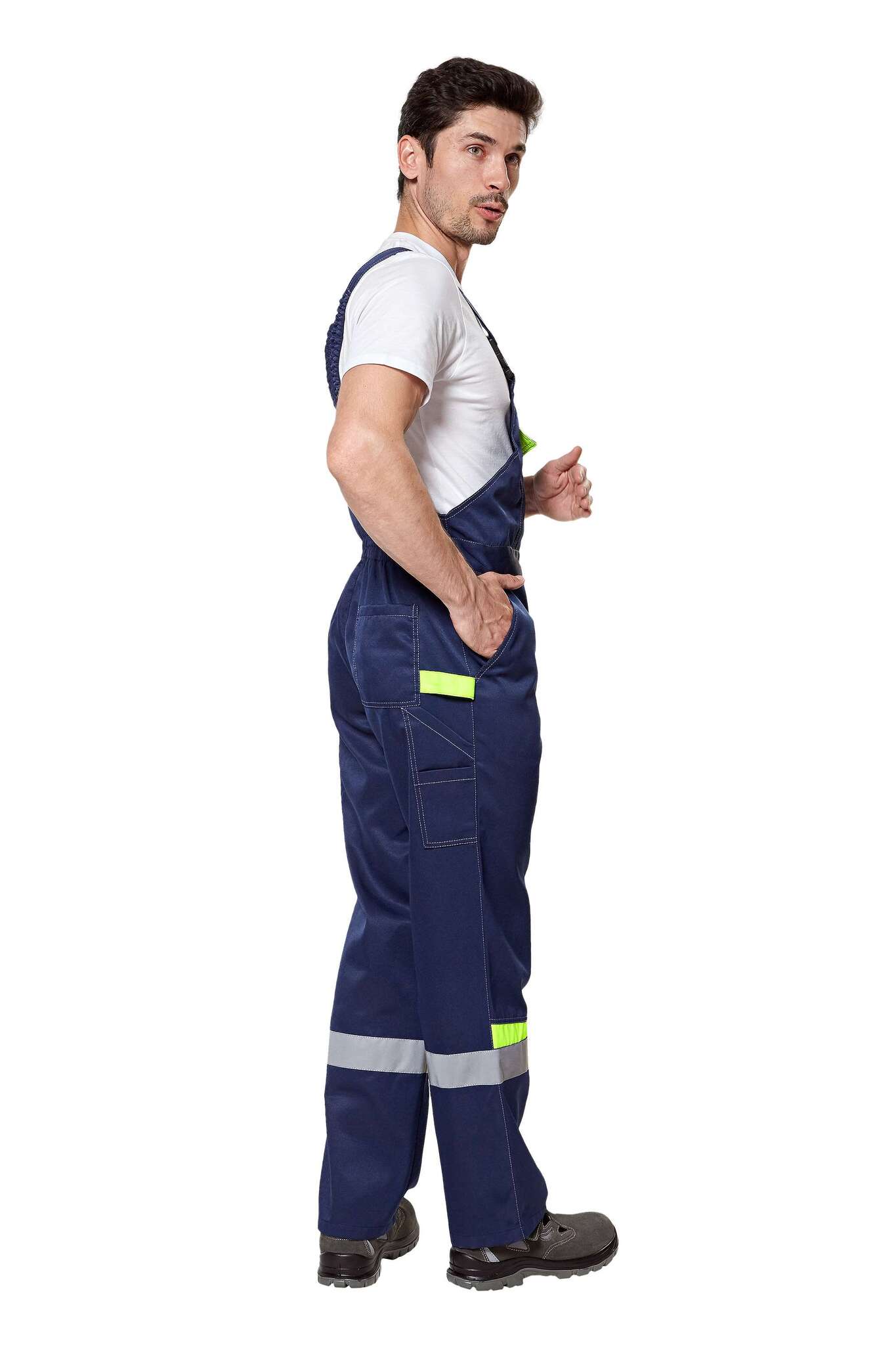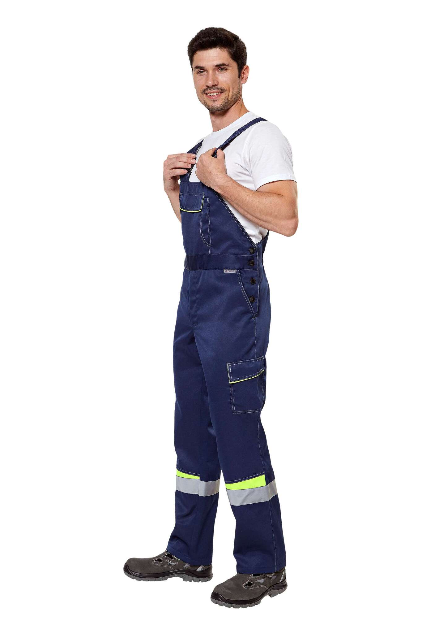 - Полукомбинезон: центральная молния, боковые пуговицы, нагрудный карман с отделением для канцелярии.
