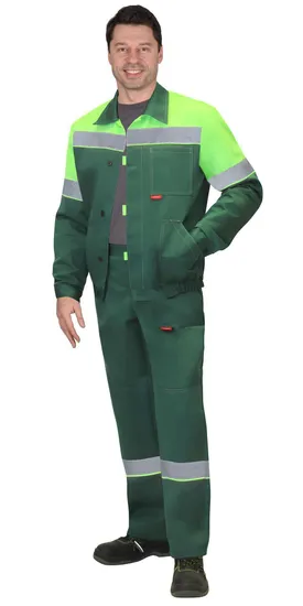 - Сигнальная видимость: костюм оснащен лентой СОП и контрастным кантом, что обеспечивает безопасность работников на производстве.