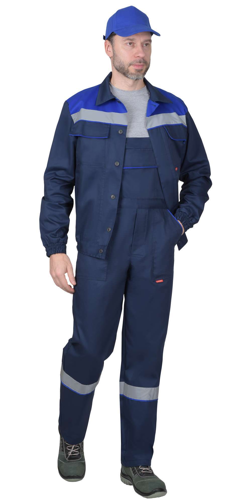 - Комплектация: куртка с отложным воротником и полукомбинезон с боковыми и нагрудным карманами.
