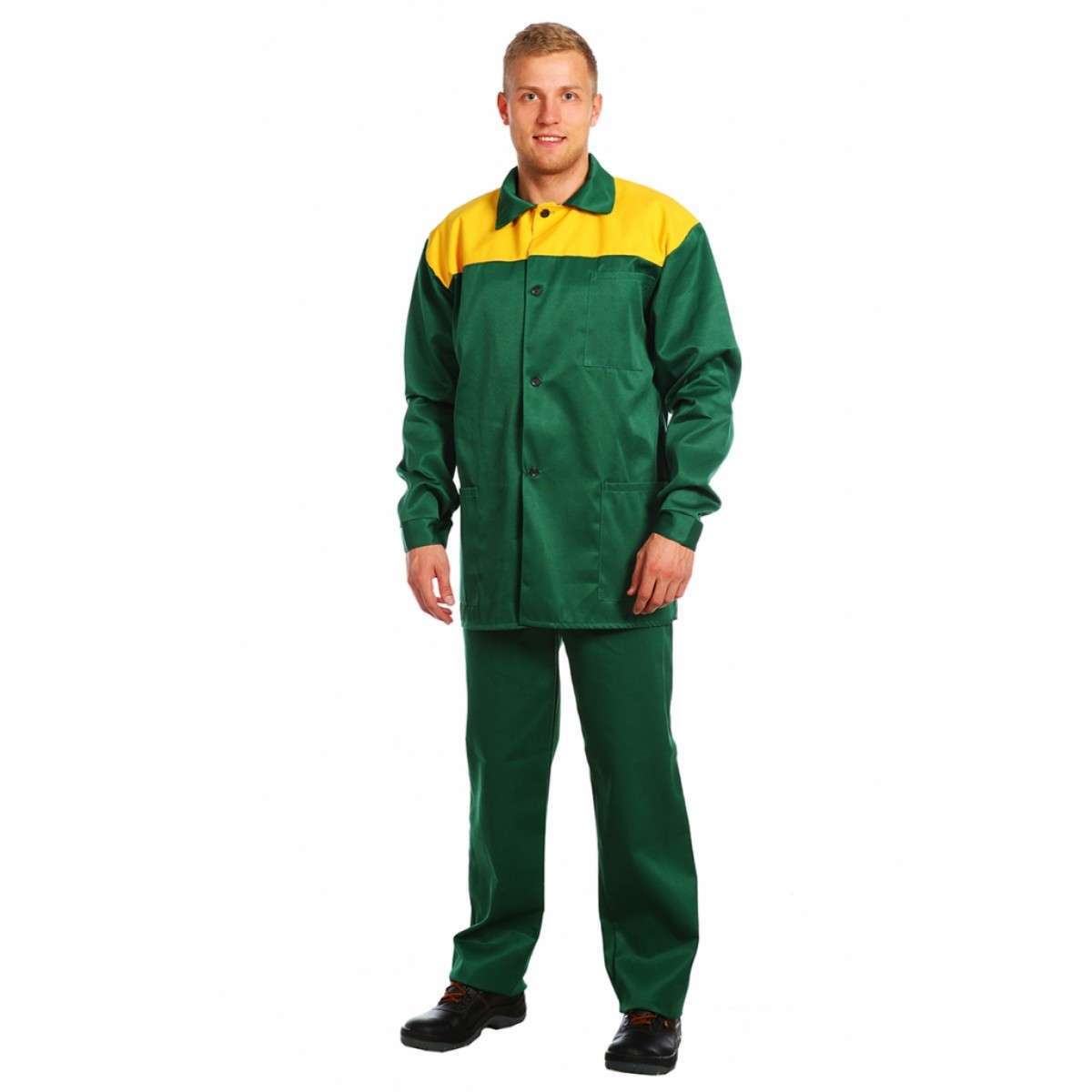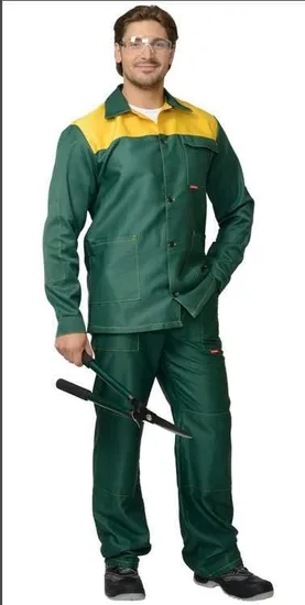 - Цвет: основной зеленый с контрастными желтыми деталями, что делает костюм не только практичным, но и стильным.