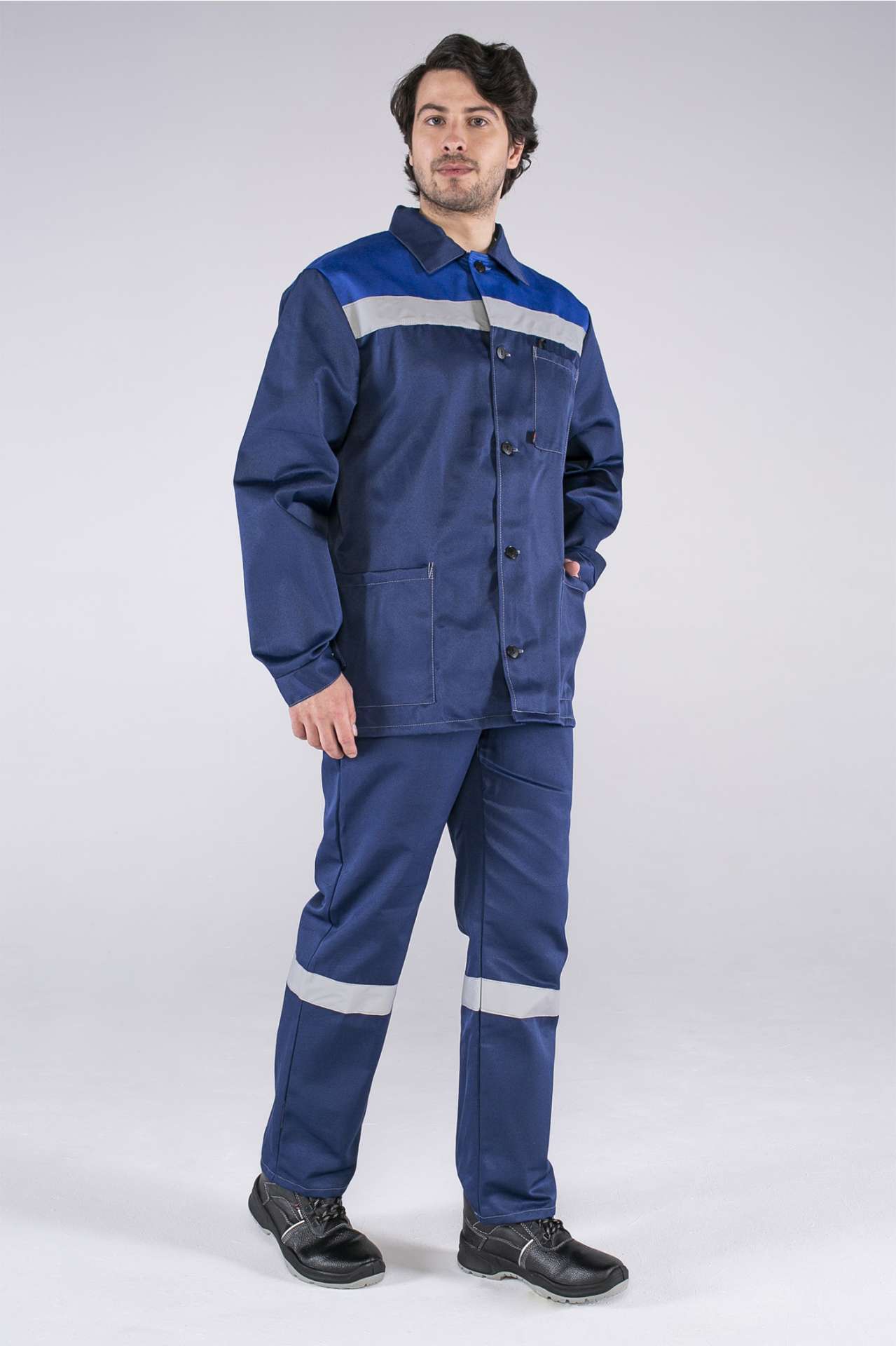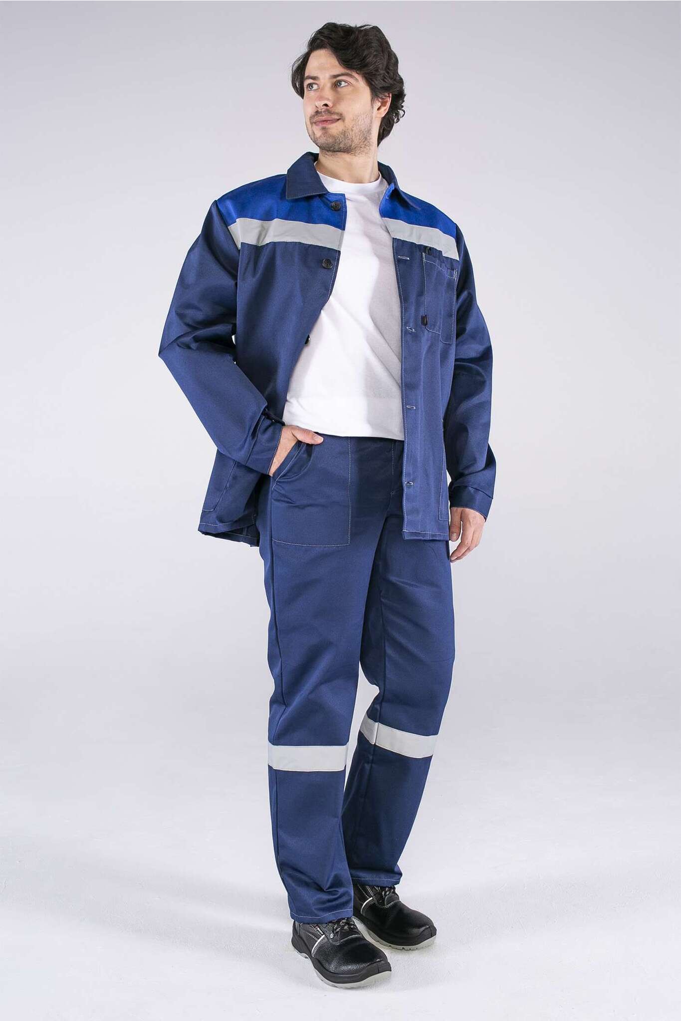 - Брюки: прямого силуэта с гульфиком на петли и пуговицы, поясом со шлевками под ремень и боковыми карманами с наклонным входом. СОП 50 мм по низу брючин гарантирует дополнительную защиту.