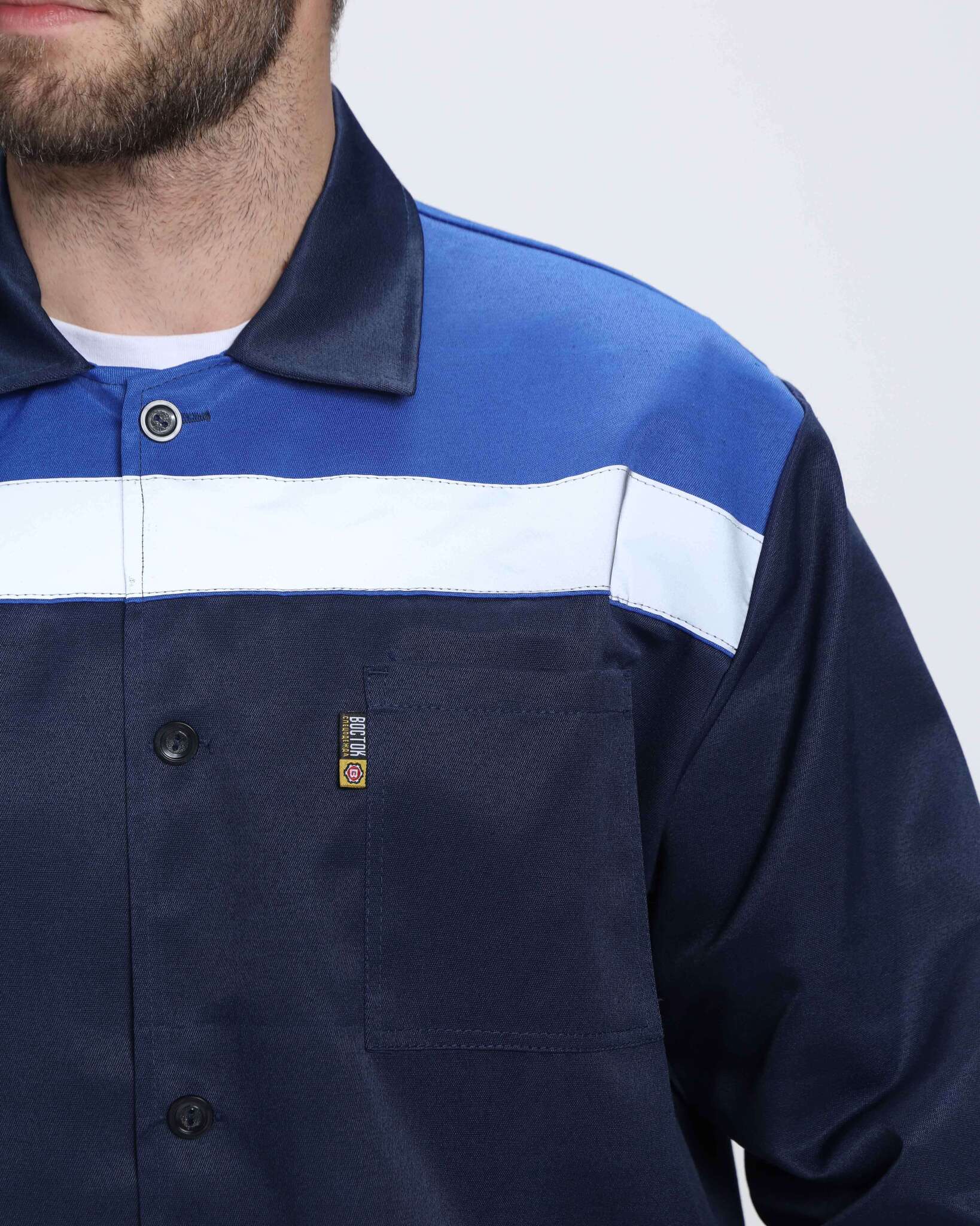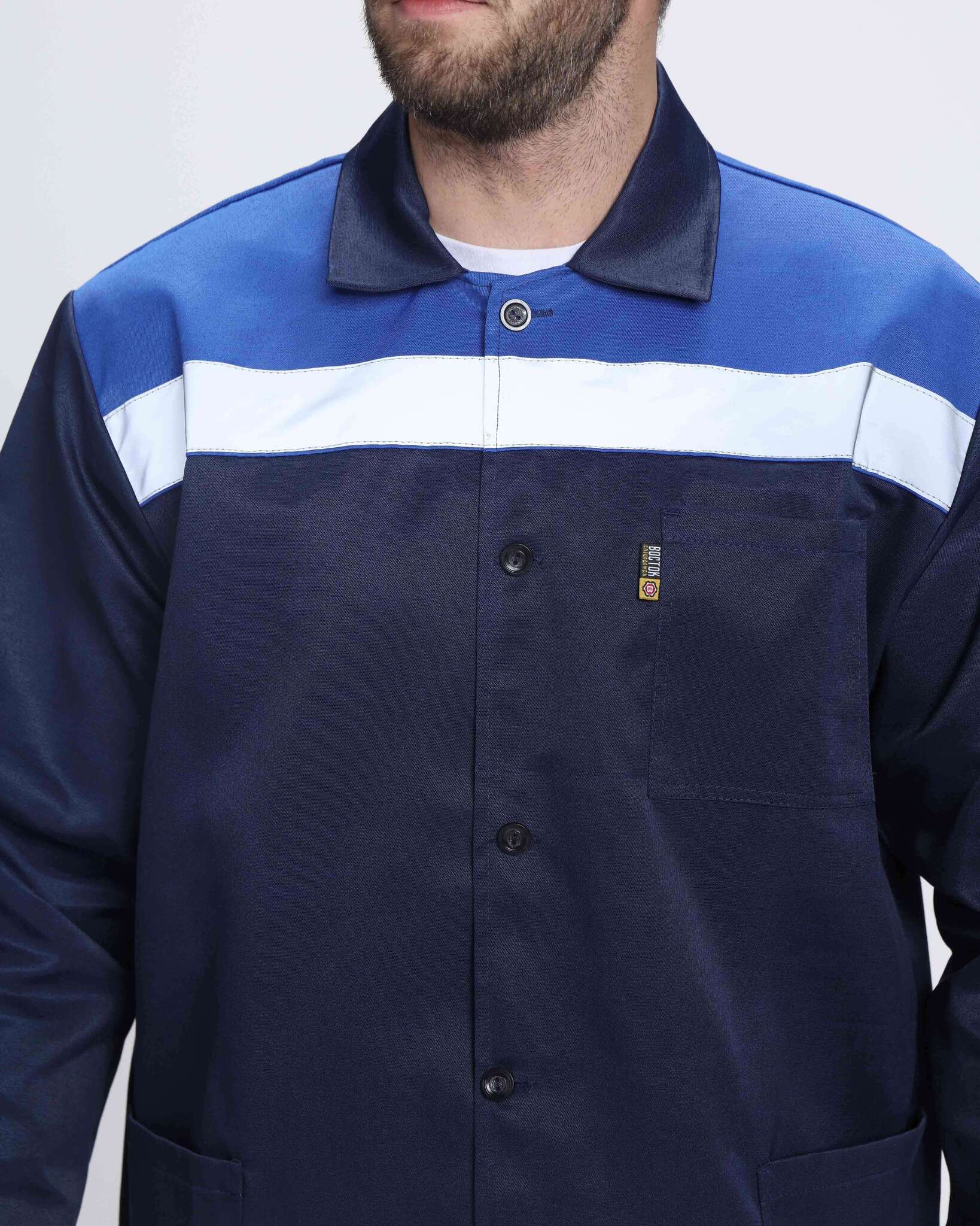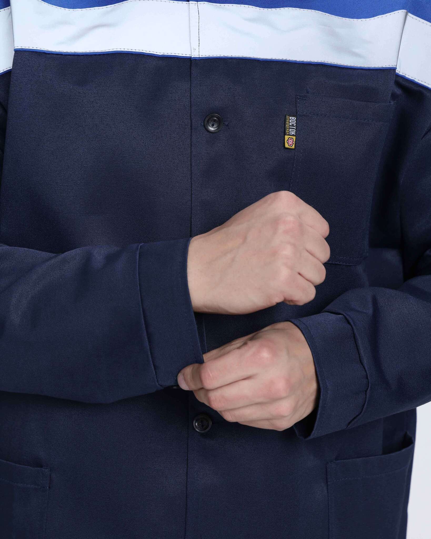 Костюм Стандарт/Дамаск СОП (тк. Смесовая, 210) в темно-синем и васильковом цветах — это идеальное решение для предприятий и заводов, стремящихся обеспечить своим сотрудникам не только стильный, но и функциональный рабочий комплект. Удлиненная куртка с центральной застежкой на петли и пуговицы, а также прямые брюки с удобным поясом, гарантируют комфорт и свободу движений в течение всего рабочего дня.