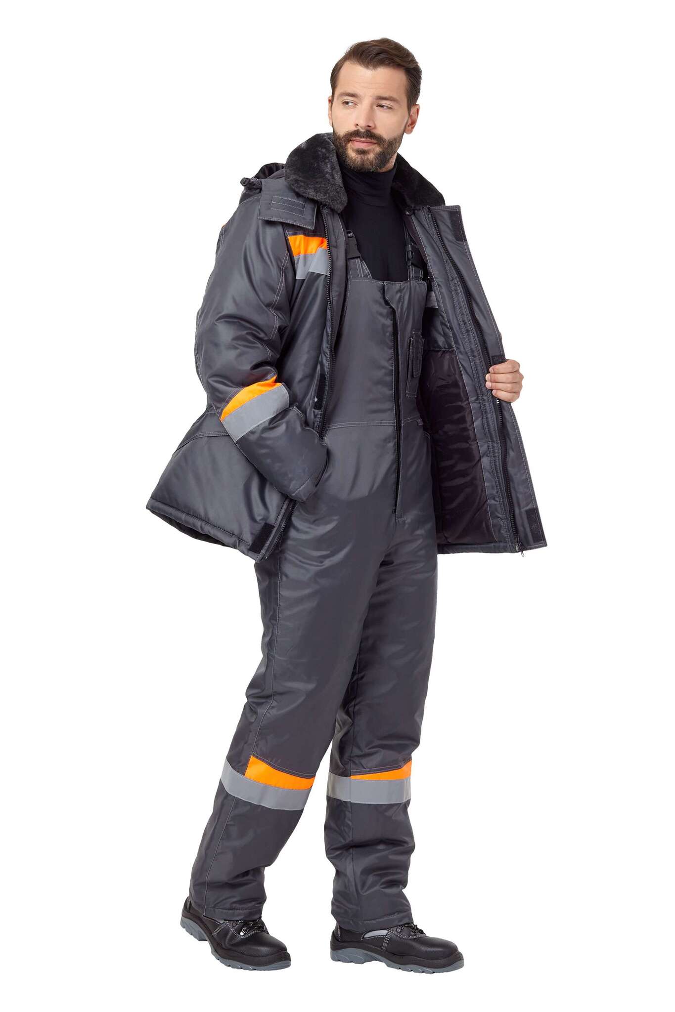 - Куртка: Прямой силуэт с двухзамковой молнией и ветрозащитной планкой. Оснащена отложным воротником с меховым элементом и утепленными накладными карманами.