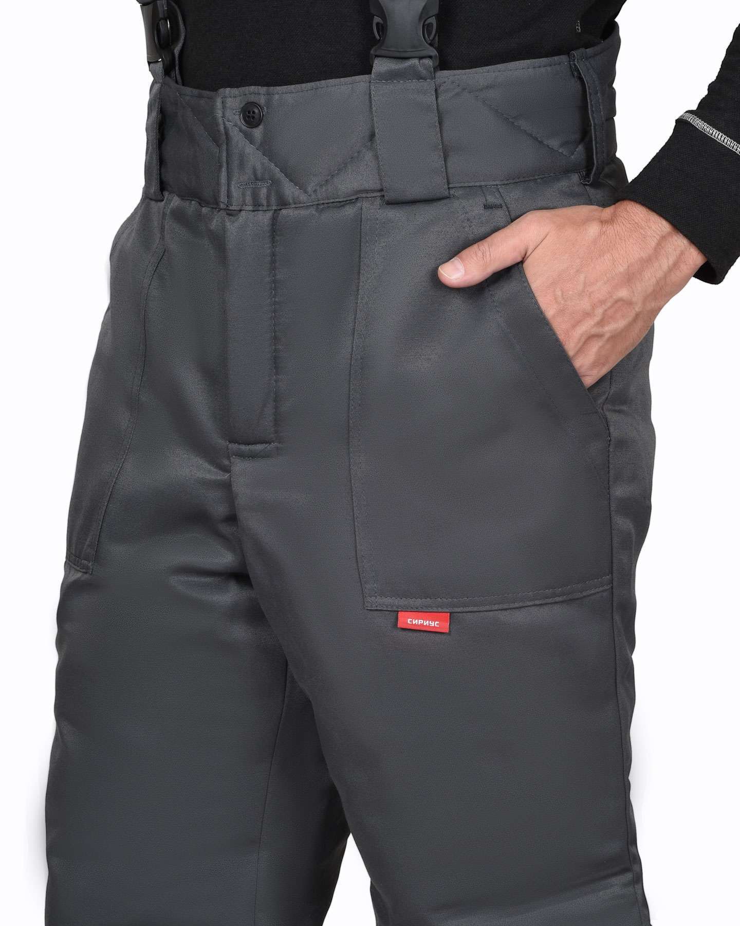 - Брюки: Прямые с утепленной подкладкой, центральной застежкой на молнию и пуговицы, широким фигурным поясом и боковыми накладными карманами.