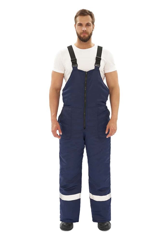- Полукомбинезон: также утепленный, с накладными карманами и световозвращающей полосой ниже колена.