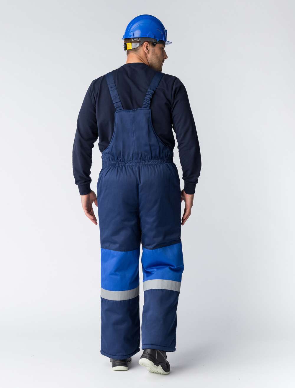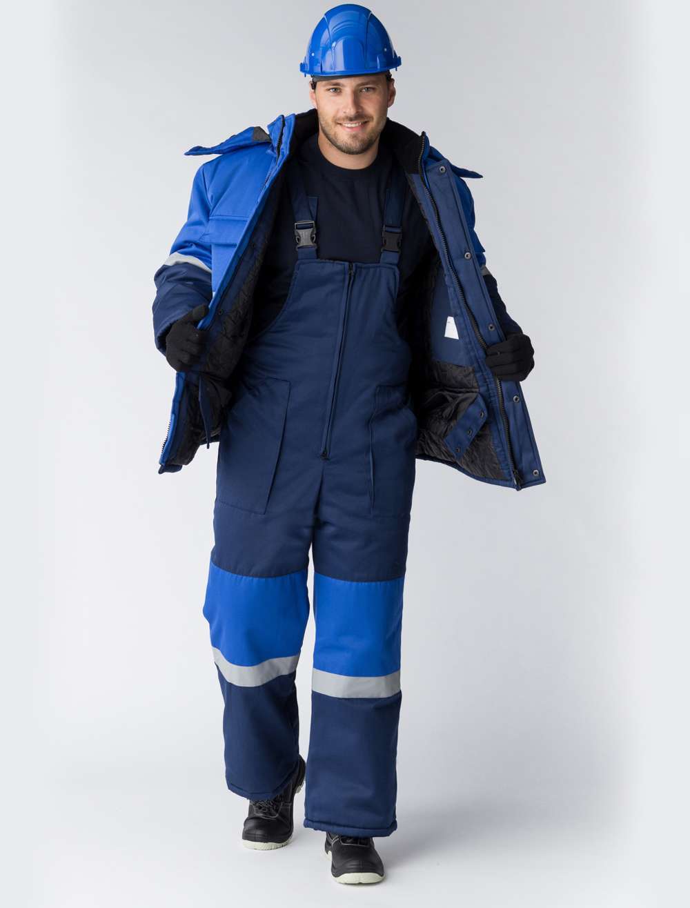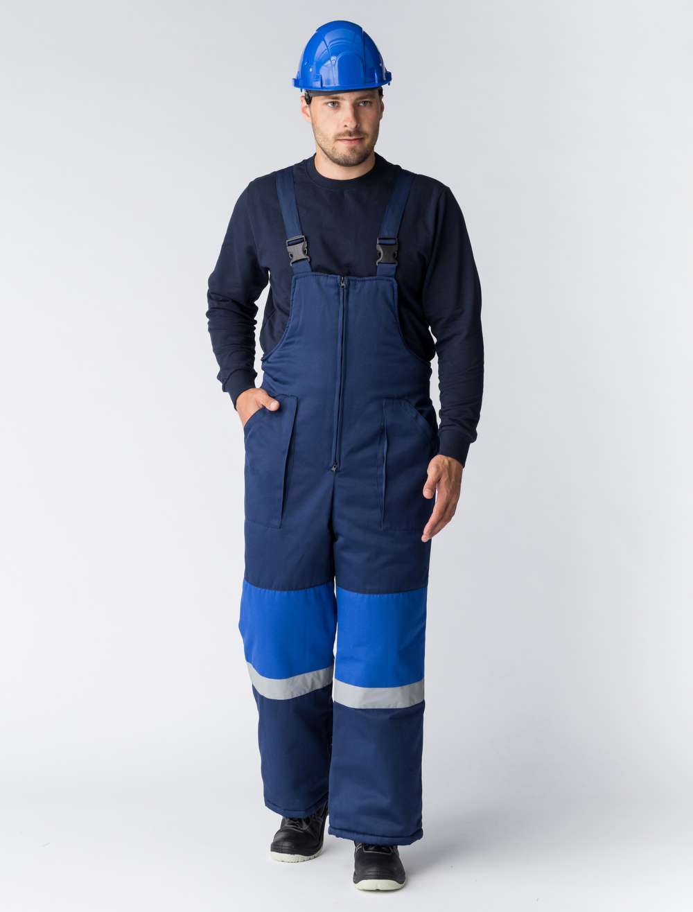 - Полукомбинезон: на регулируемых по длине бретелях с центральной застежкой-молнией и двумя передними накладными карманами.