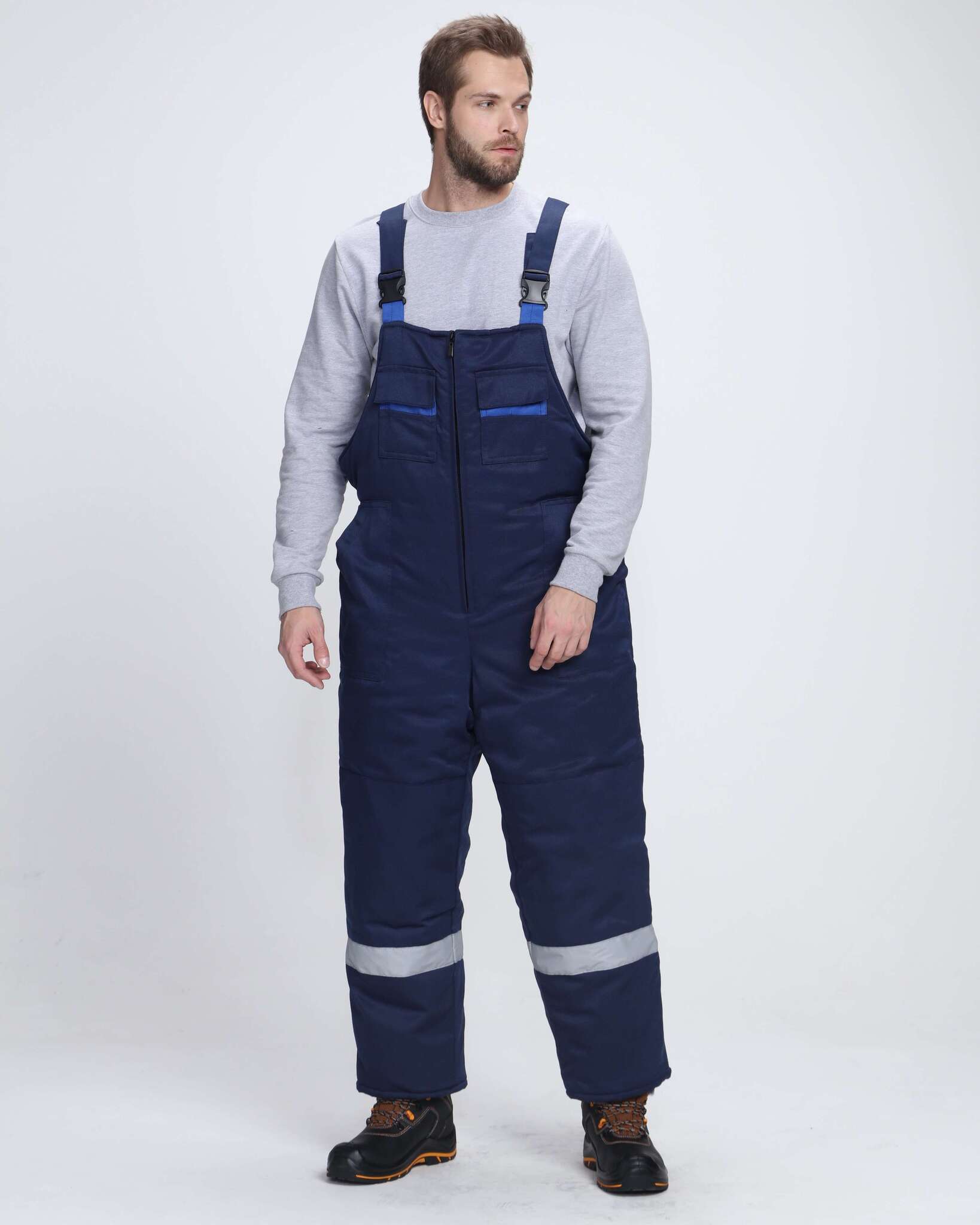 - Полукомбинезон: Цельнокроеный нагрудник, бортовая застежка на молнию, накладные карманы и усиленные наколенники.