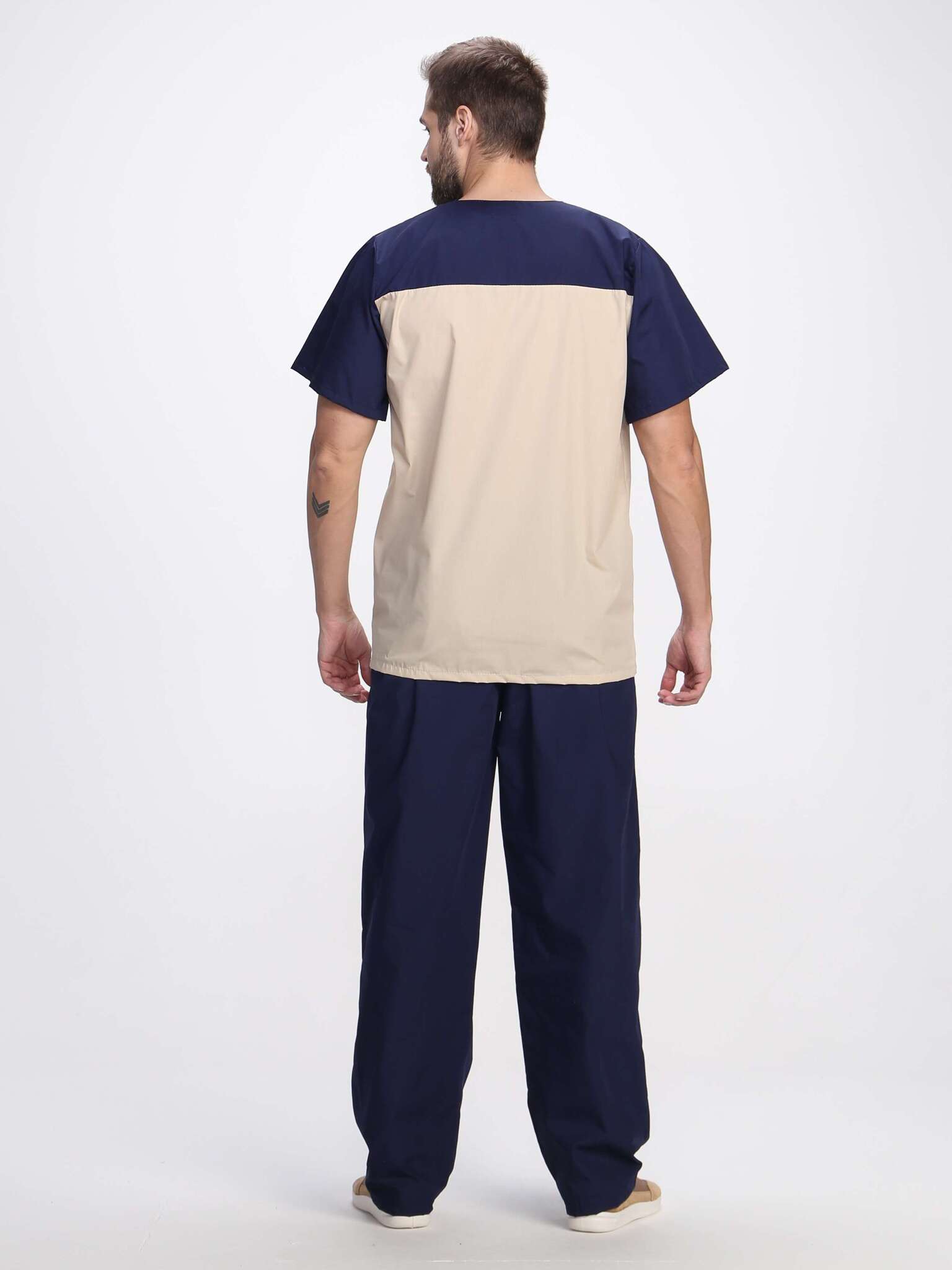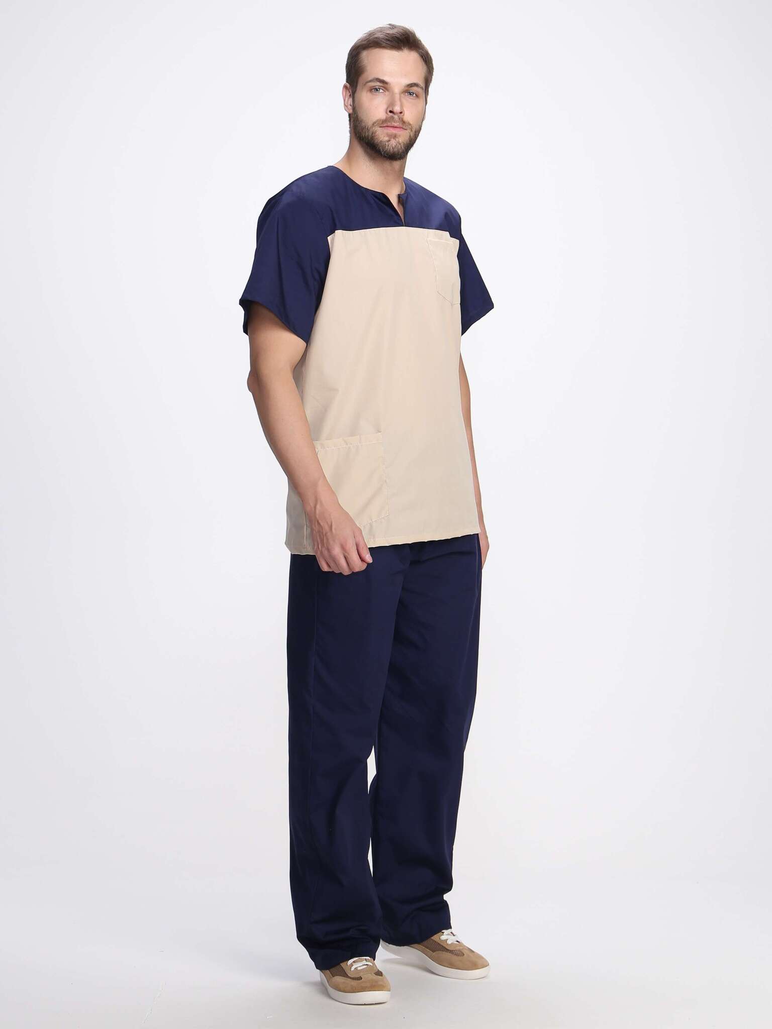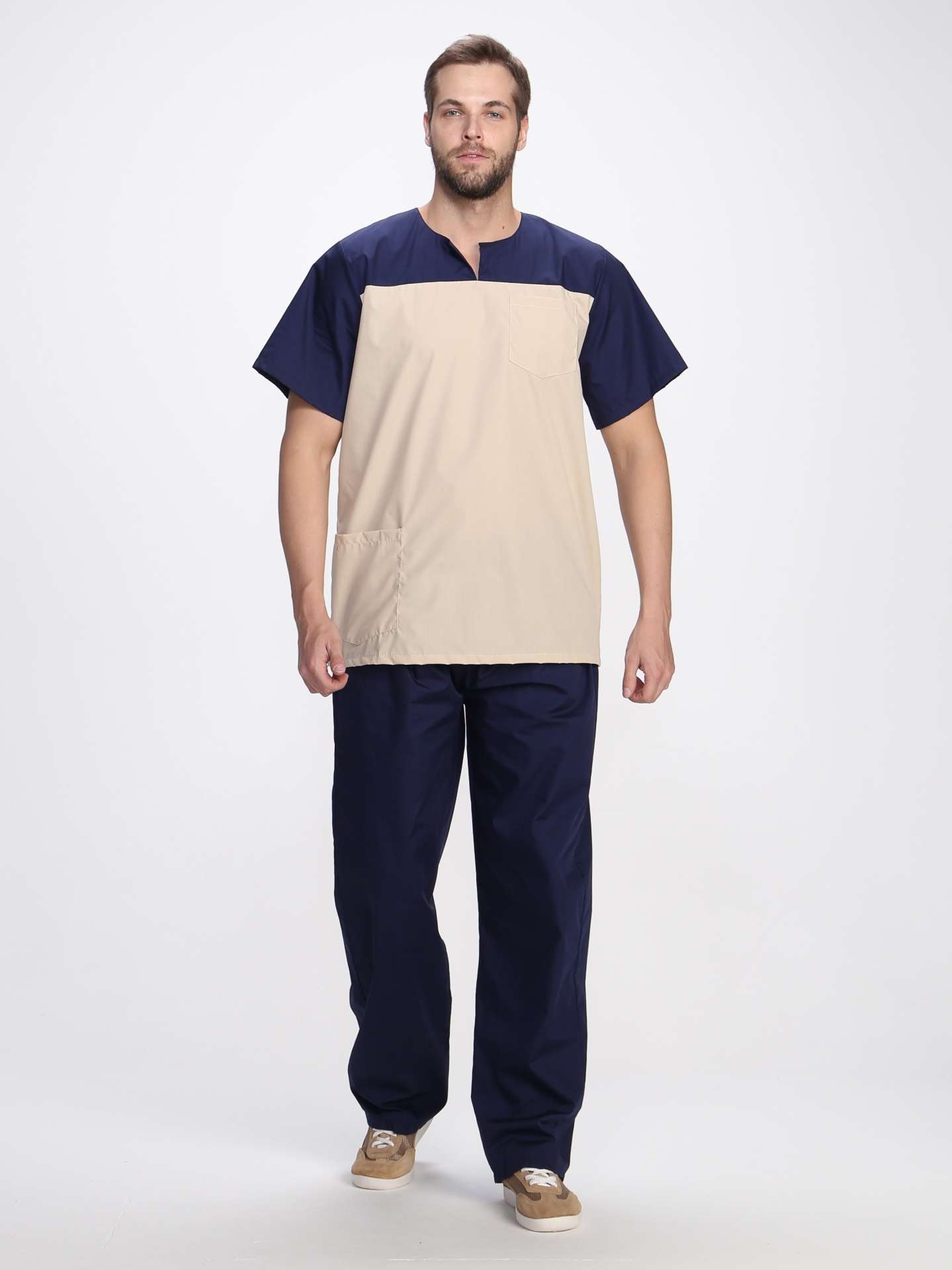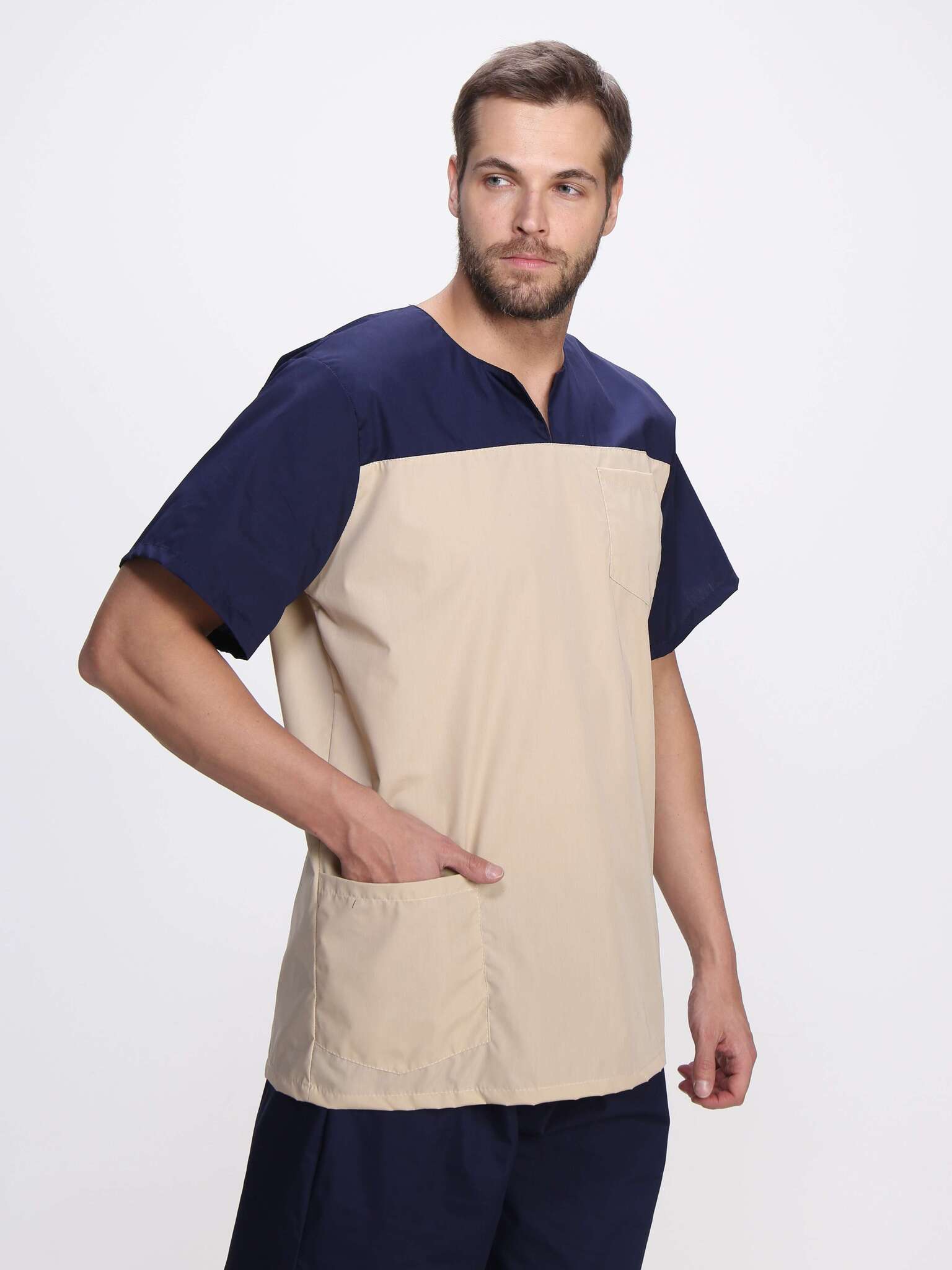 Костюм мужской «Стоматолог» в цветовой гамме т.синий/бежевый представляет собой высококачественную спецодежду, специально разработанную для сотрудников стоматологических клиник, массажных кабинетов и других медицинских учреждений. Этот костюм обеспечивает надежную защиту от производственных загрязнений, сочетая в себе комфорт и стиль.