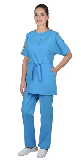- Блуза: полуприлегающего силуэта с короткими рукавами и без воротника, оснащена нижними накладными карманами.