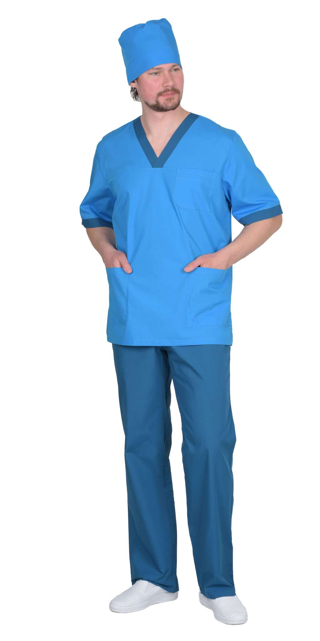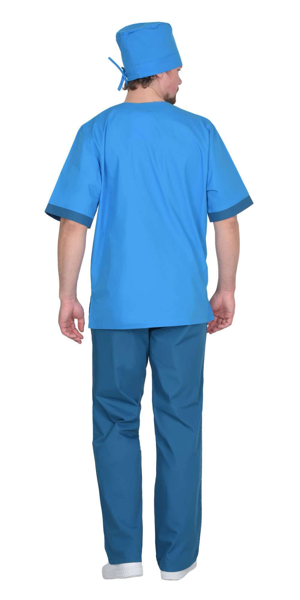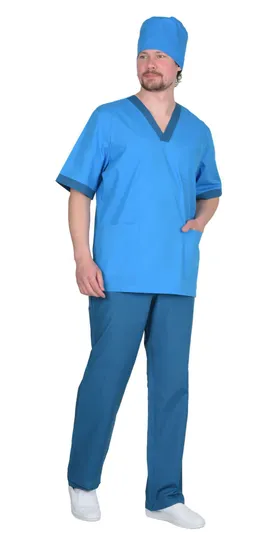 - Комплектность: Костюм состоит из блузы, брюк и колпака.