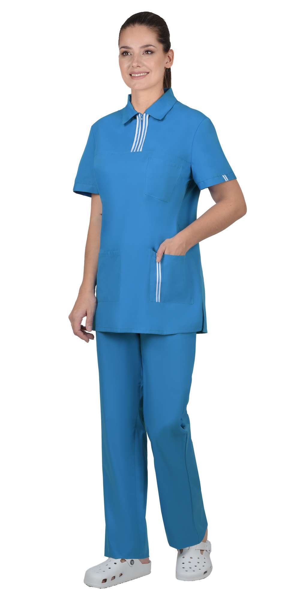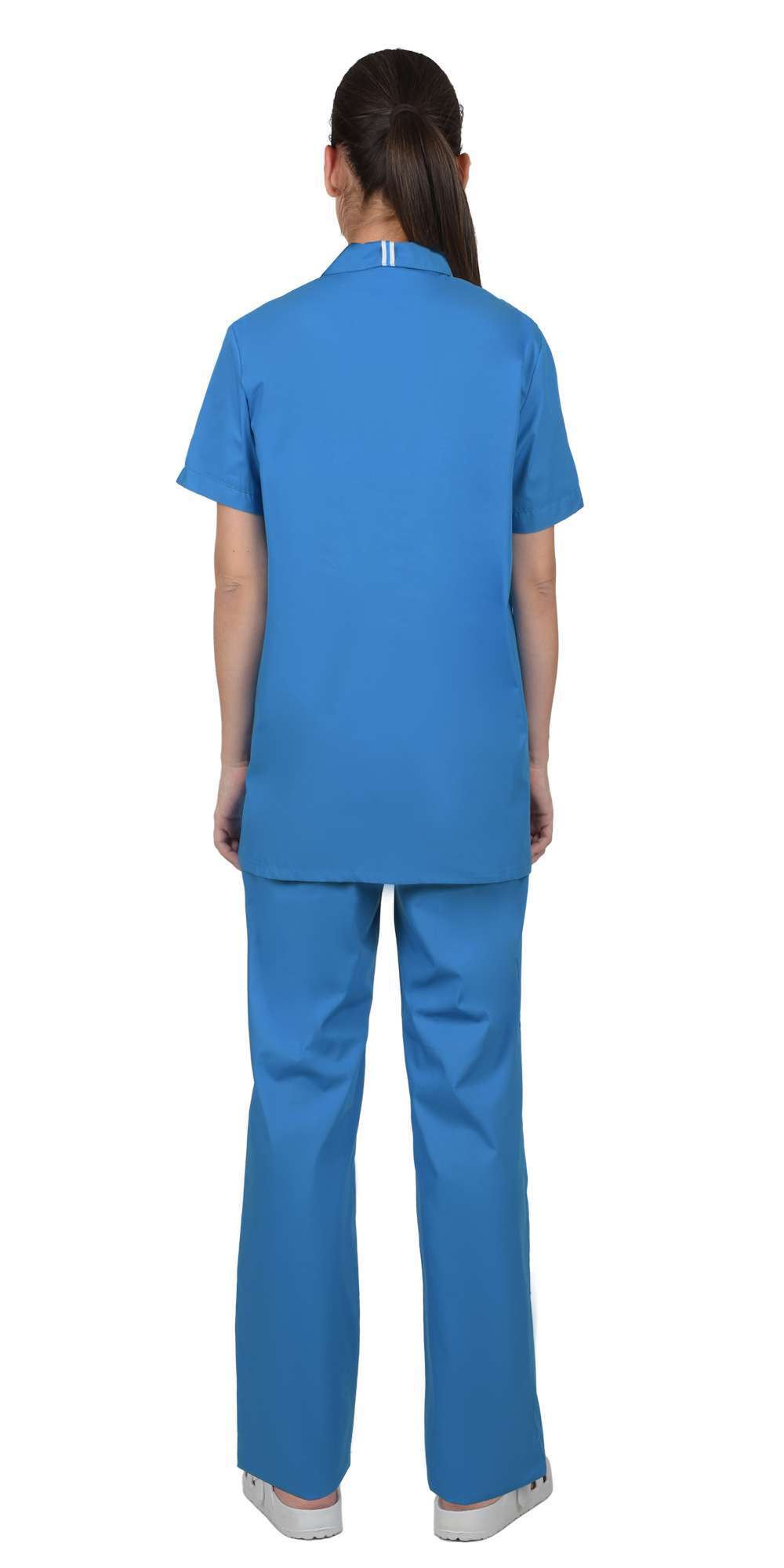 - Комплектность: состоит из блузы и брюк, что обеспечивает полный комплект для работы.