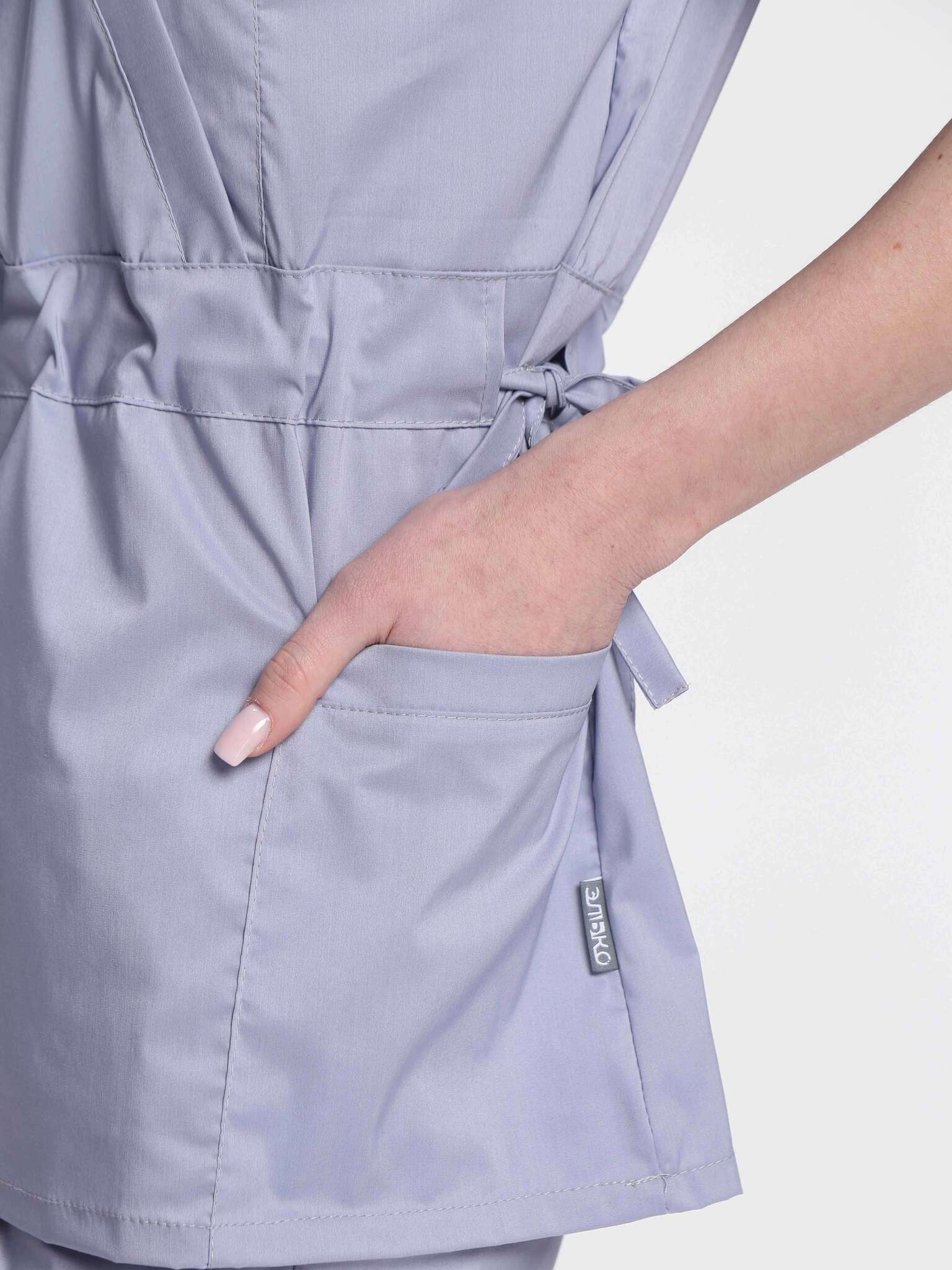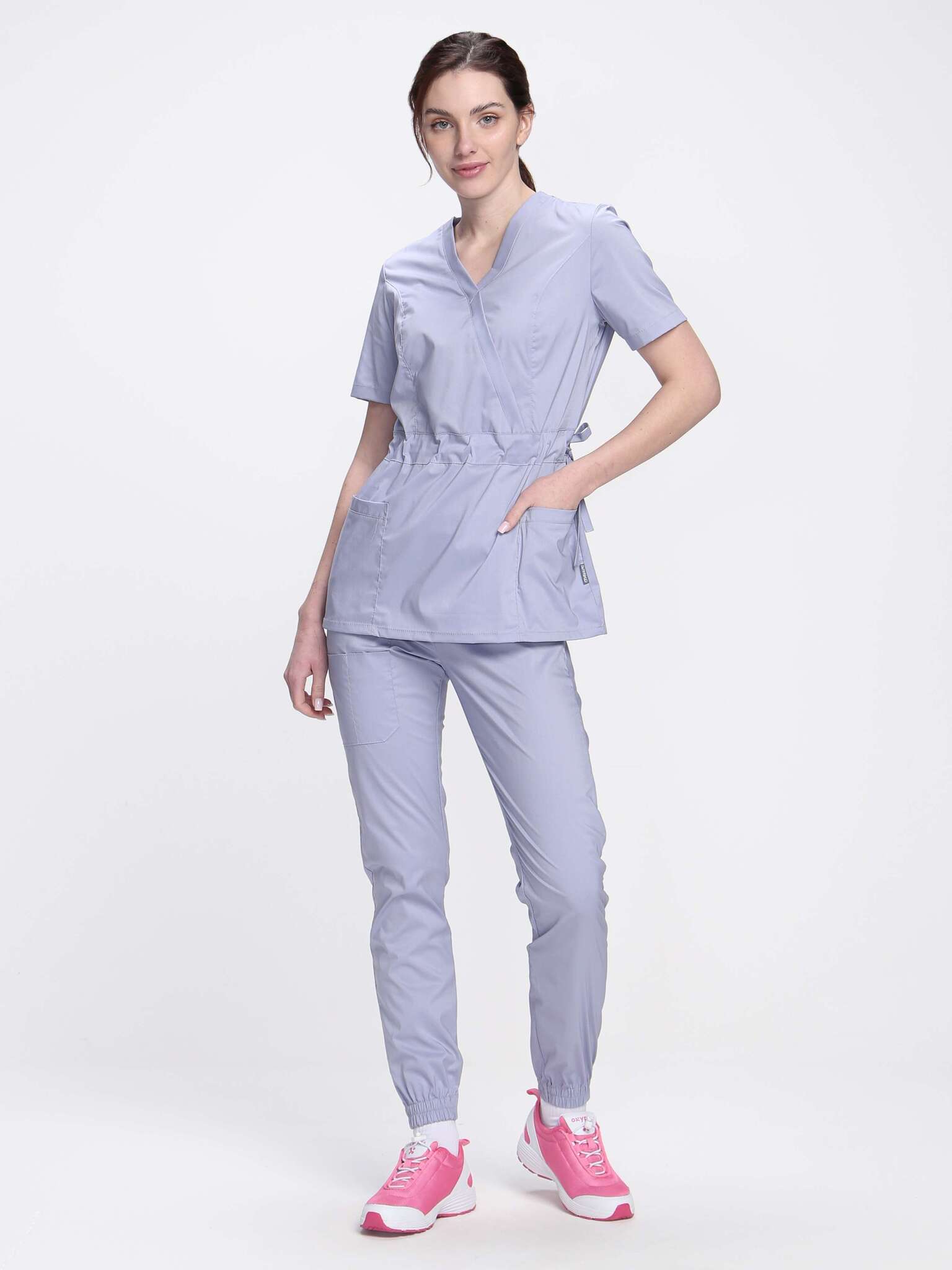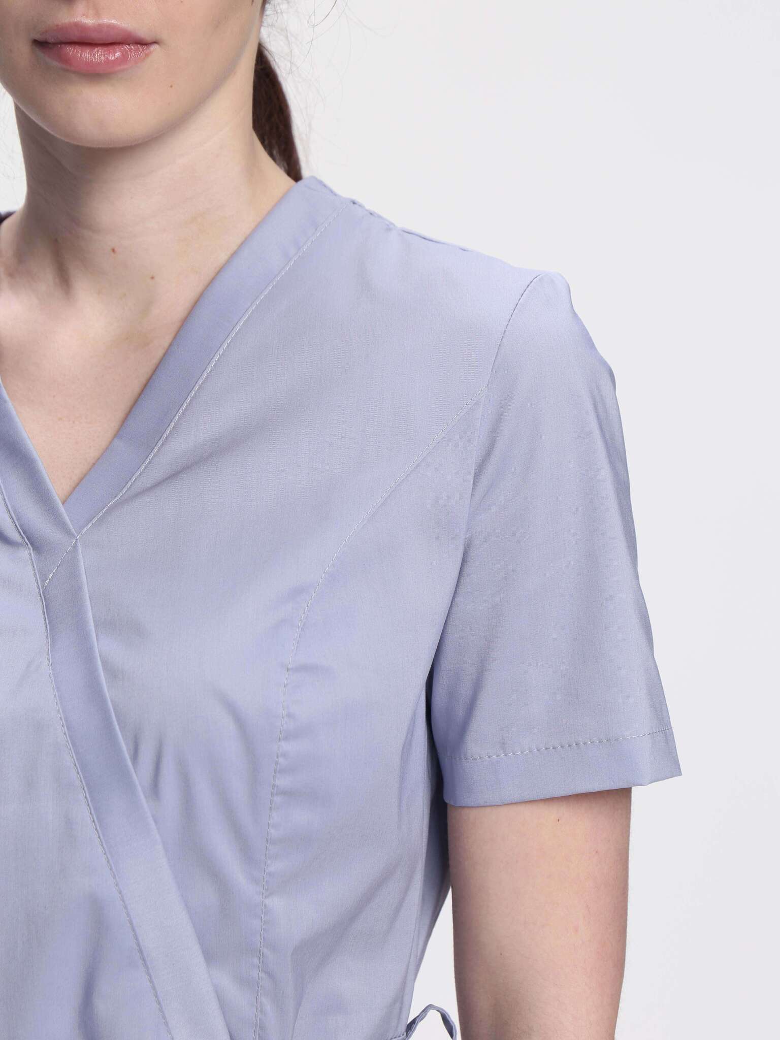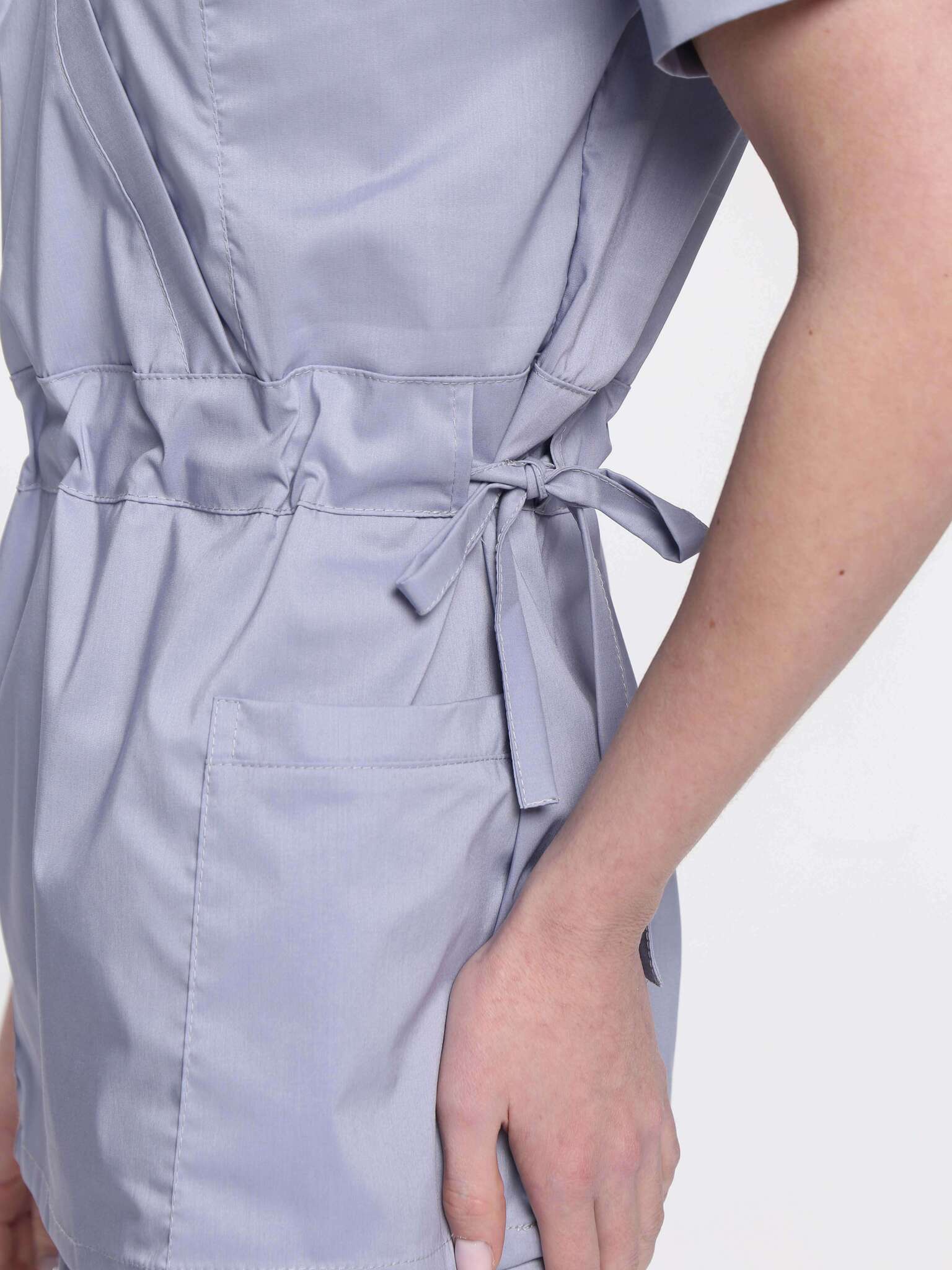 - Блуза: на запах с регулируемыми завязками по линии талии, коротким рукавом и двумя боковыми карманами; удлиненная модель обеспечивает дополнительный комфорт.