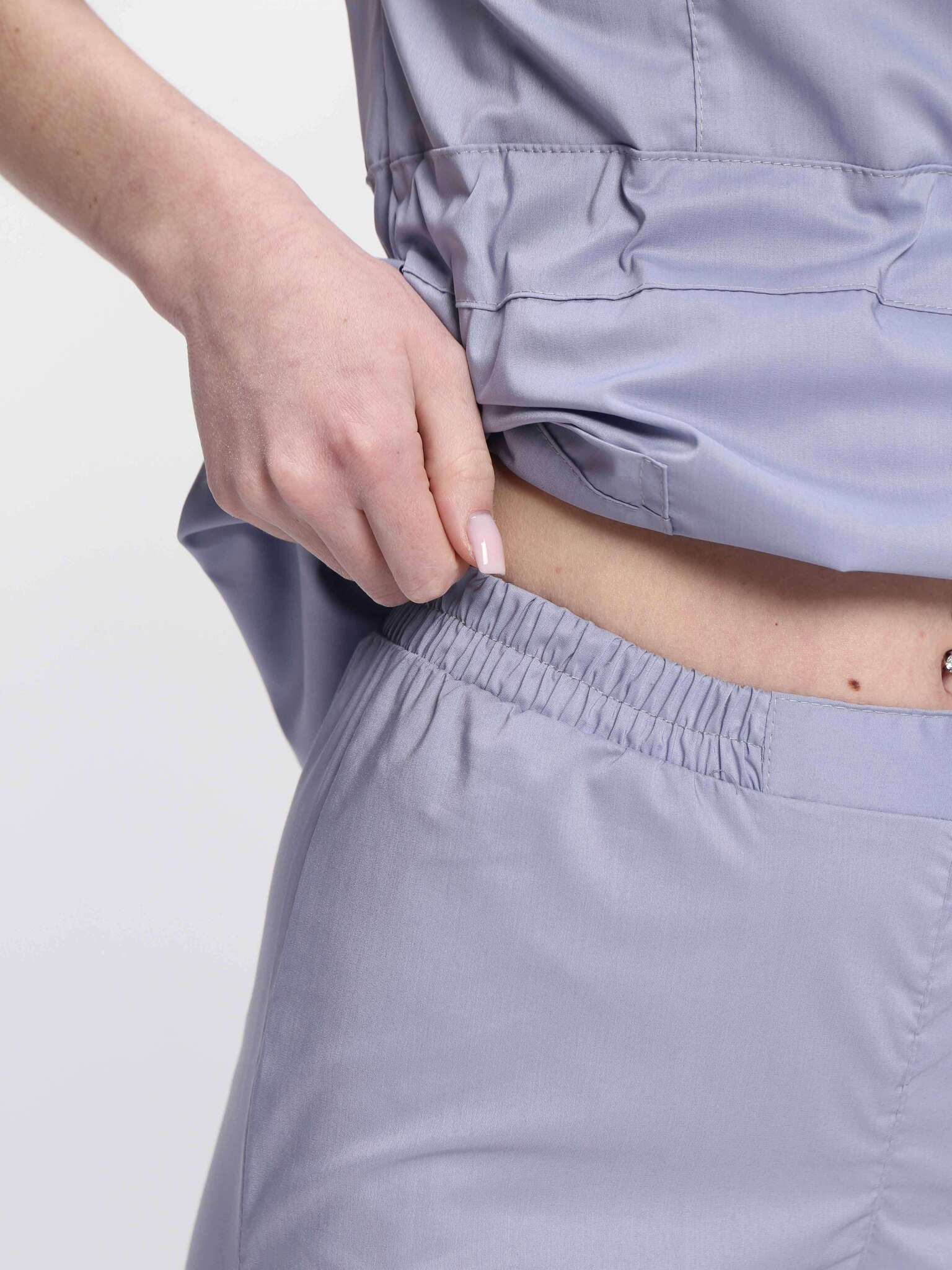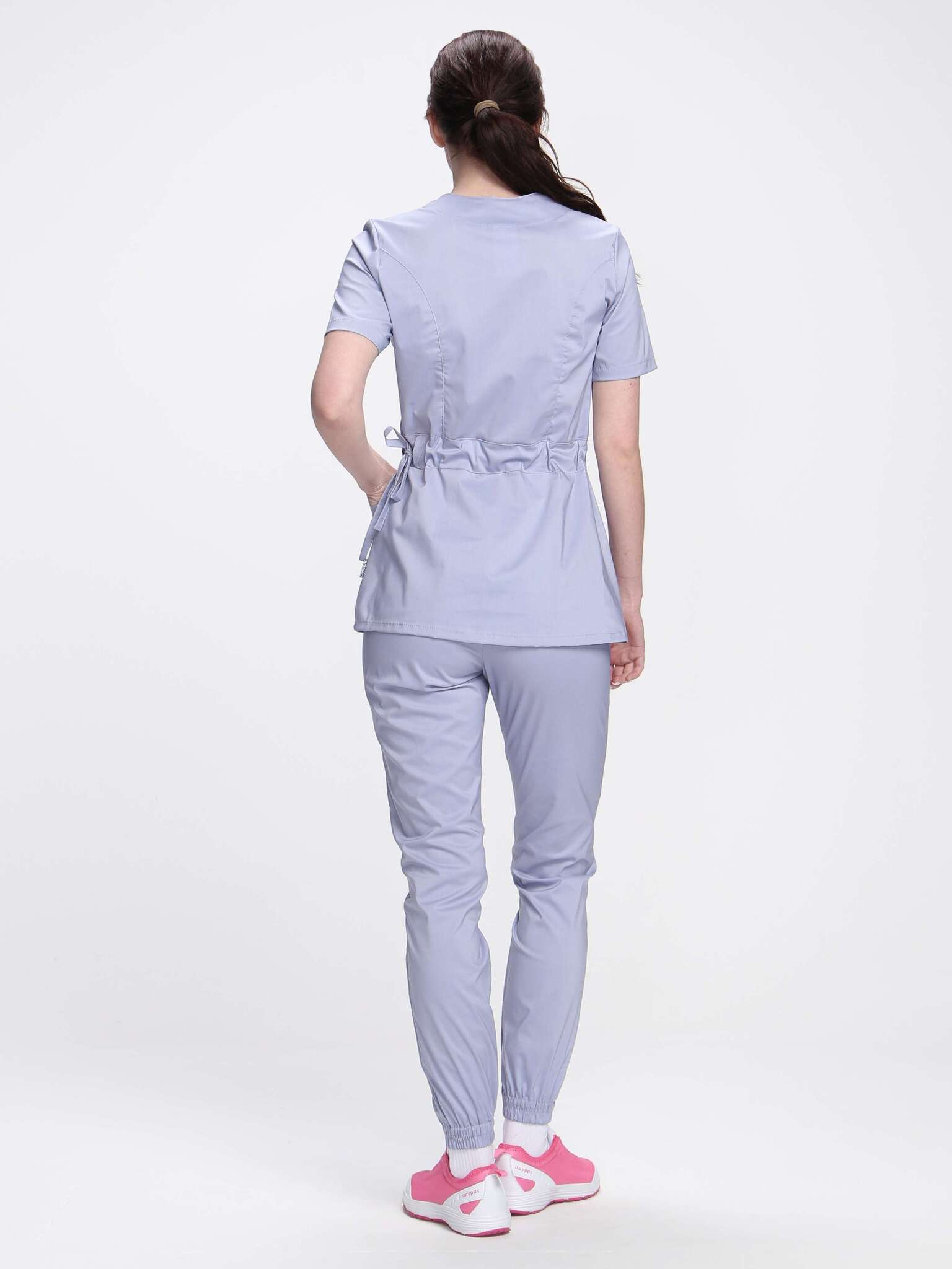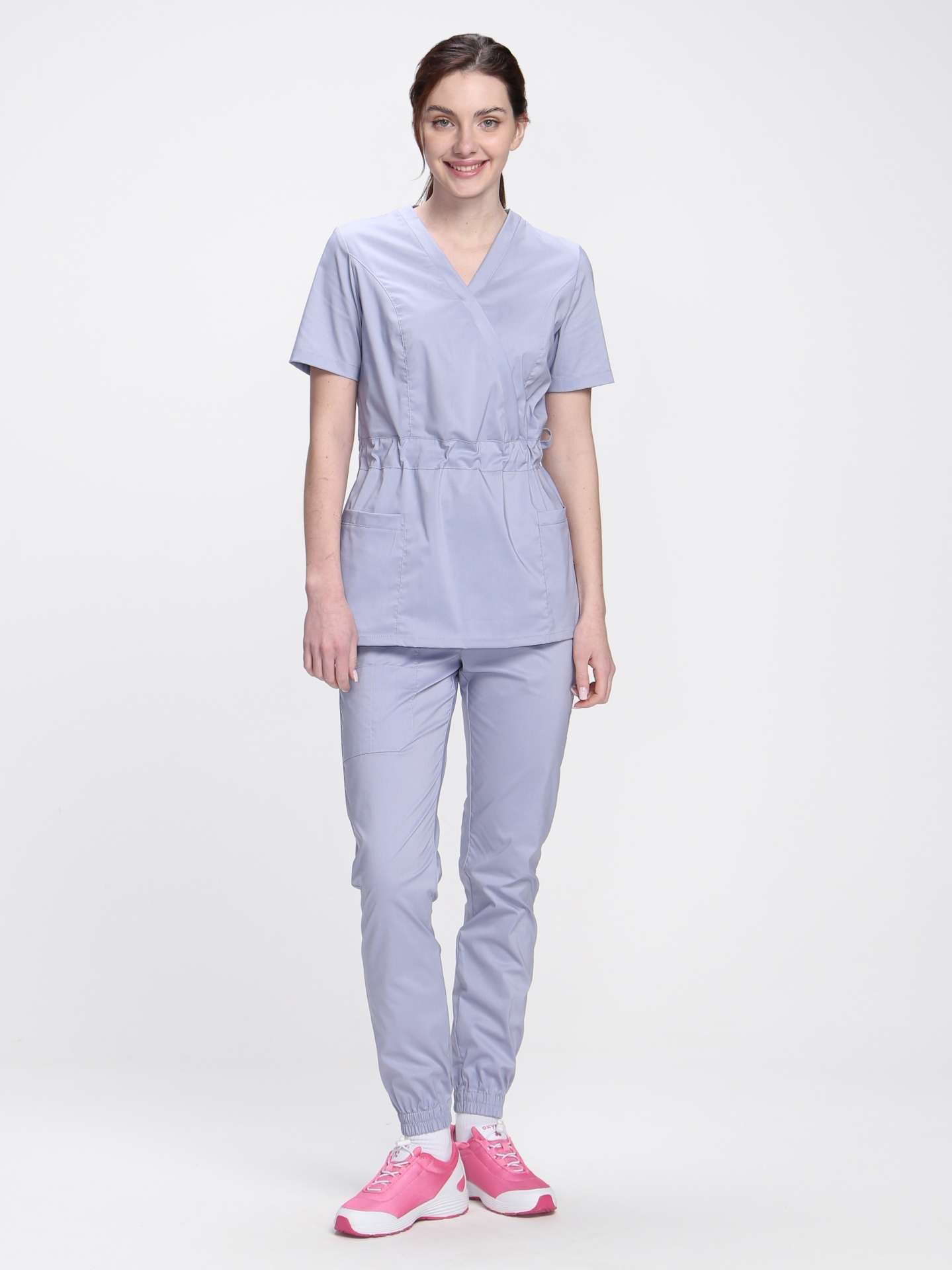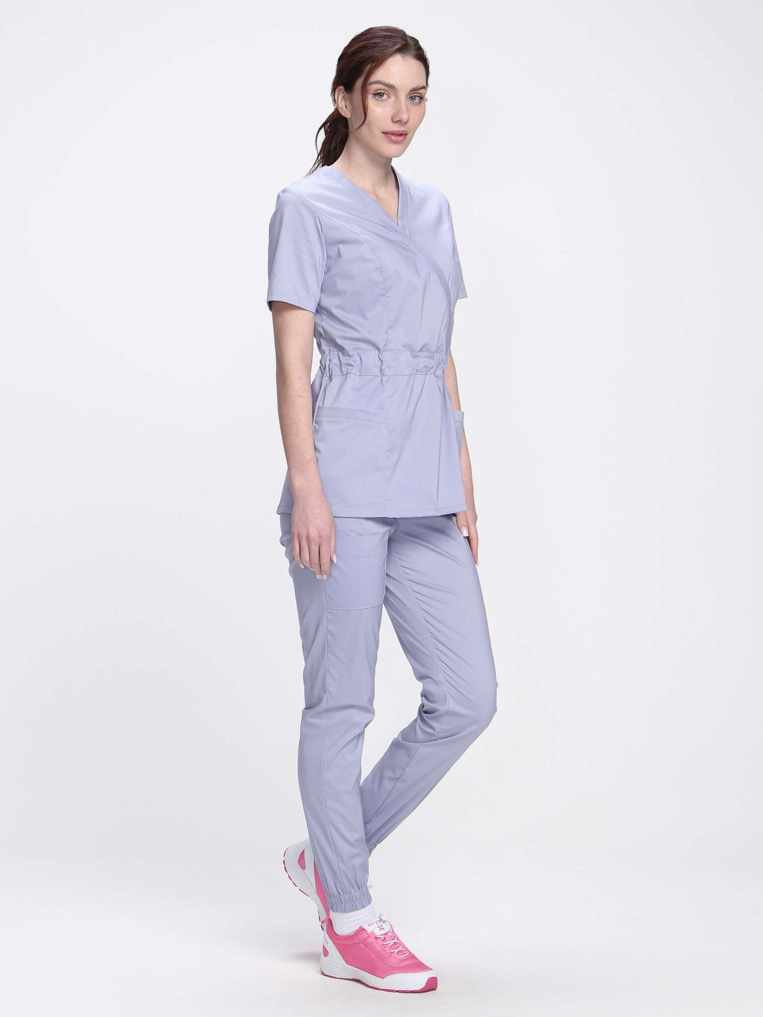 - Блуза: на запах с регулируемыми завязками по линии талии, коротким рукавом и двумя боковыми карманами; удлиненная модель обеспечивает дополнительный комфорт.
