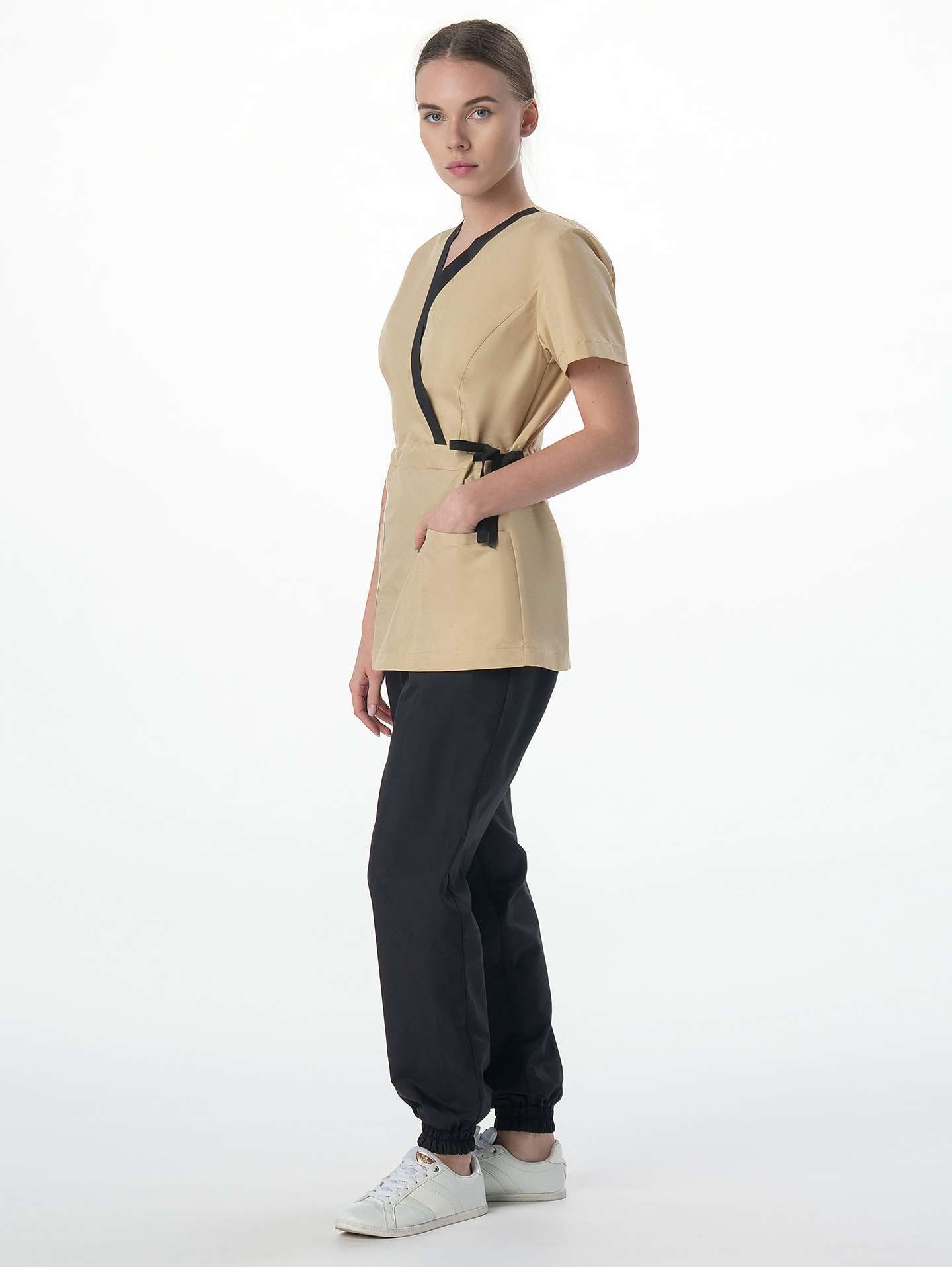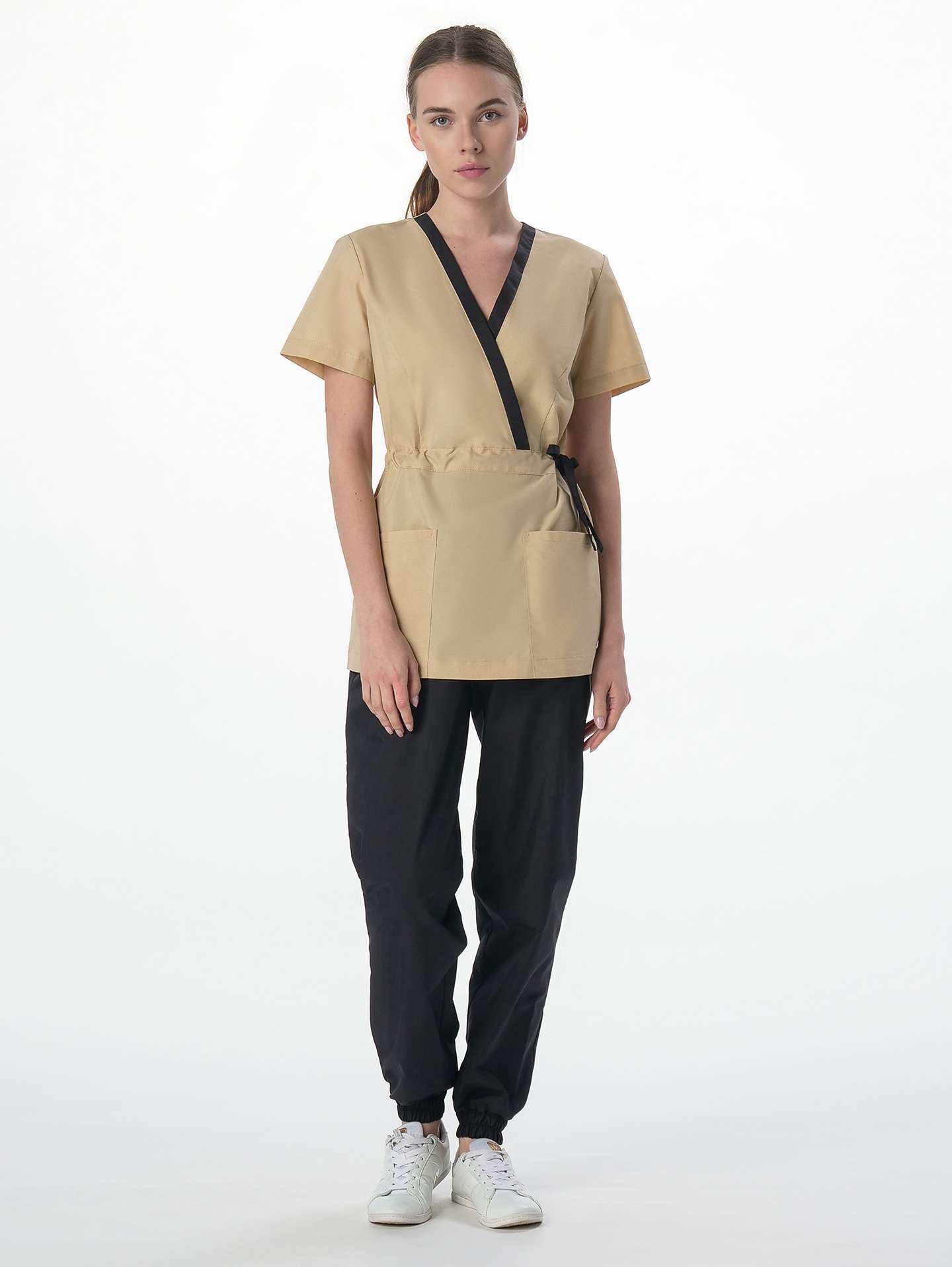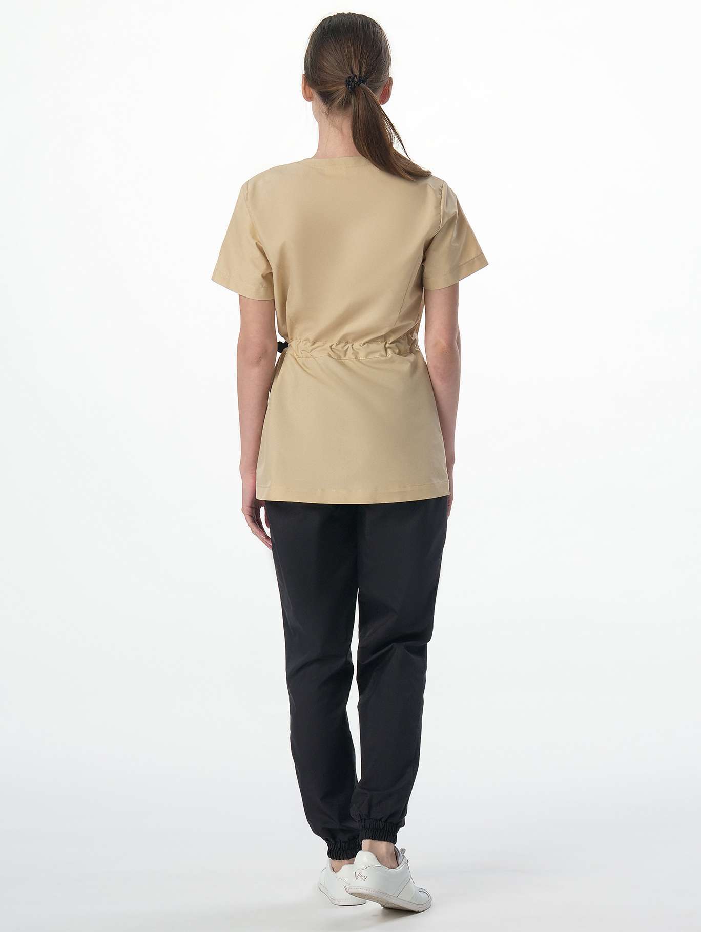 - Блуза: полуприлегающего силуэта с кулисой по линии талии для регулировки ширины, что позволяет адаптировать изделие под индивидуальные параметры. Вместительные карманы на нижней части блузы обеспечивают удобное хранение необходимых мелочей. Короткие рукава добавляют легкости и удобства в движениях.