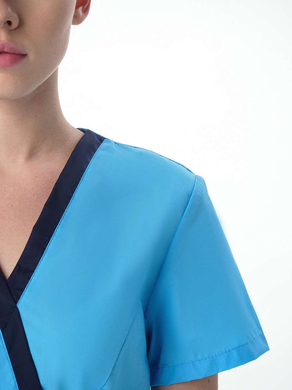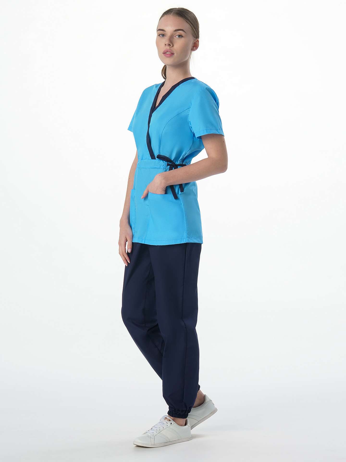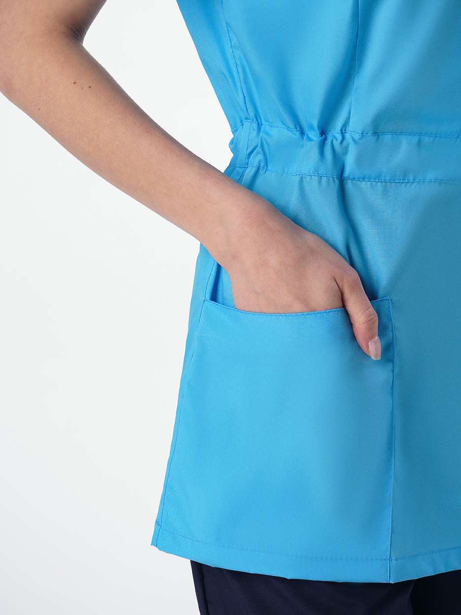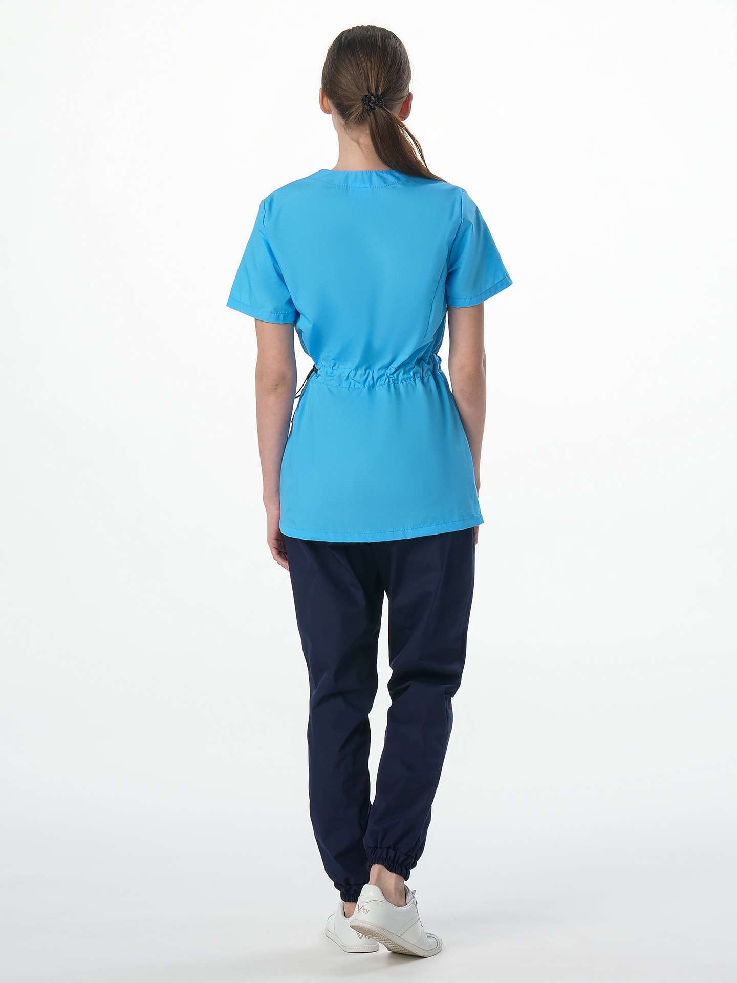 - Блуза: полуприлегающего силуэта с кулисой для регулировки ширины, вместительными карманами и короткими рукавами.