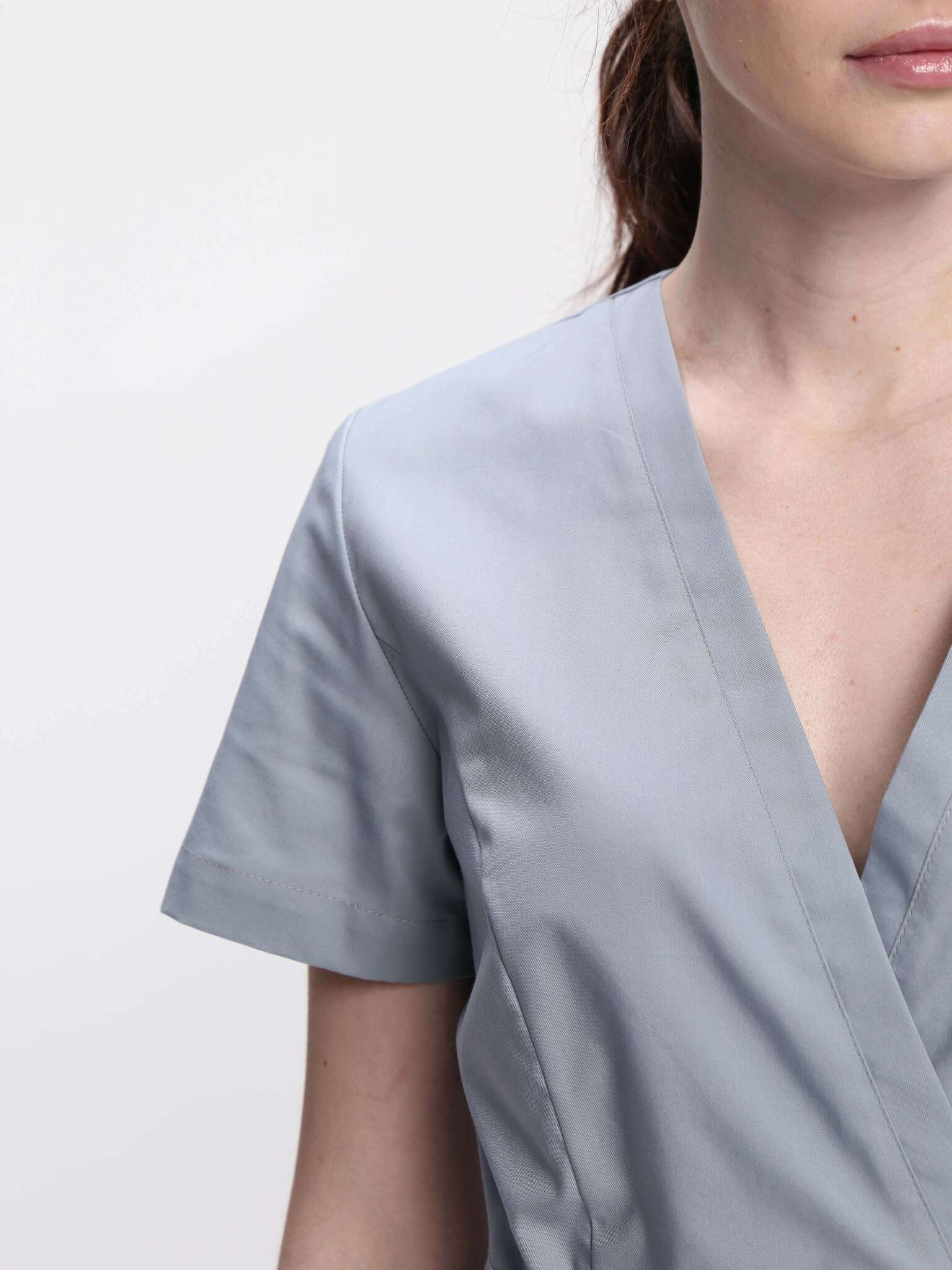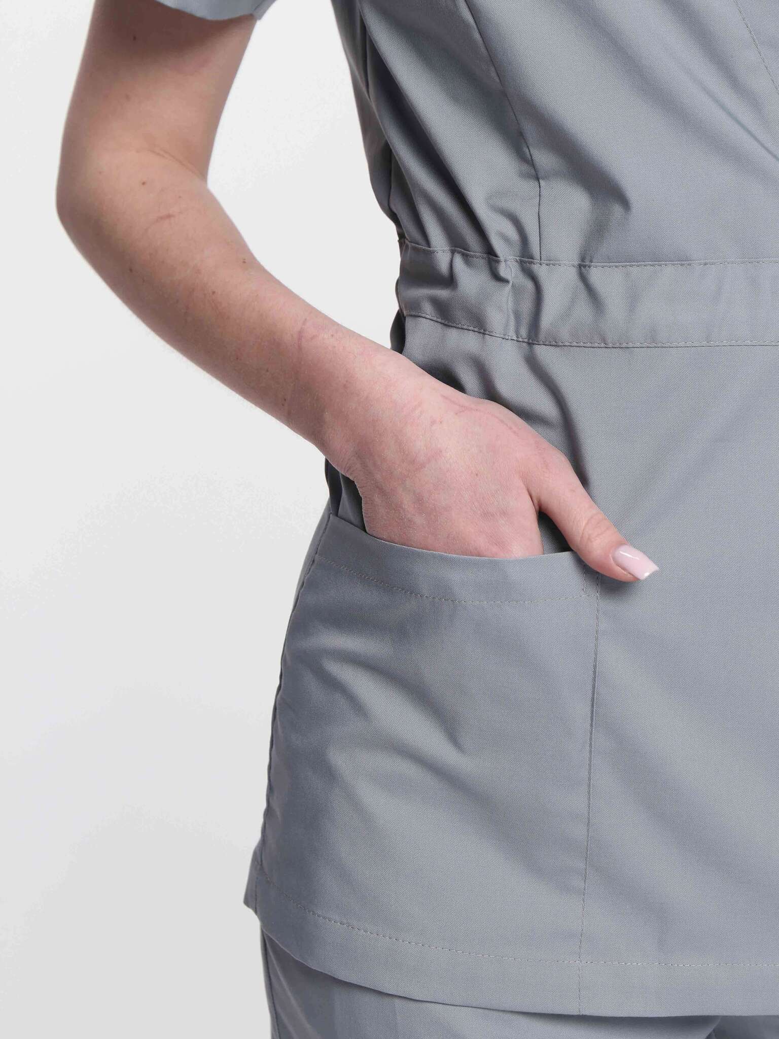 - Блуза: Полуприлегающего силуэта с кулисой по линии талии для регулировки ширины, вместительными карманами и короткими рукавами.