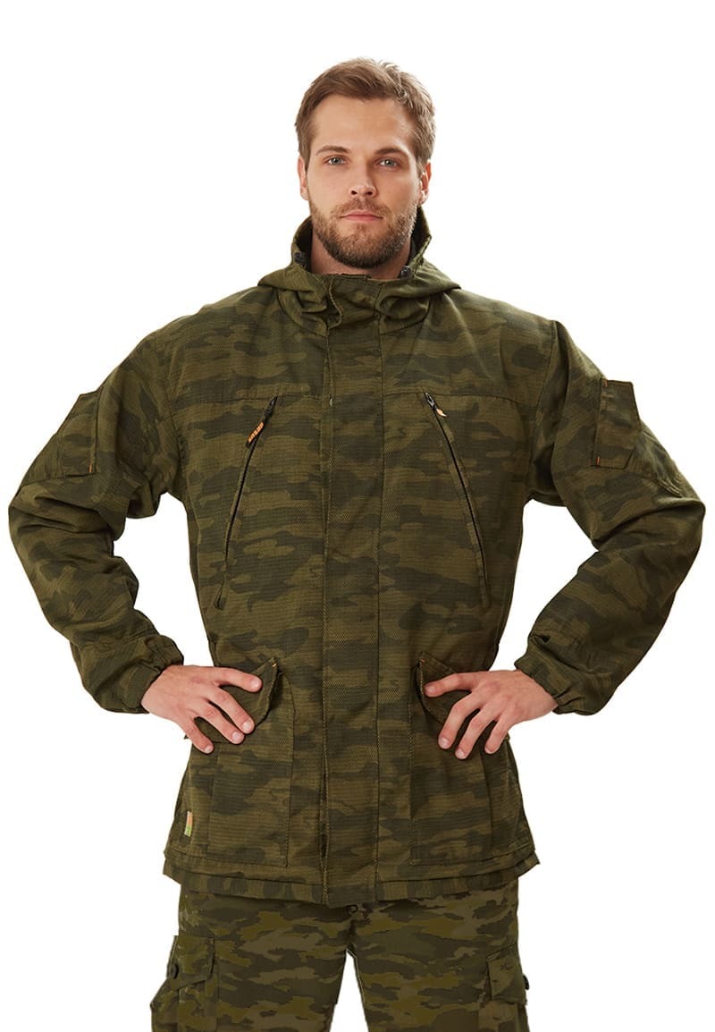 - Куртка: свободного кроя, удлиненная, с подкладкой из сетки для комфортного ношения. Центральная застежка на молнии защищена ветрозащитным клапаном.