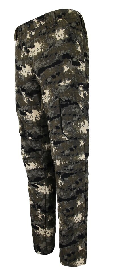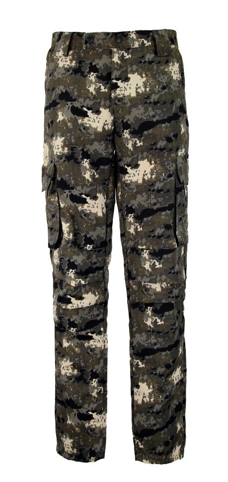 - Брюки: анатомический крой, поясная резинка для регулировки объема, усиленные колени, два боковых кармана и два кармана с отделкой.