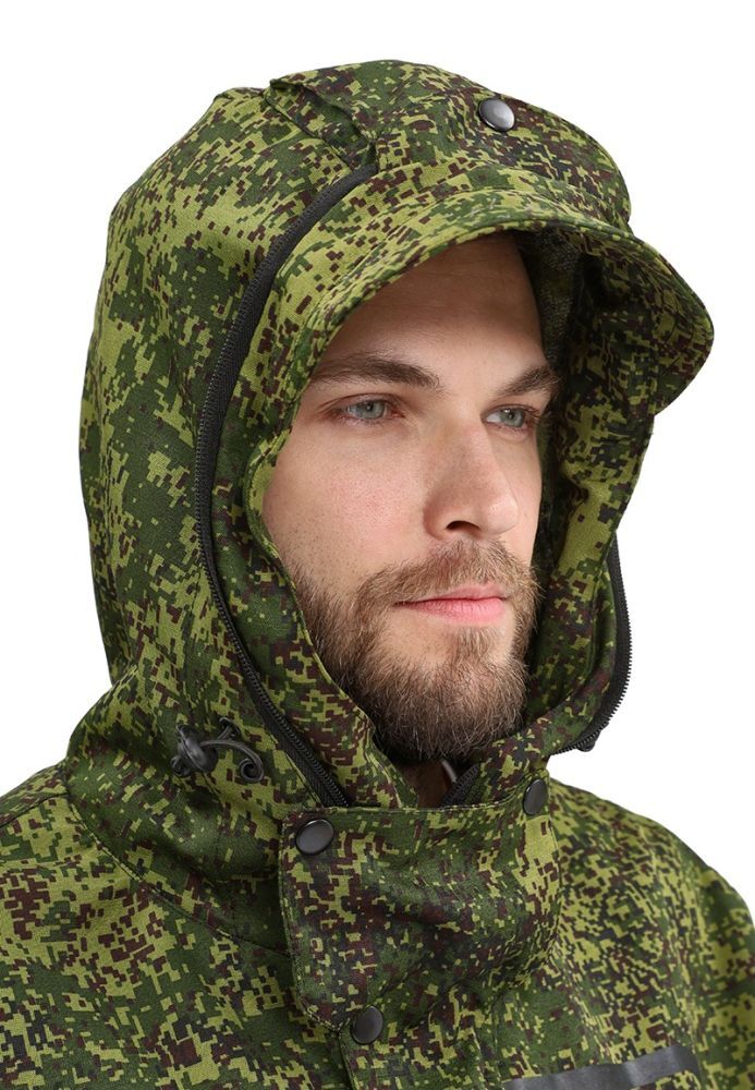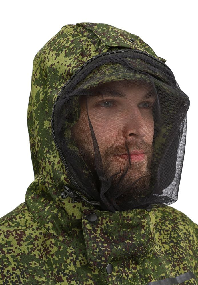 - Капюшон: сложной конструкции с козырьком, предотвращающим попадание насекомых под одежду. Регулируется по лицевой и затылочной части.
