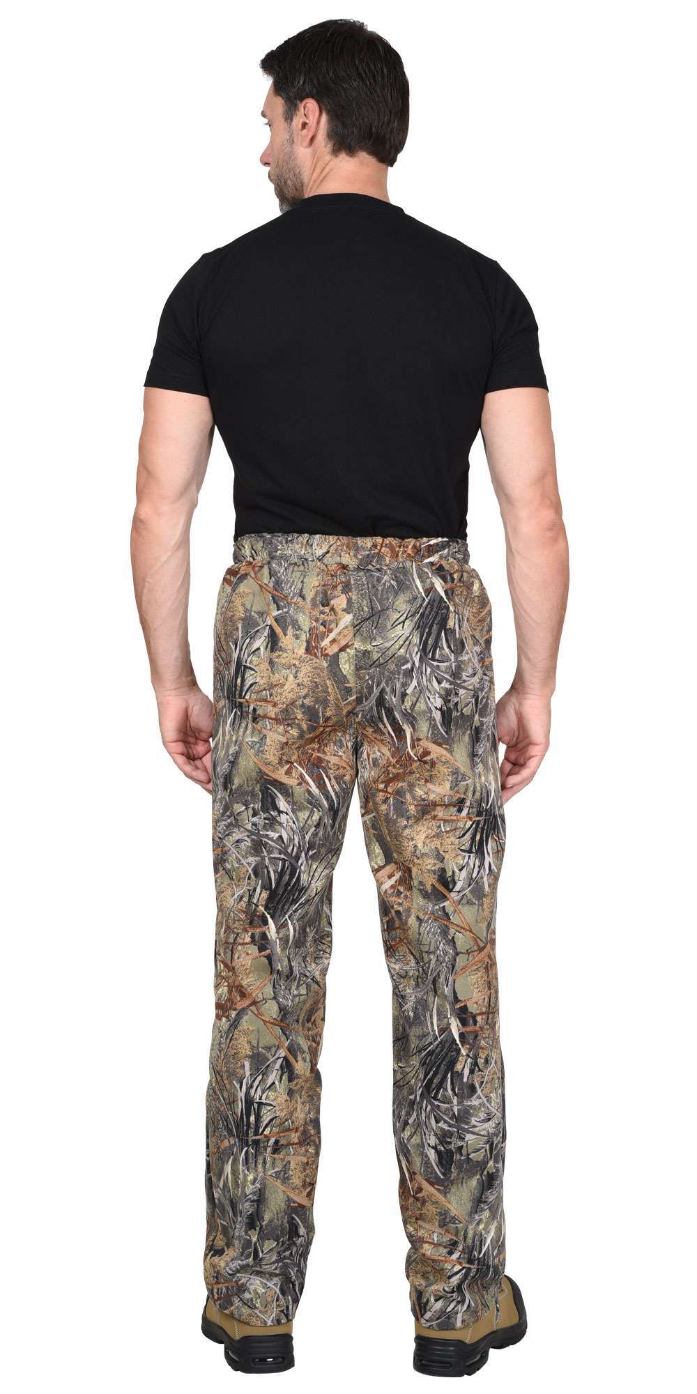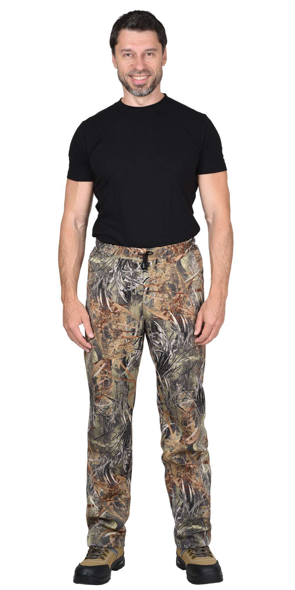 - Брюки: Прямого силуэта с боковыми карманами, без застежки и с притачным поясом, который стягивается на эластичную тесьму.