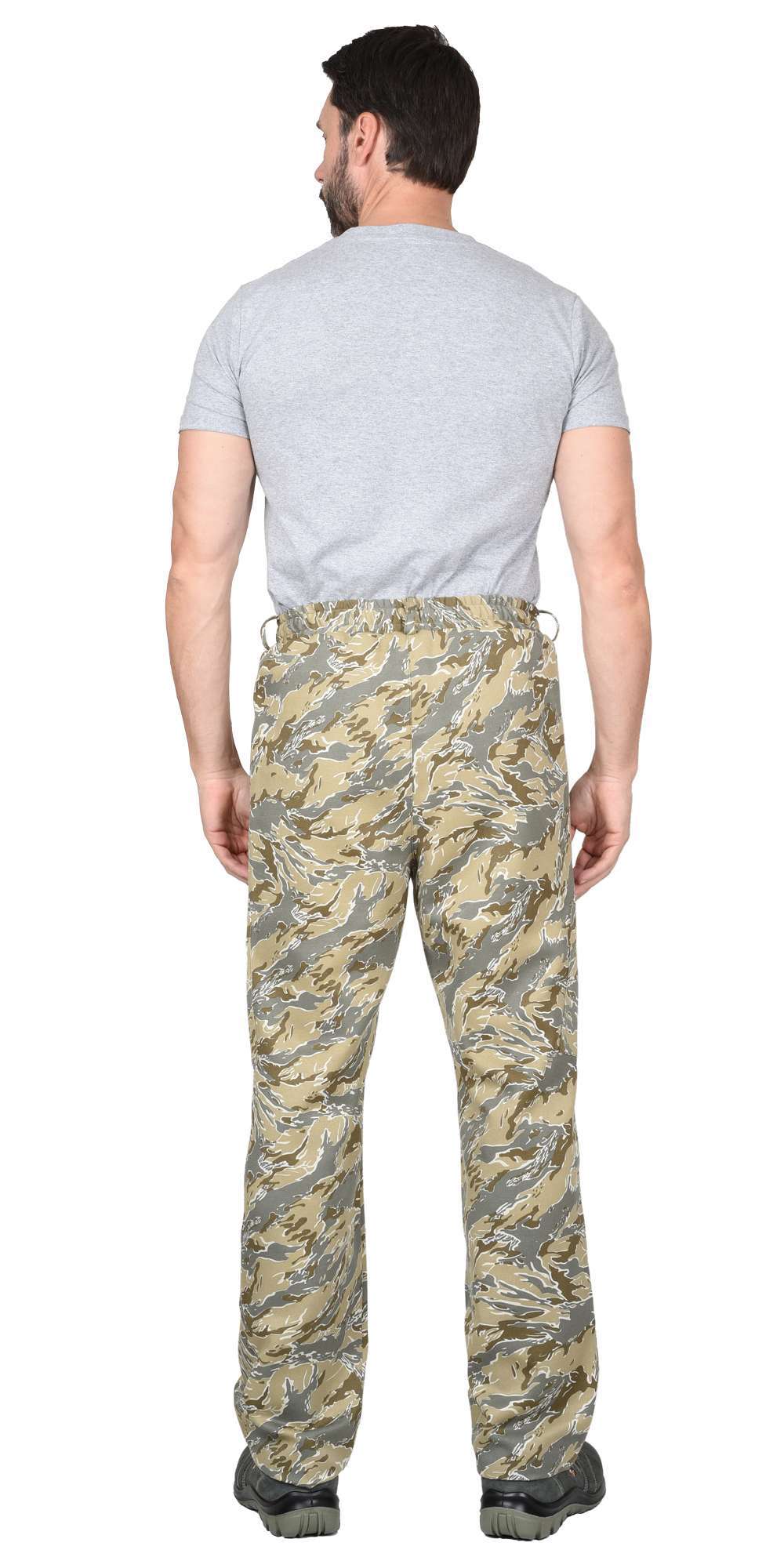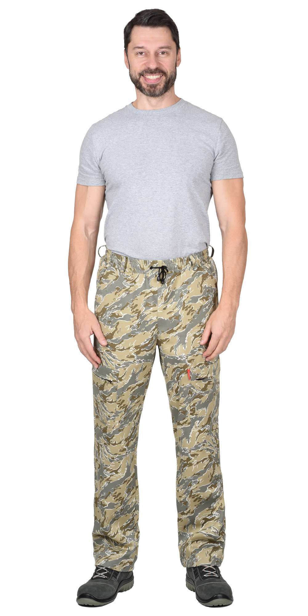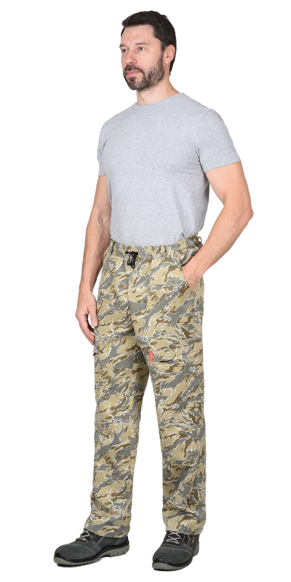 - Брюки: Прямой силуэт, боковые внутренние карманы, притачной пояс с эластичной тесьмой.
