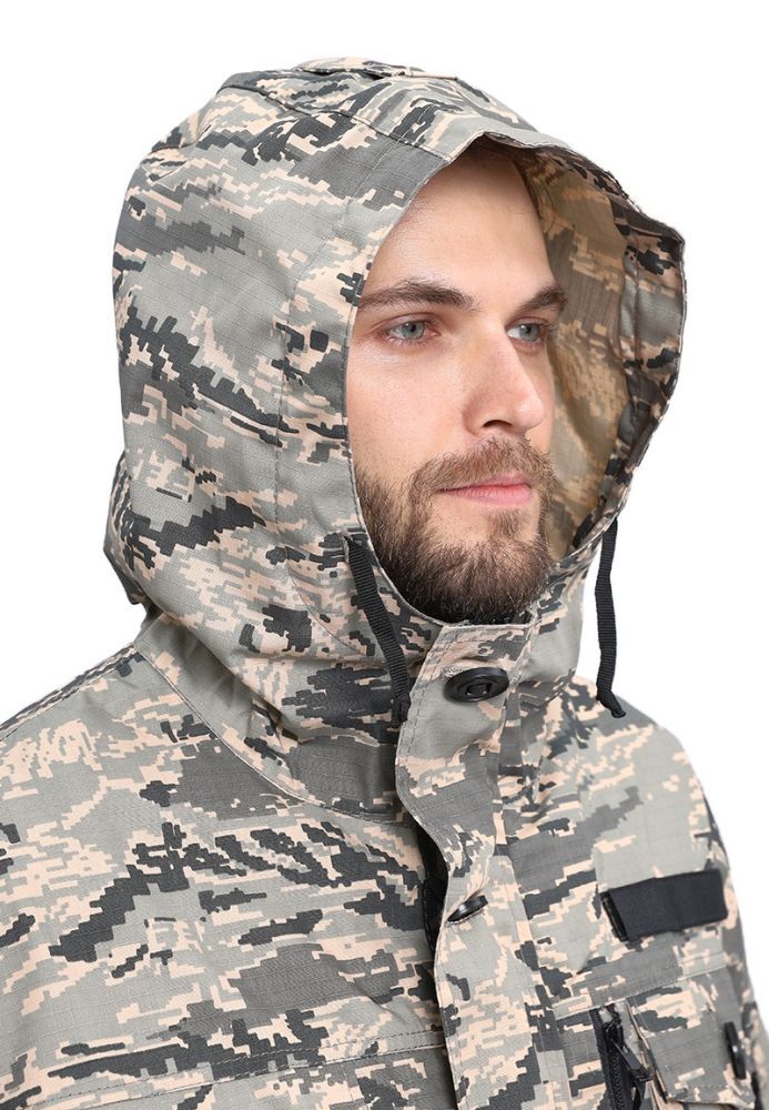 - Капюшон: Цельнокрайний, регулируемый по лицевой части лентой и на затылке липучкой и резинкой.