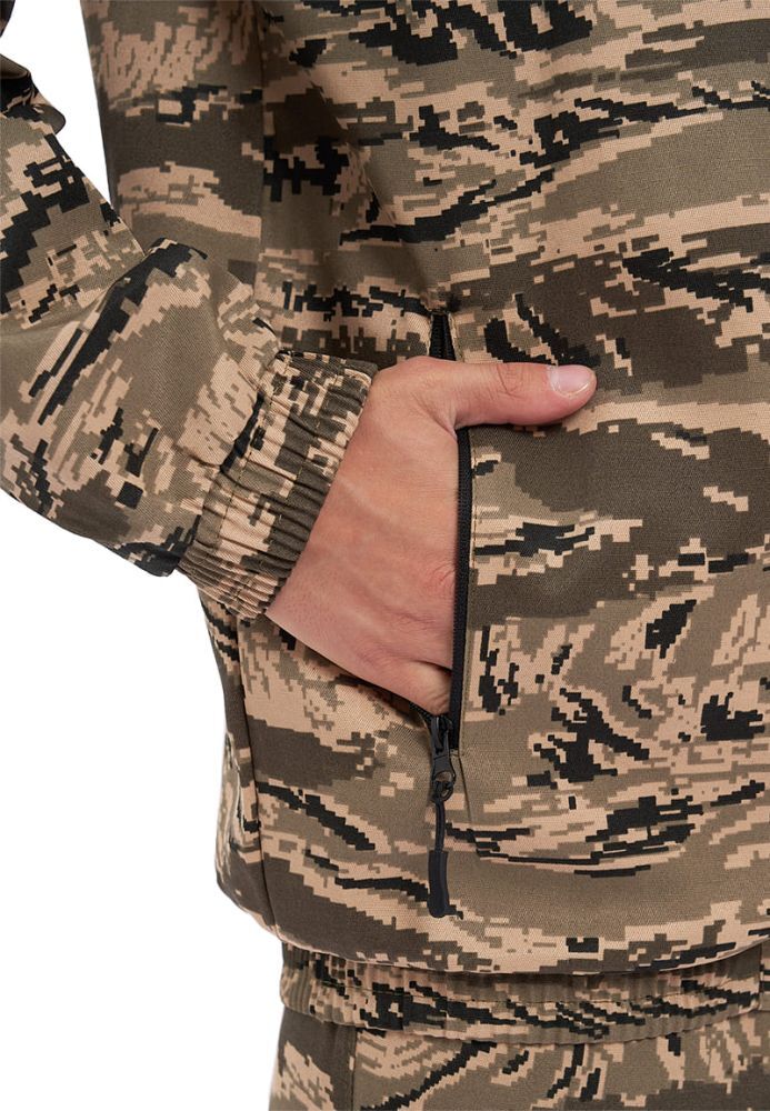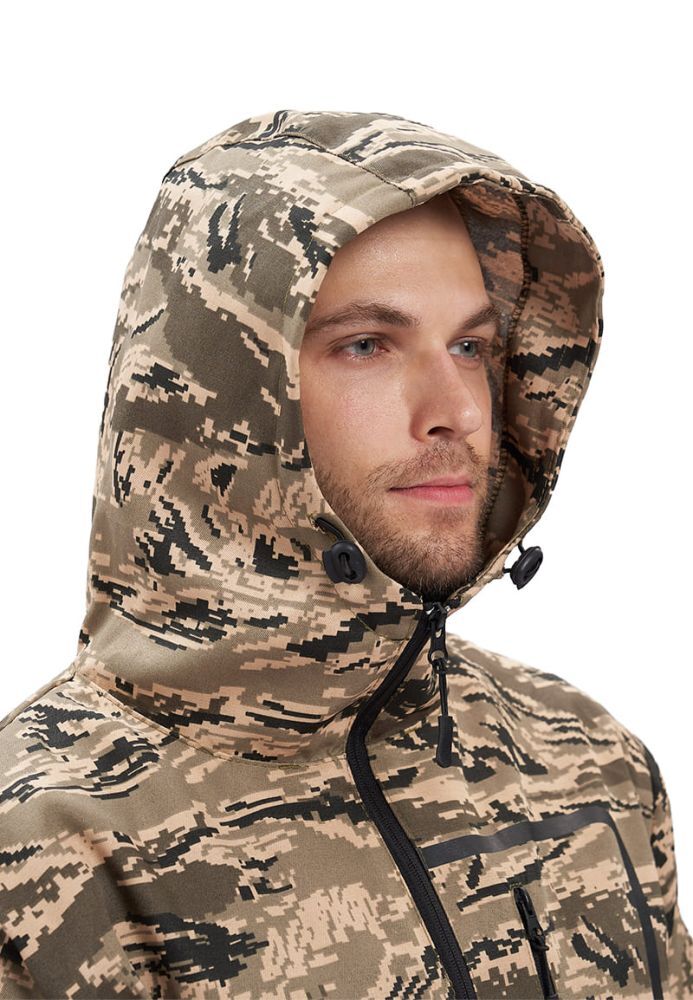 - Материалы: костюм изготовлен из смесовой ткани (70% полиэфир, 30% хлопок) с плотностью 200 г/м² и водоотталкивающей пропиткой, что делает его идеальным для использования в различных погодных условиях.