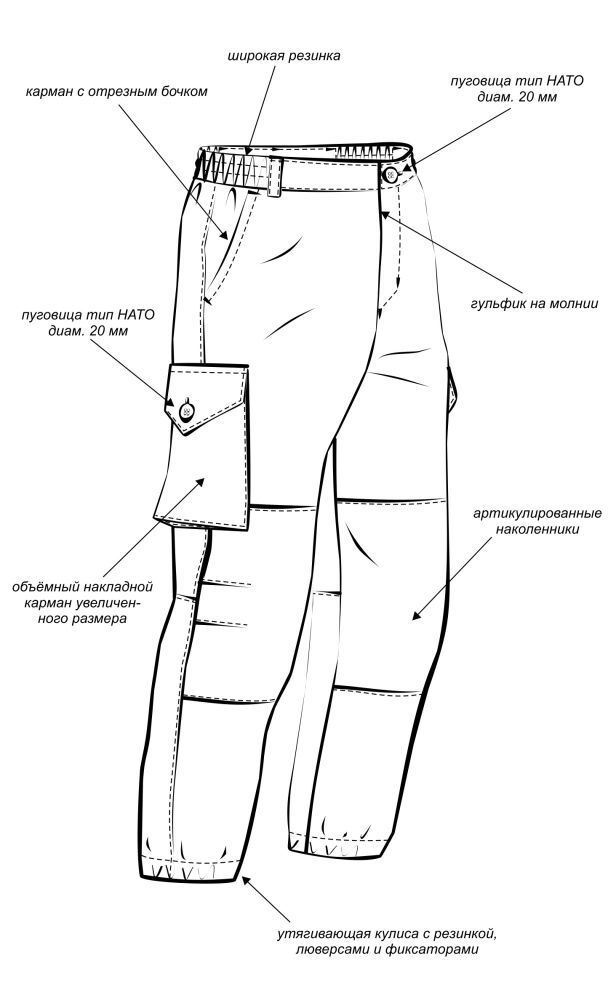 - Брюки: прямые, с частичной фиксированной резинкой и объемными боковыми карманами, обеспечивающими удобство и функциональность.
