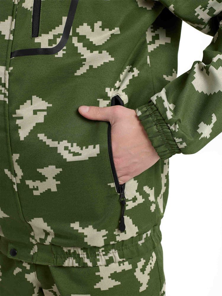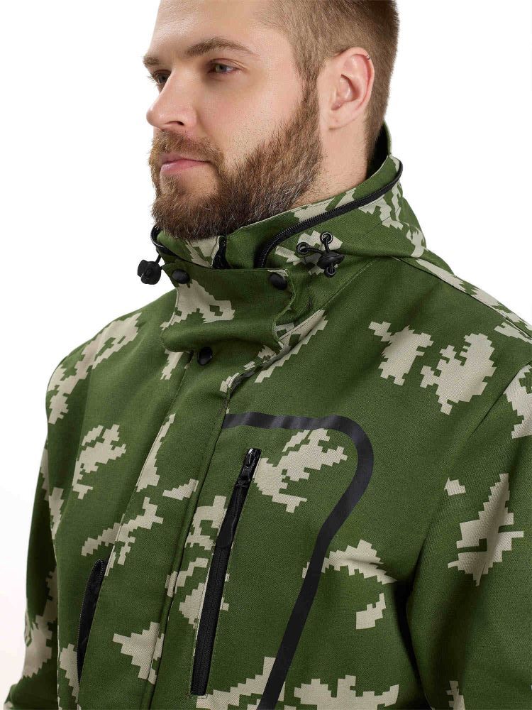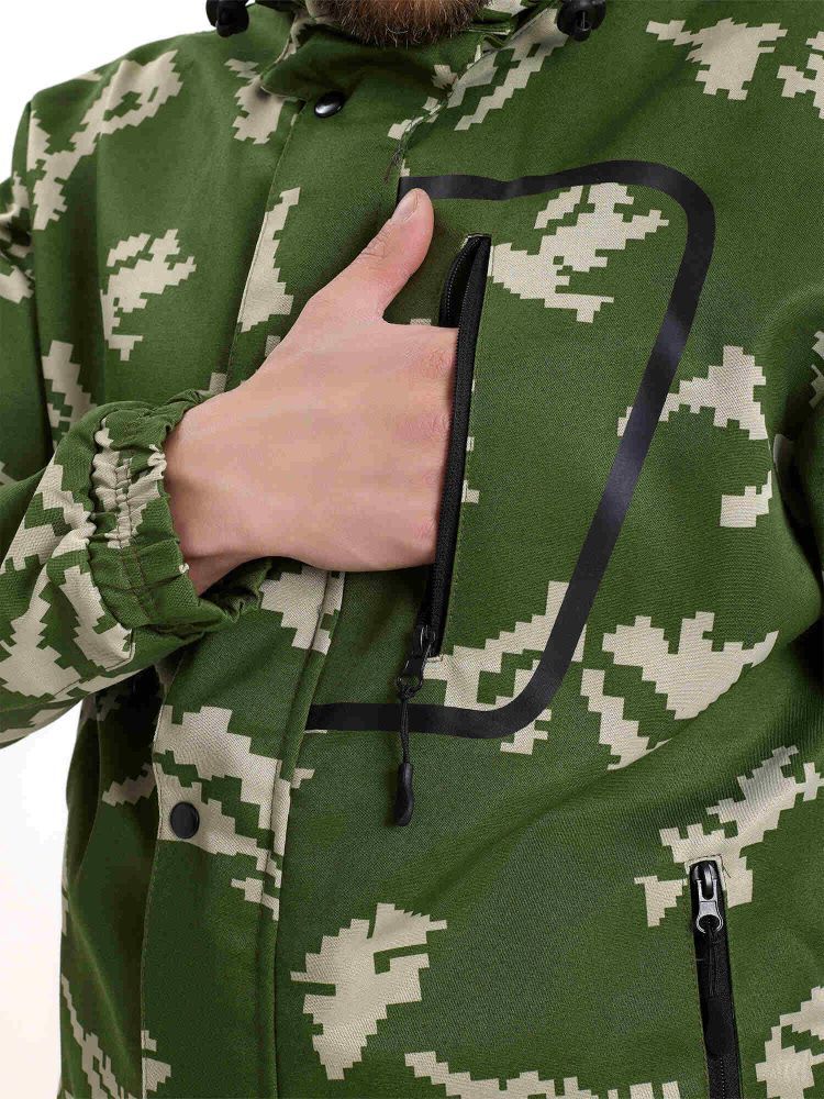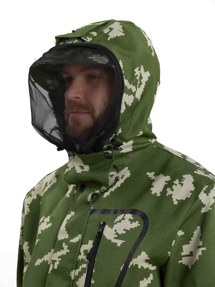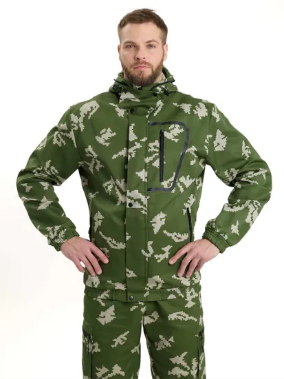 - Куртка: Укороченная с капюшоном, центральная застежка на молнии и ветрозащитный клапан на кнопках. Капюшон оснащен противомоскитной сеткой, которая убирается в карман и фиксируется клапаном.