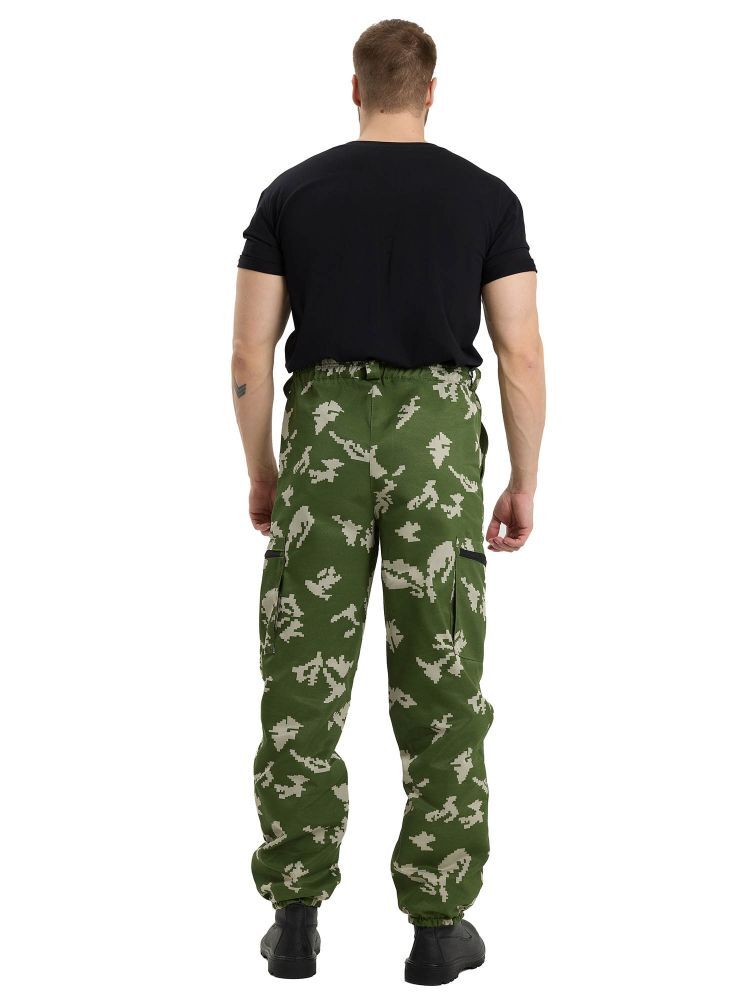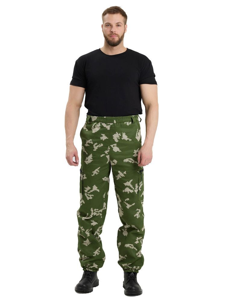- Брюки: Прямые с резинкой на поясе и шлевками для ремня, два кармана с наклонным входом и два накладных кармана на молнии.
