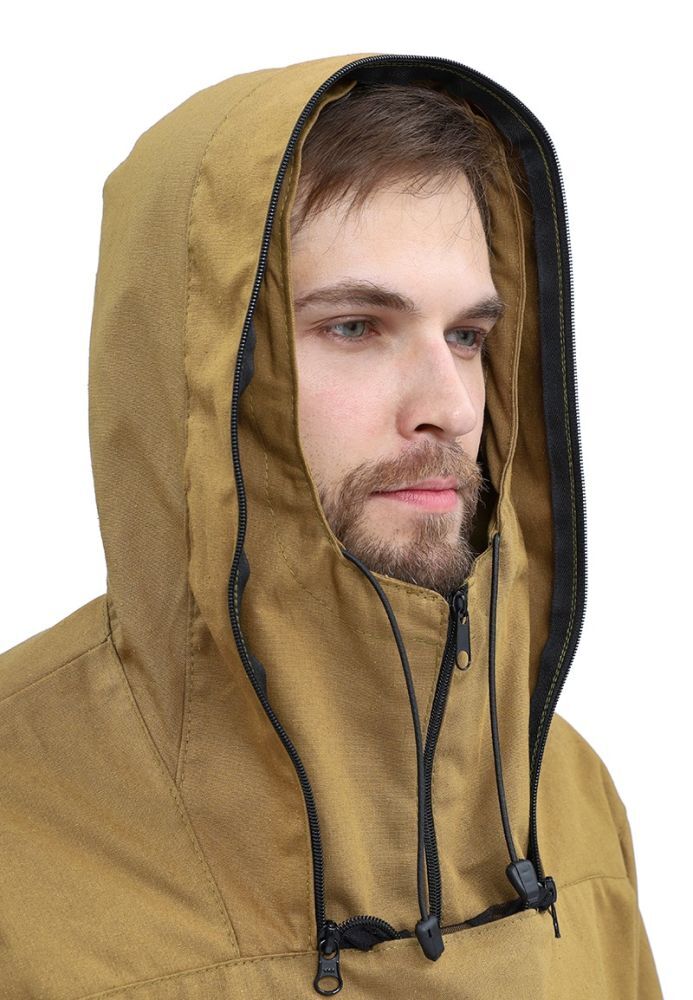 - Куртка: Прямого силуэта с застежкой на молнию и объемным несъемным капюшоном, регулируемым по объему.