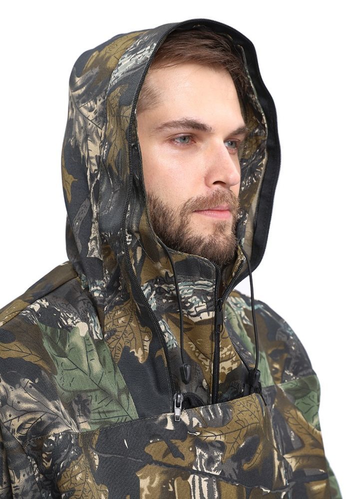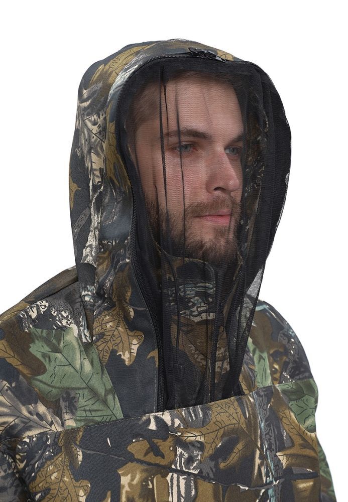 - Куртка: Прямого силуэта с объемным несъемным капюшоном, оснащенным противомоскитной сеткой, что позволяет защитить лицо от насекомых.
