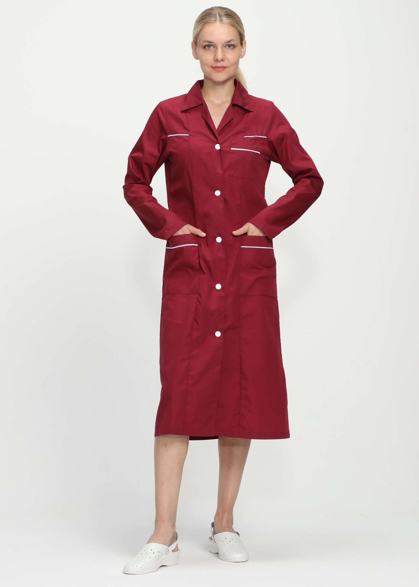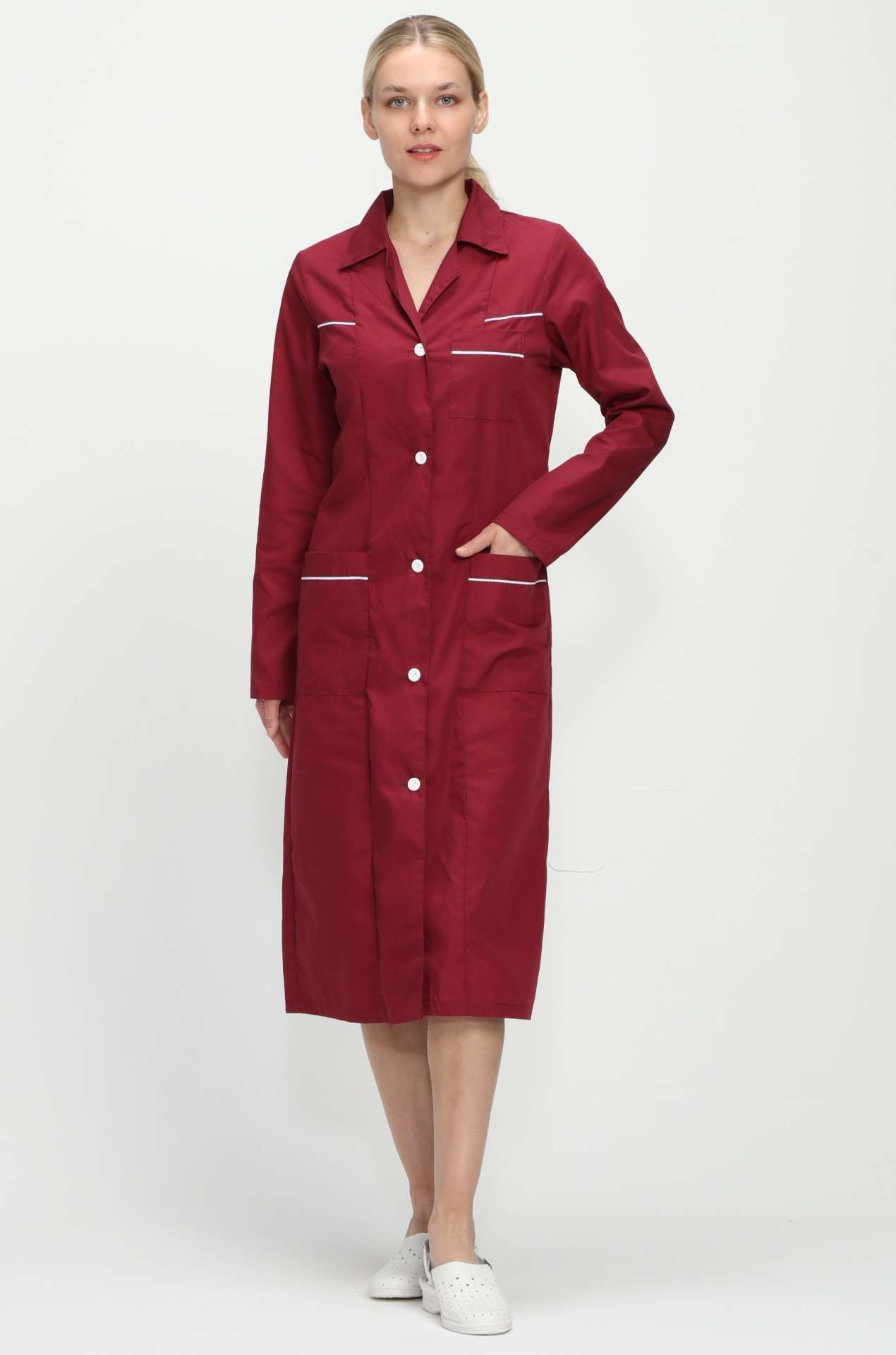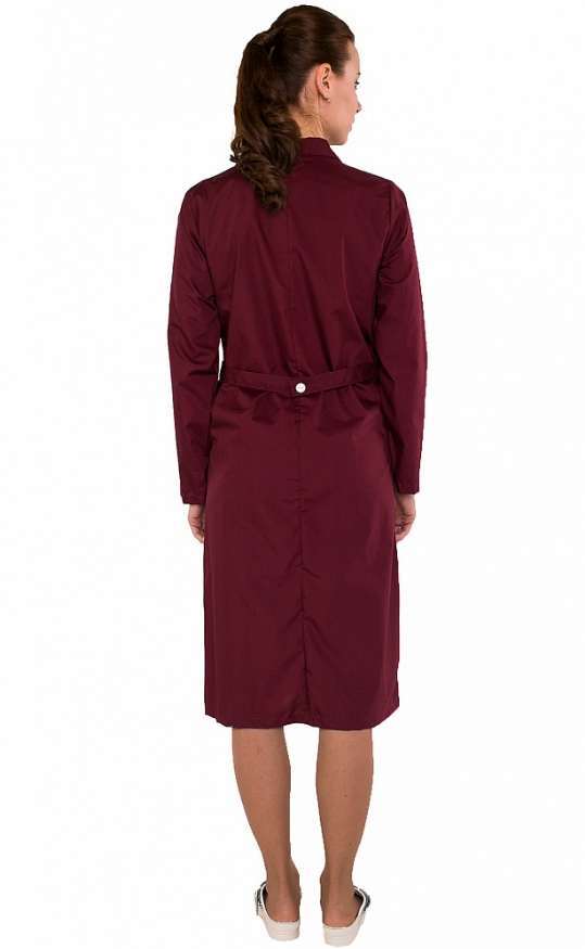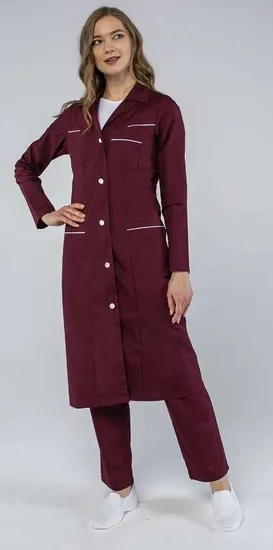 Халат «Диана» – это стильный и функциональный элемент униформы для женщин, который сочетает в себе комфорт и элегантность. Изготовленный из качественных материалов, он обеспечивает удобство в повседневной работе и создает профессиональный имидж. Бордовый цвет придает изделию особый шарм, а контрастные белые акценты делают его еще более привлекательным.