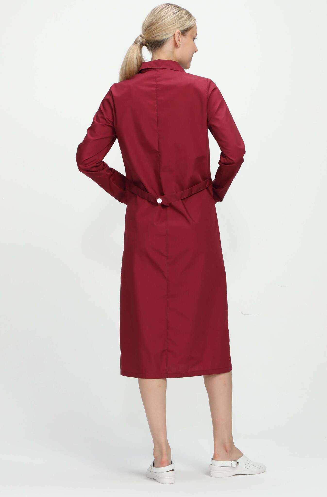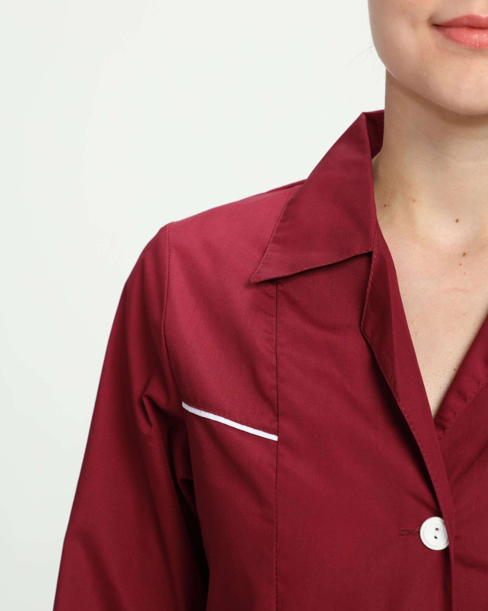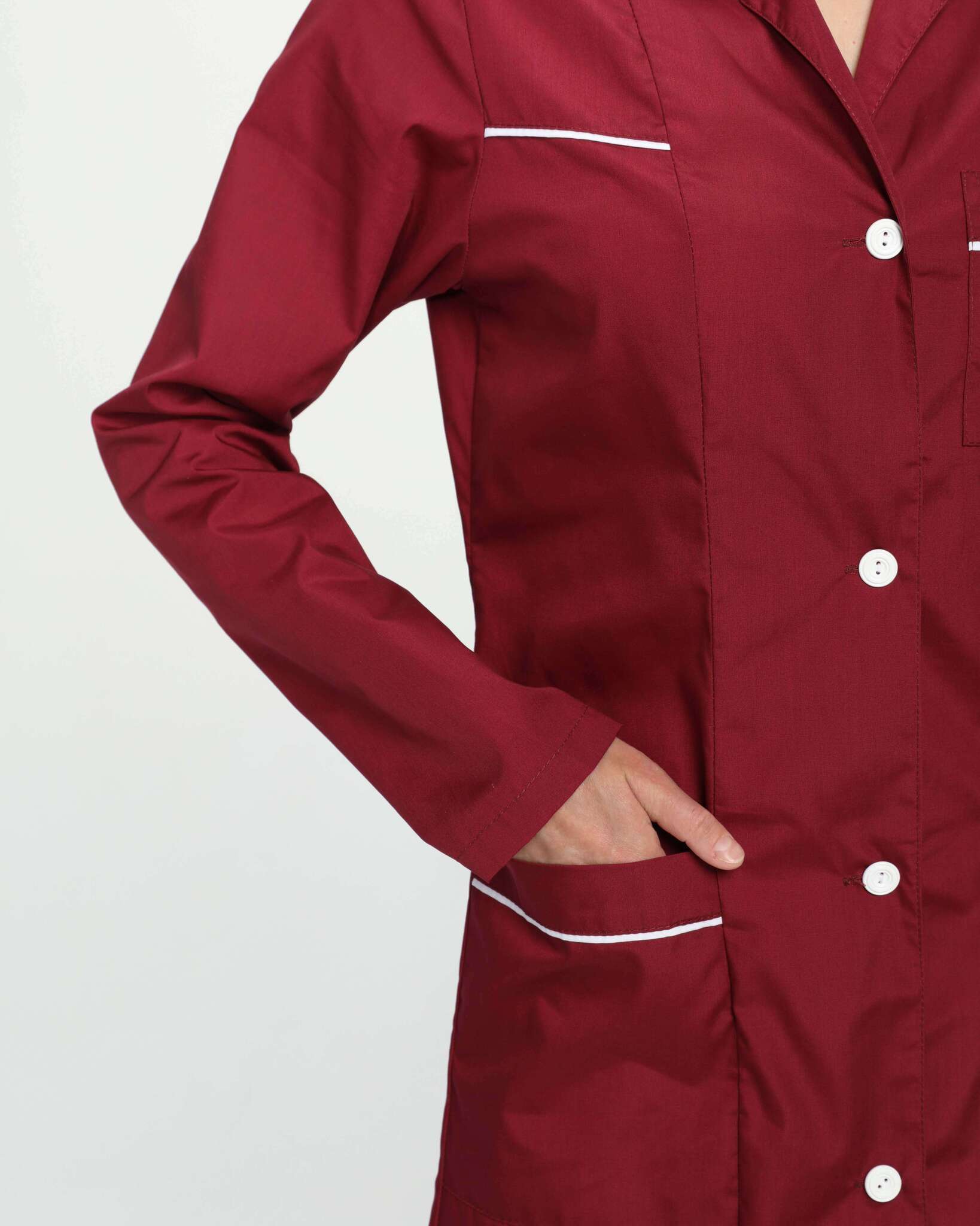 Халат «Диана» – это стильный и функциональный элемент униформы для женщин, который сочетает в себе комфорт и элегантность. Изготовленный из качественных материалов, он обеспечивает удобство в повседневной работе и создает профессиональный имидж. Бордовый цвет придает изделию особый шарм, а контрастные белые акценты делают его еще более привлекательным.