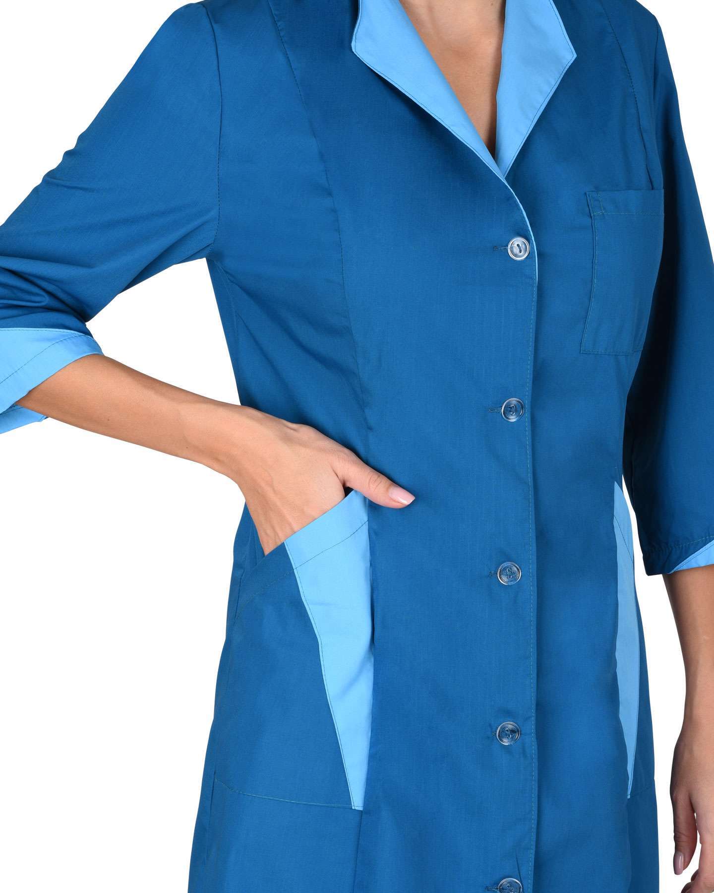 Представляем вашему вниманию халат СИРИУС-МАРЛЕН, который идеально сочетает в себе стиль, комфорт и функциональность. Этот халат полуприлегающего силуэта, слегка расширенный к низу, обеспечивает свободу движений и удобство в носке. Застежка на пуговицы и рельефы добавляют ему элегантности, а отделка воротника и карманов голубым цветом придает изделию изысканный вид.