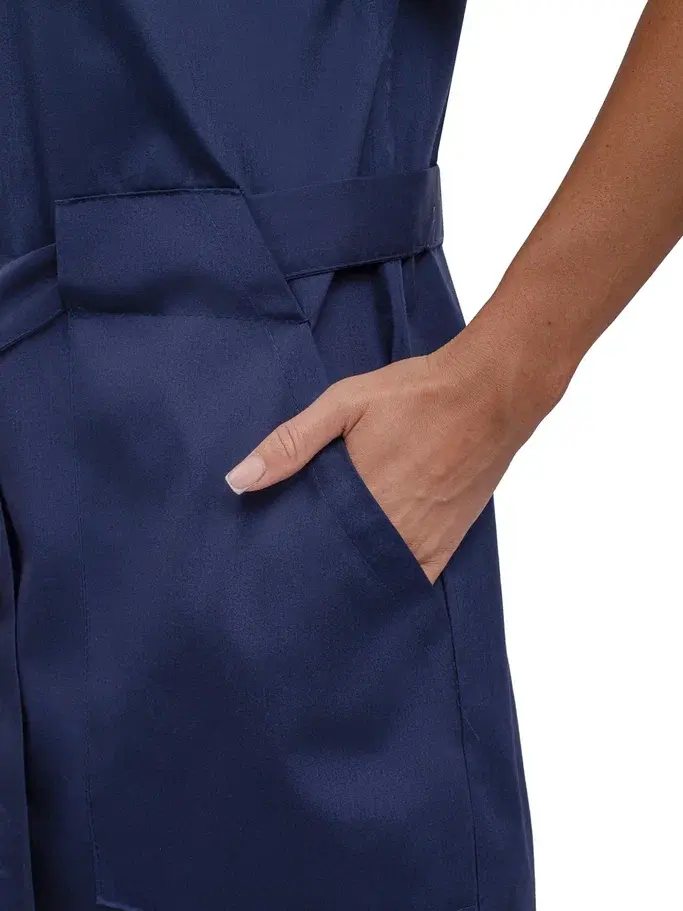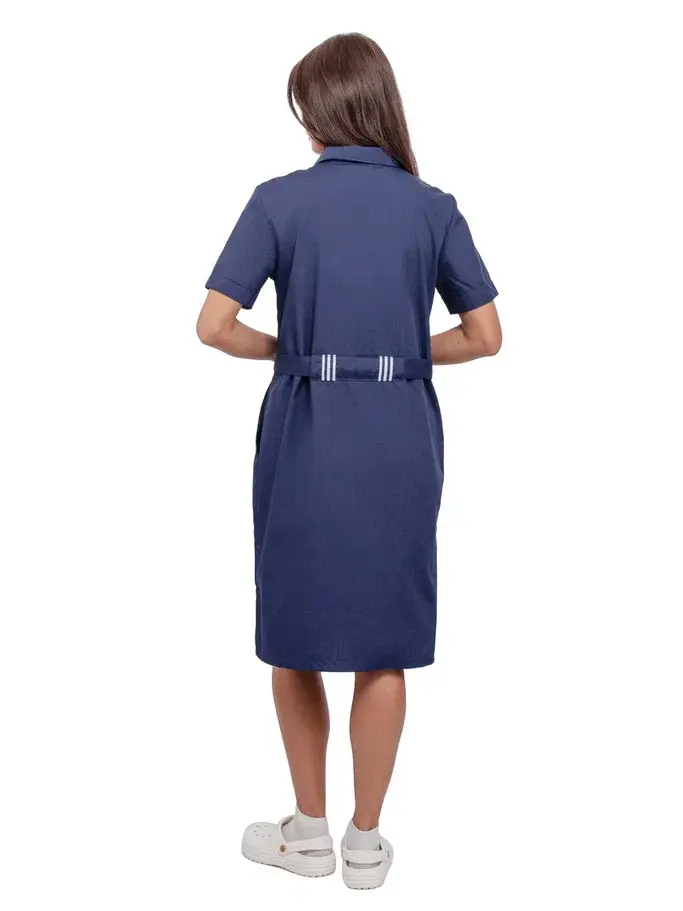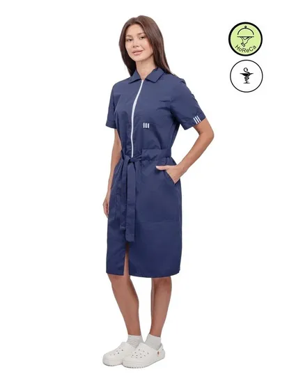 Представляем вашему вниманию женский халат «Эра» в темно-синем цвете — идеальное решение для профессионалов в сфере обслуживания. Этот халат, выполненный из высококачественной смесовой ткани, предлагает уникальное сочетание удобства и защиты. Он идеально подходит для горничных, уборщиц и работников клининговых служб, обеспечивая безупречный внешний вид и защиту от загрязнений.